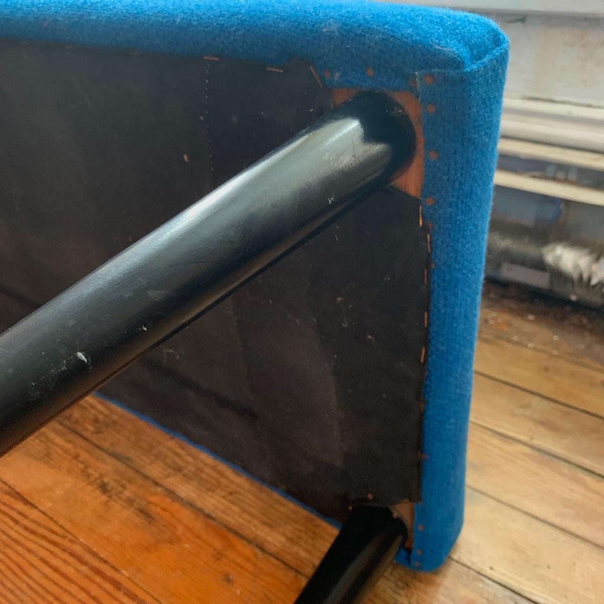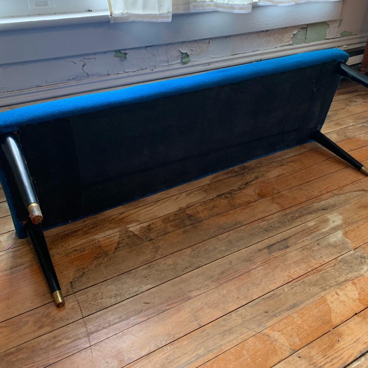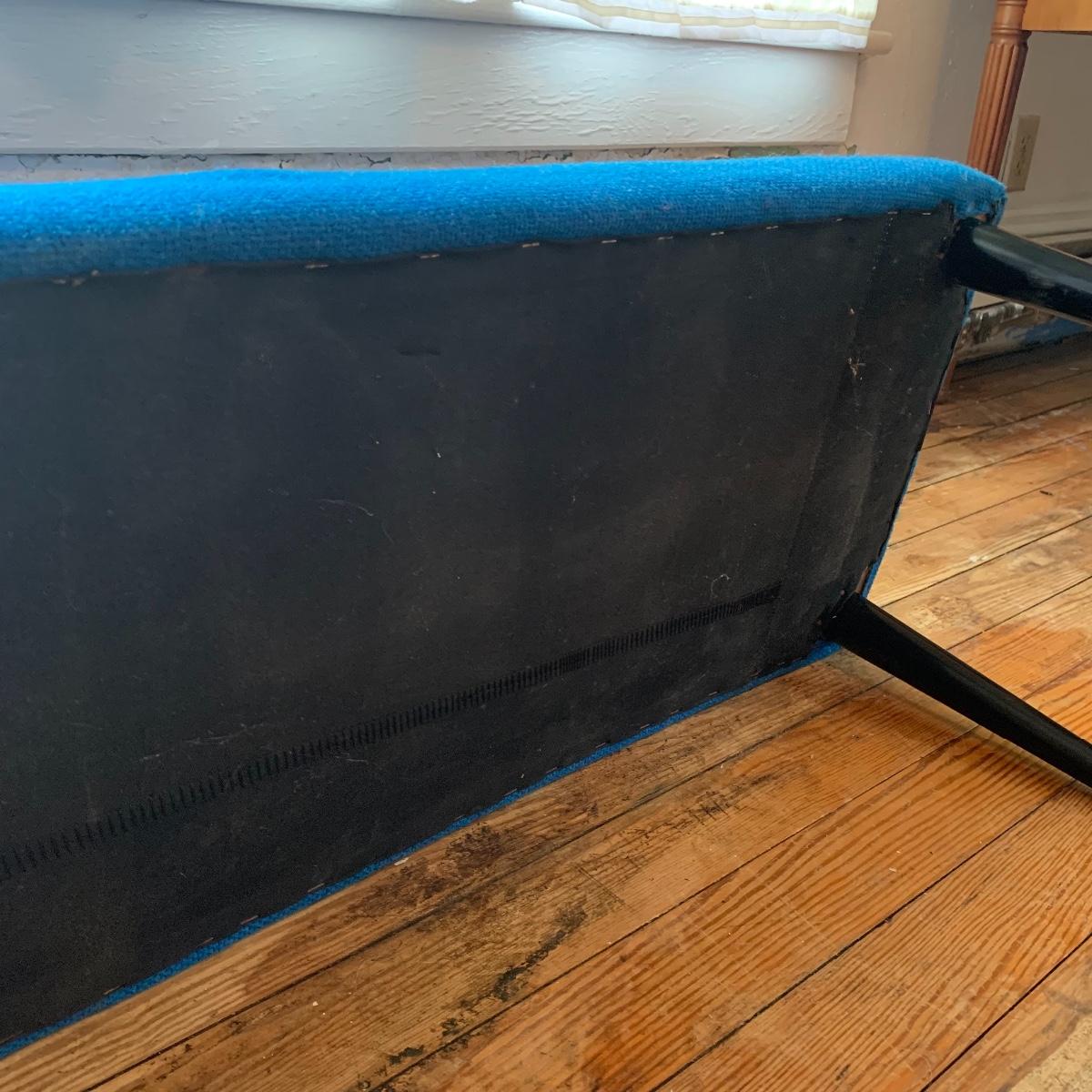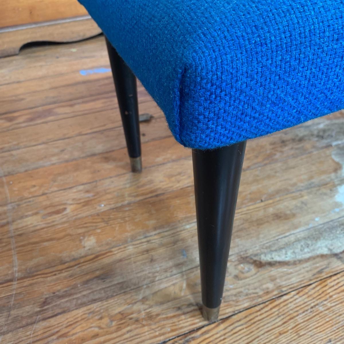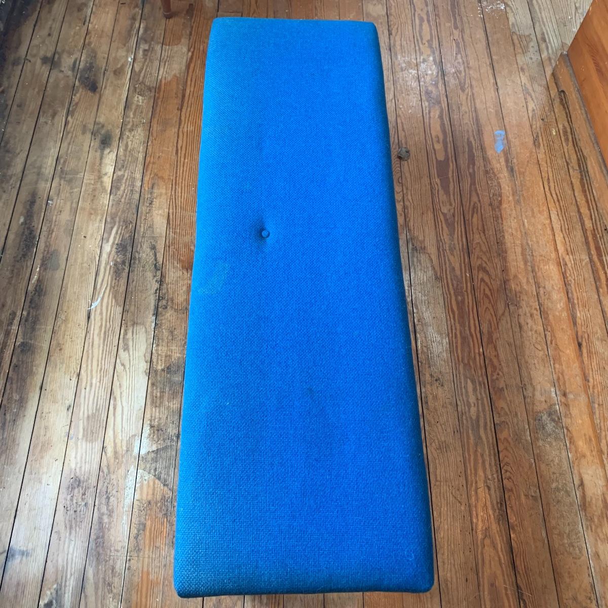 This lot is an upholstered cushioned blue bench. It stands on four painted wooden legs. The legs are slightly loose, but the bench feels sturdy when sat on. There is a small stain on the bench that appears cleanable. It measures 51.5” x 17” x 15.5”. It is quite lightweight. Local Pickup Only