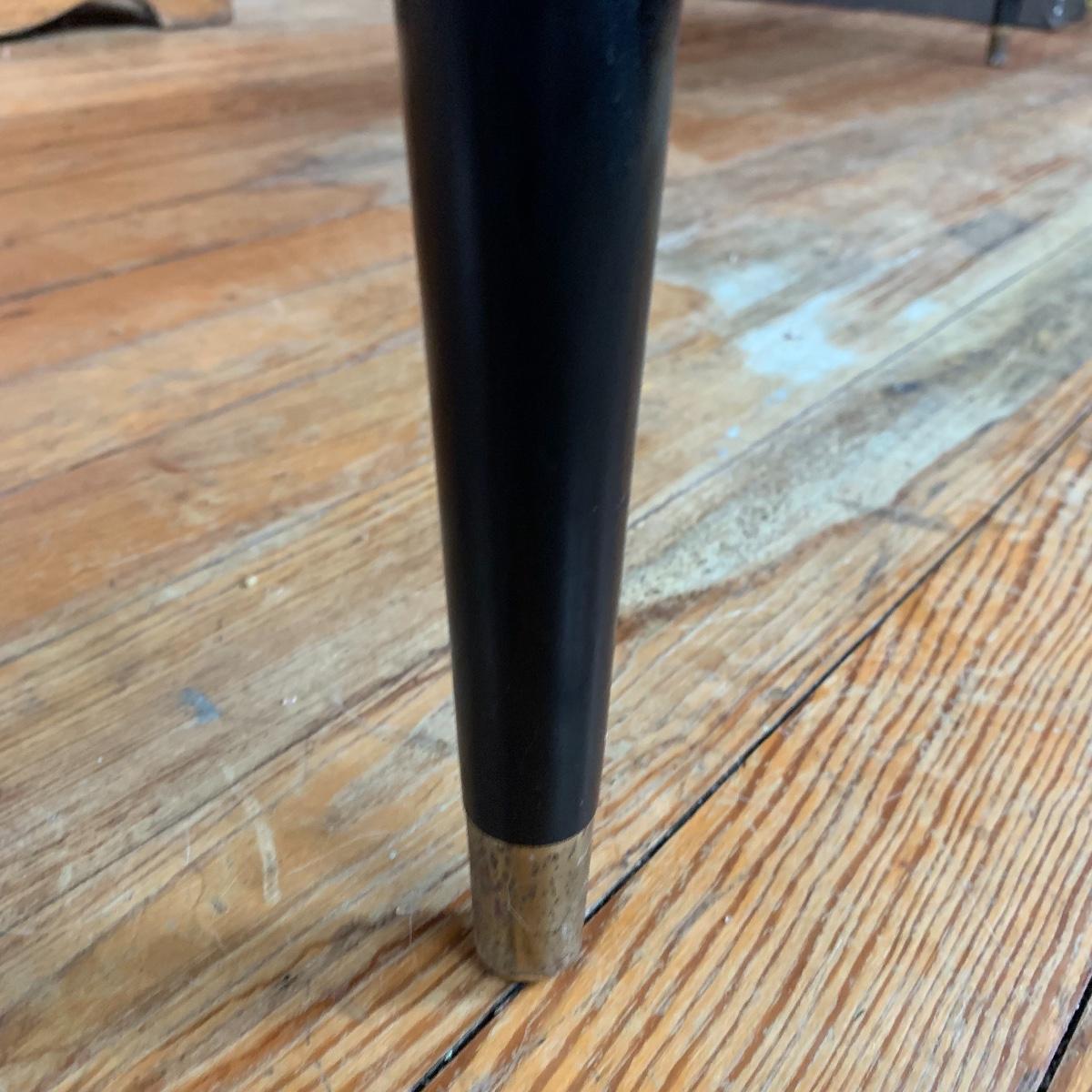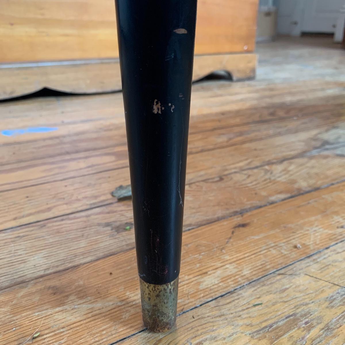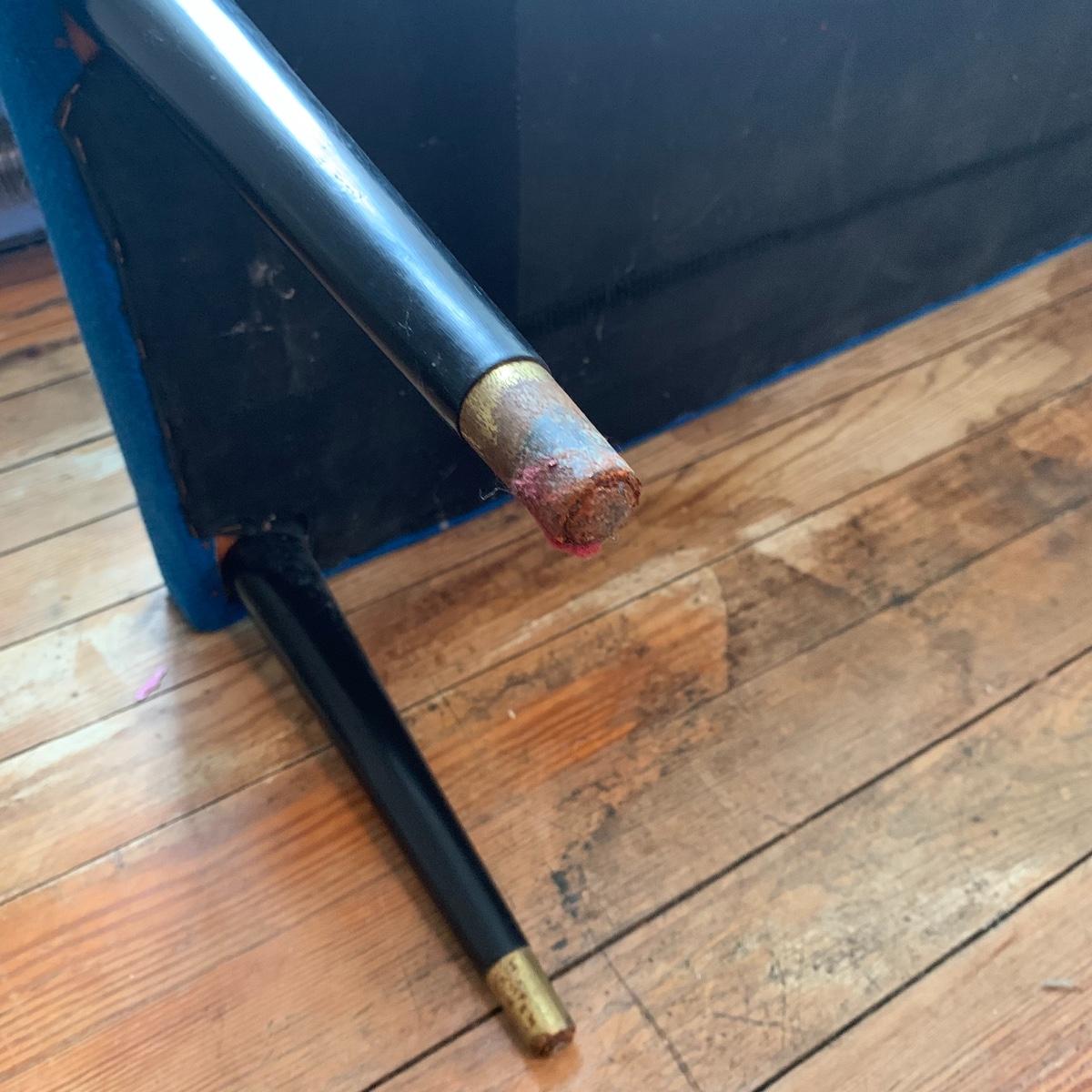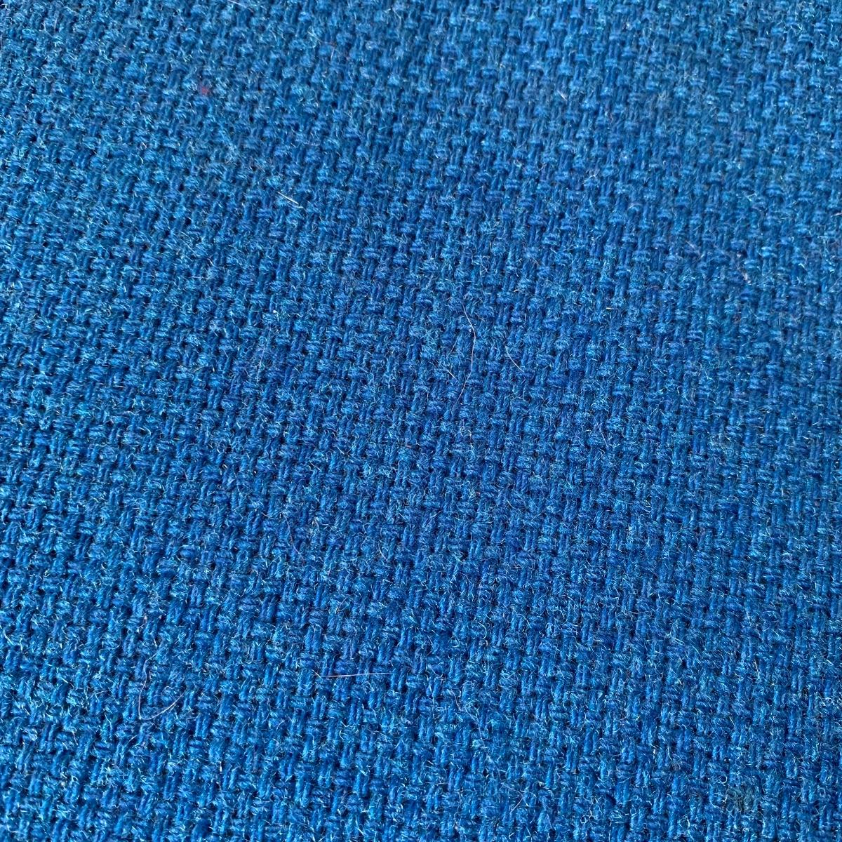 This lot is an upholstered cushioned blue bench. It stands on four painted wooden legs. The legs are slightly loose, but the bench feels sturdy when sat on. There is a small stain on the bench that appears cleanable. It measures 51.5” x 17” x 15.5”. It is quite lightweight. Local Pickup Only