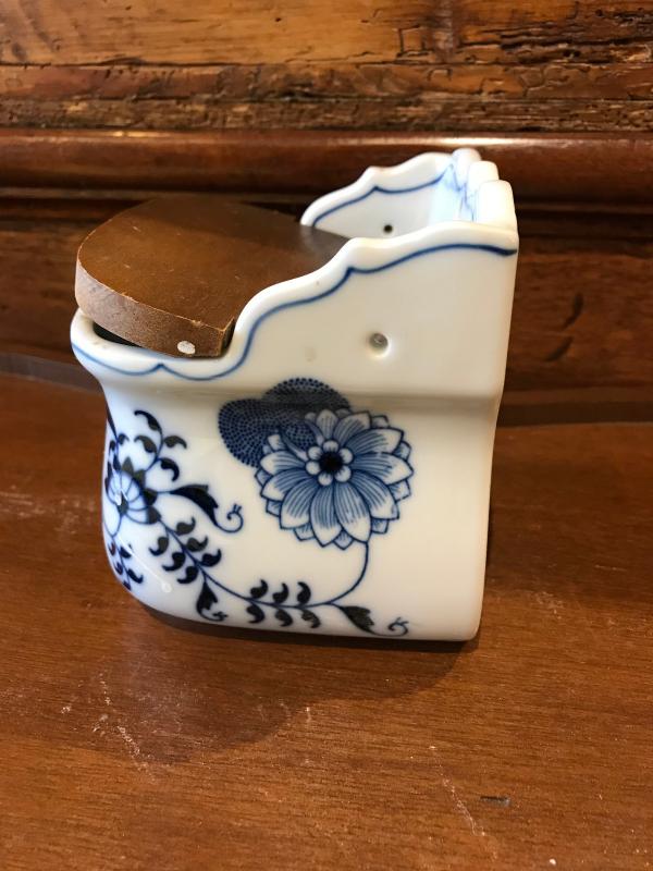 Very nice wall hung porcelain salt box in the Blue Danube pattern. Wood lift lid. Hold in back to hang. 5" x 4 1/2" x 4 1/2" H Great condition.