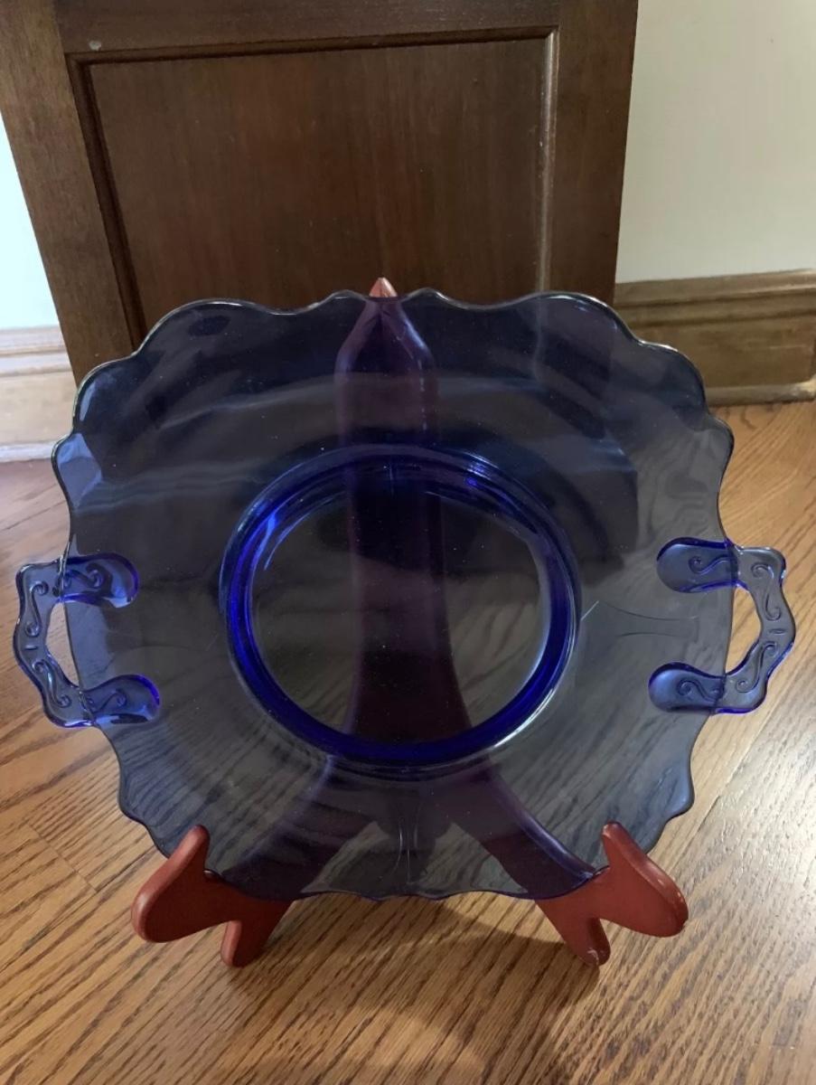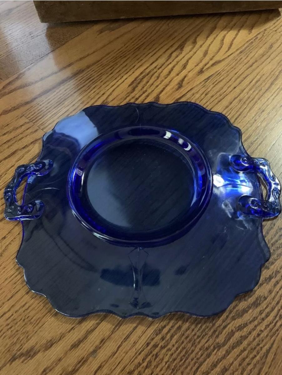 Mt. Pleasant cobalt blue Depression-Glass Plate 2 Handles L E Smith Vintage
