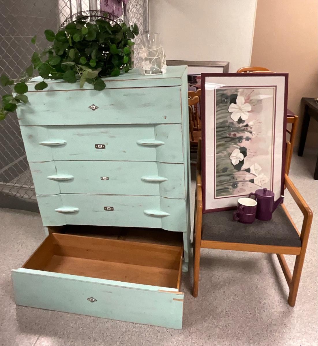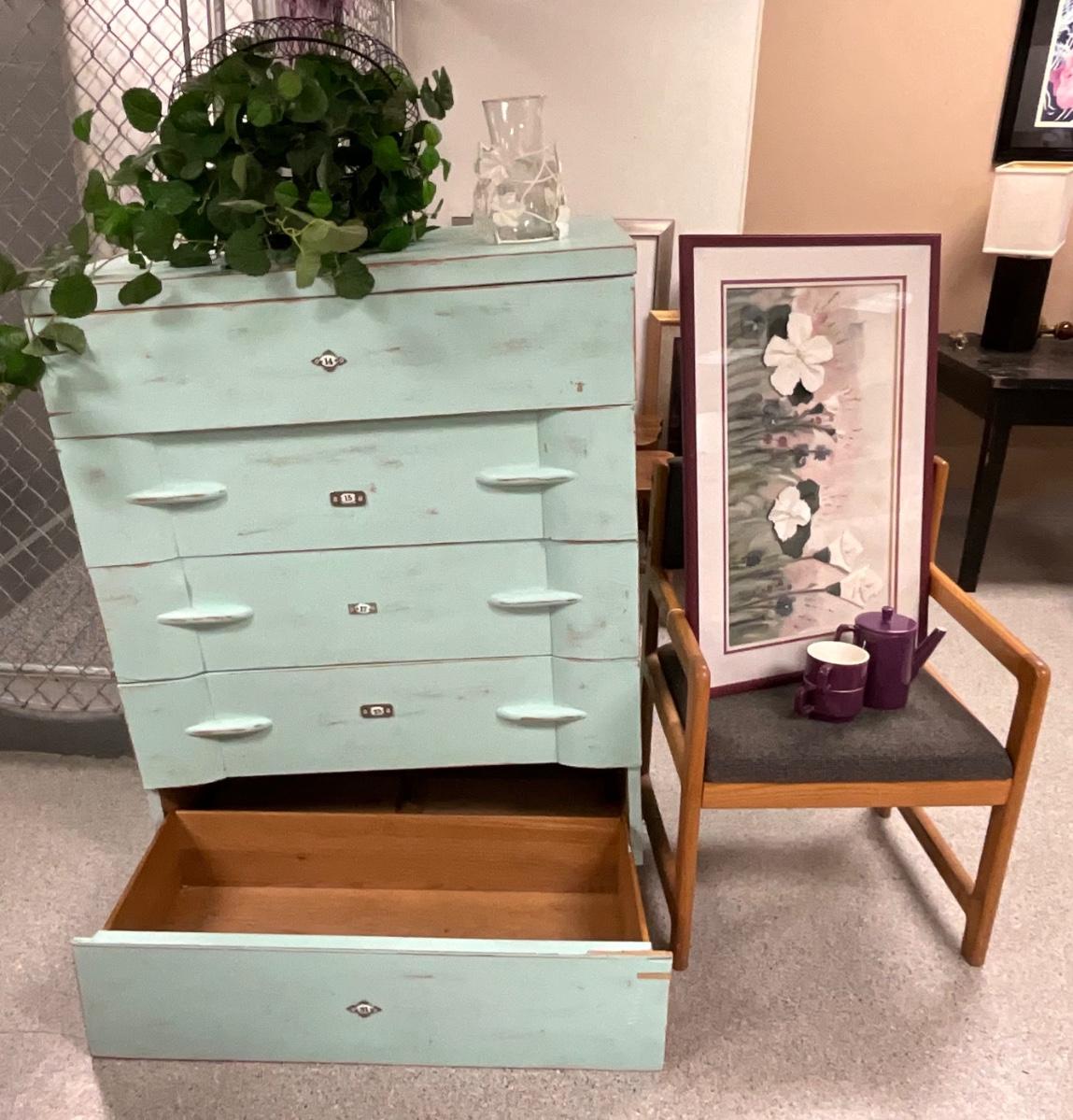Aqua dresser, broken on the bottom. Was featured on the TV show flea market flip. 36’’ x 48’’. Comes with chair, picture, purple teapot and mugs, and 2 decor items