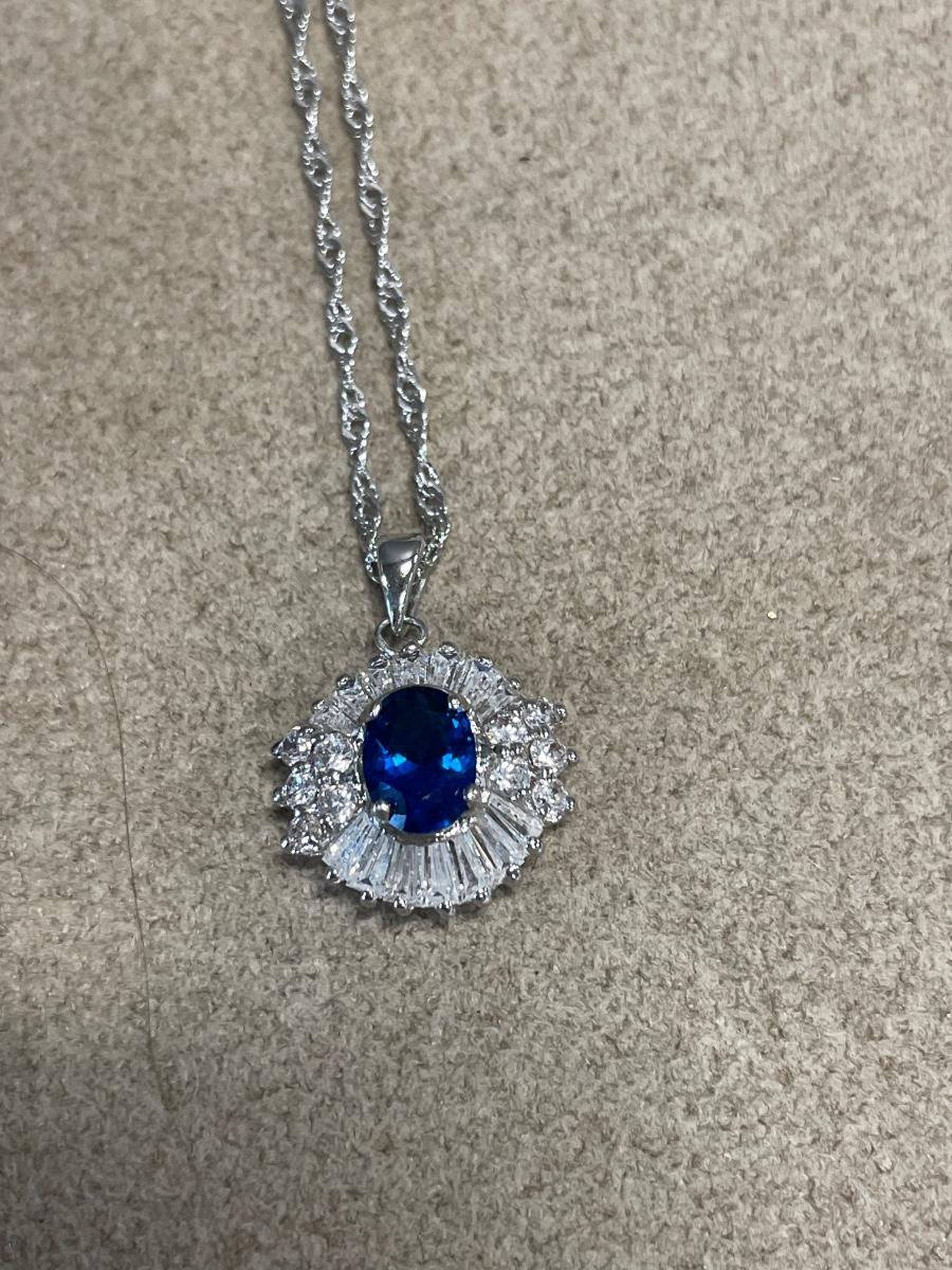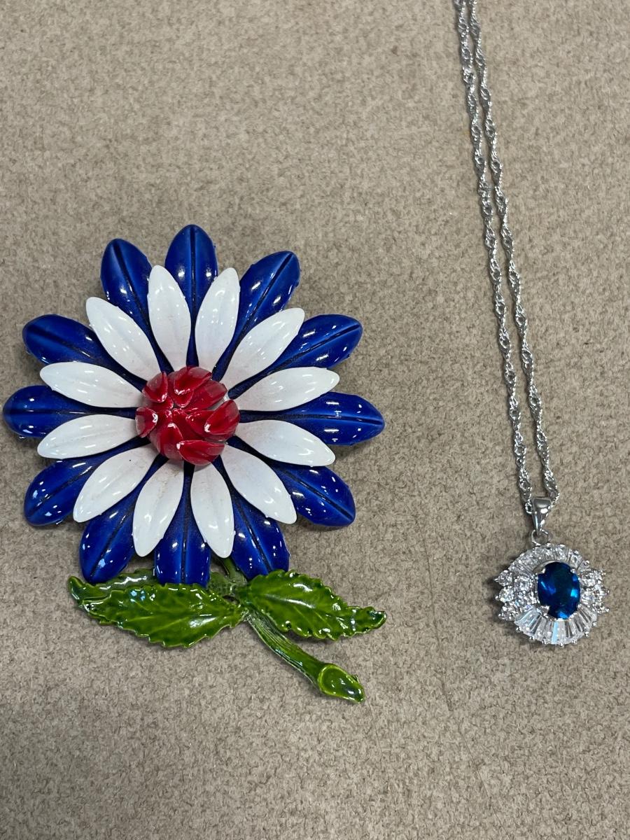 Blue edge enamel pin and blue sparkle necklace