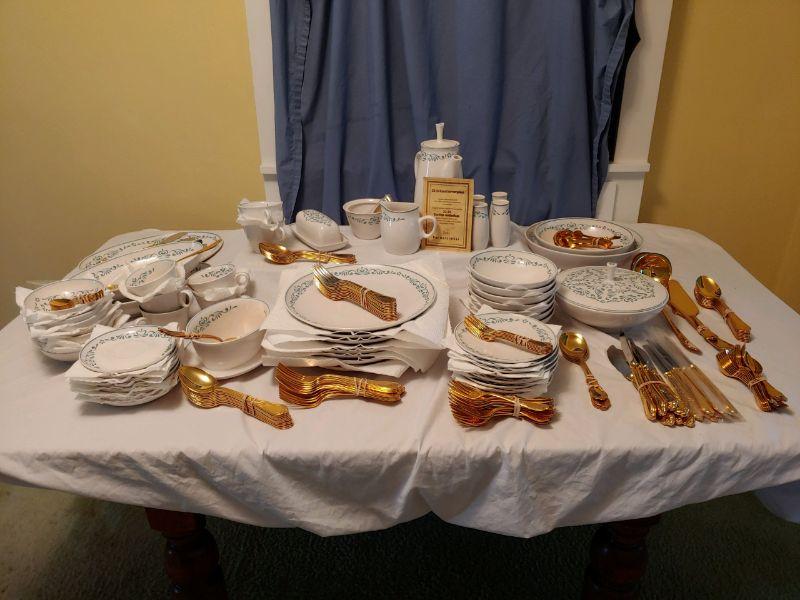 Blue fancy china, Franciscan white stone ware Japan with gold plated cutlery