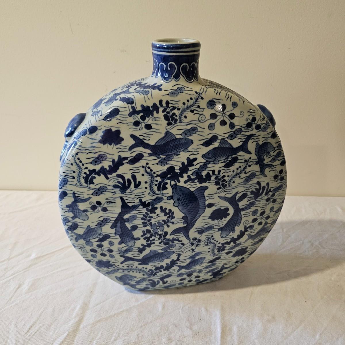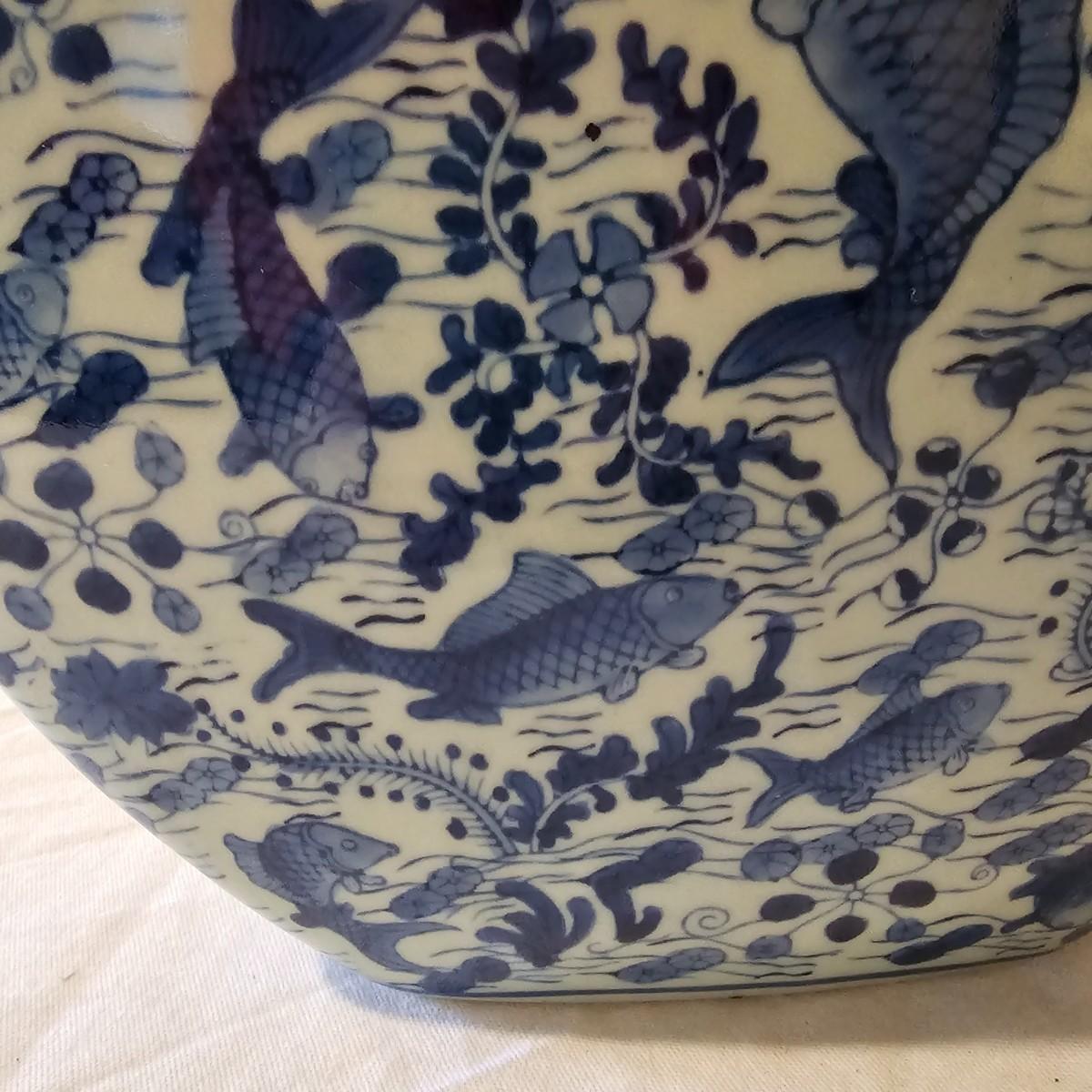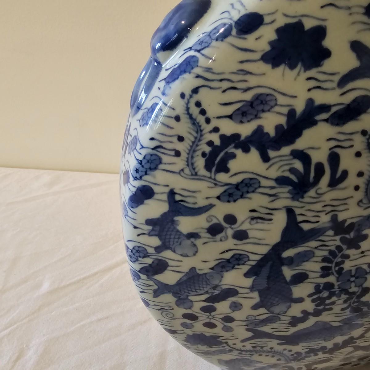 Ovoid shaped pottery vase in blue with fish themed artwork. Vase has suggested handles, open top and measures 12" x 4.25" x 13 5"H. See photos for details. Shipping available.
