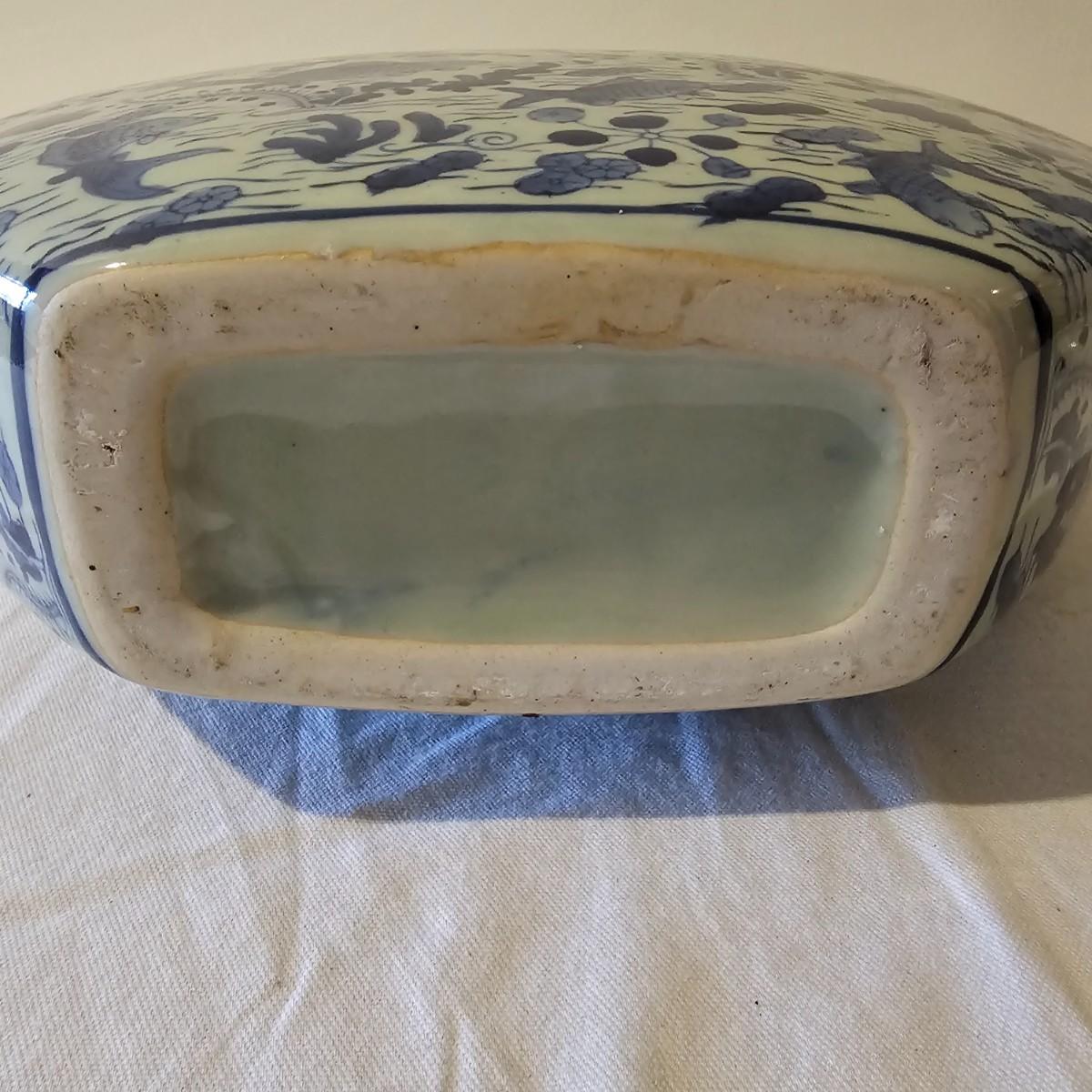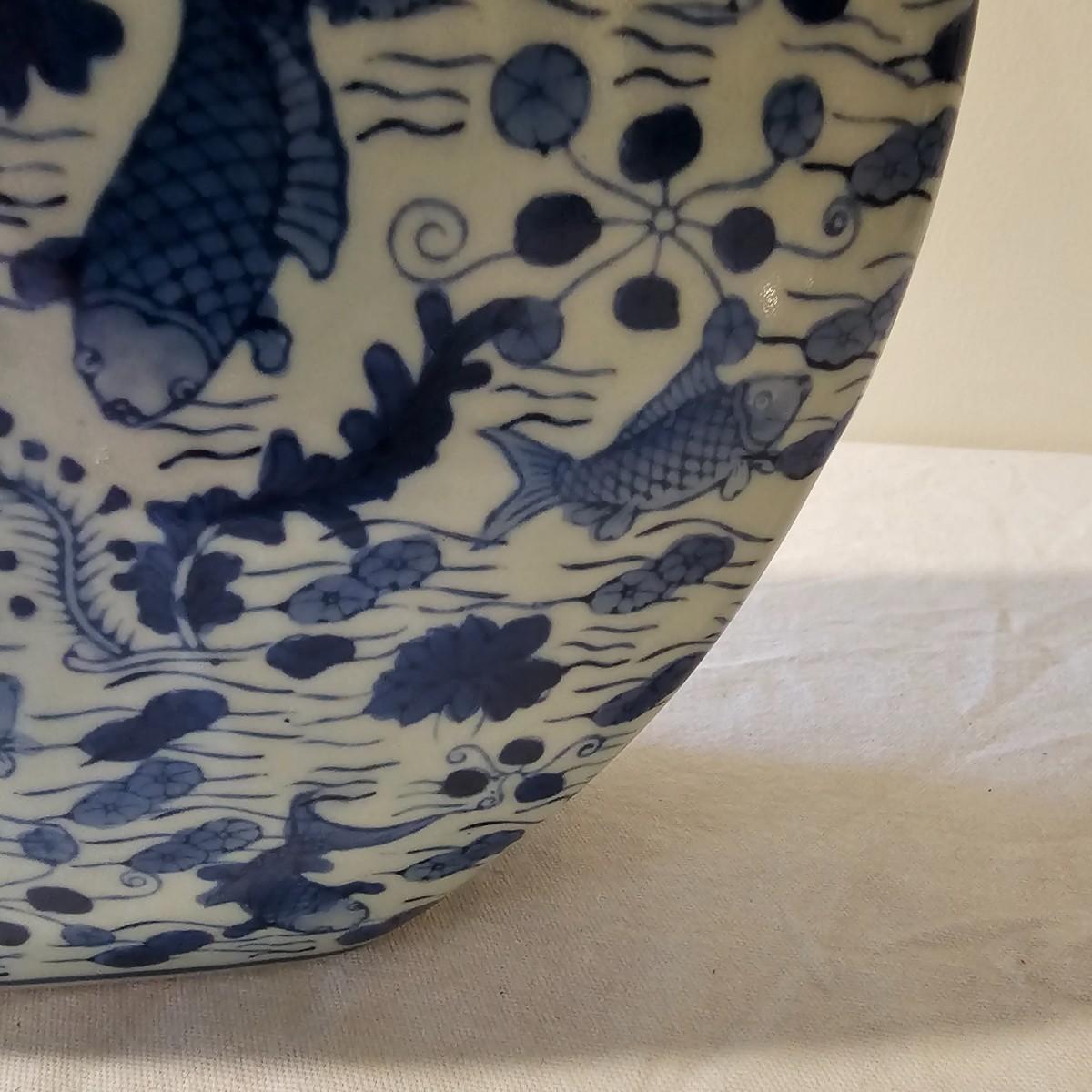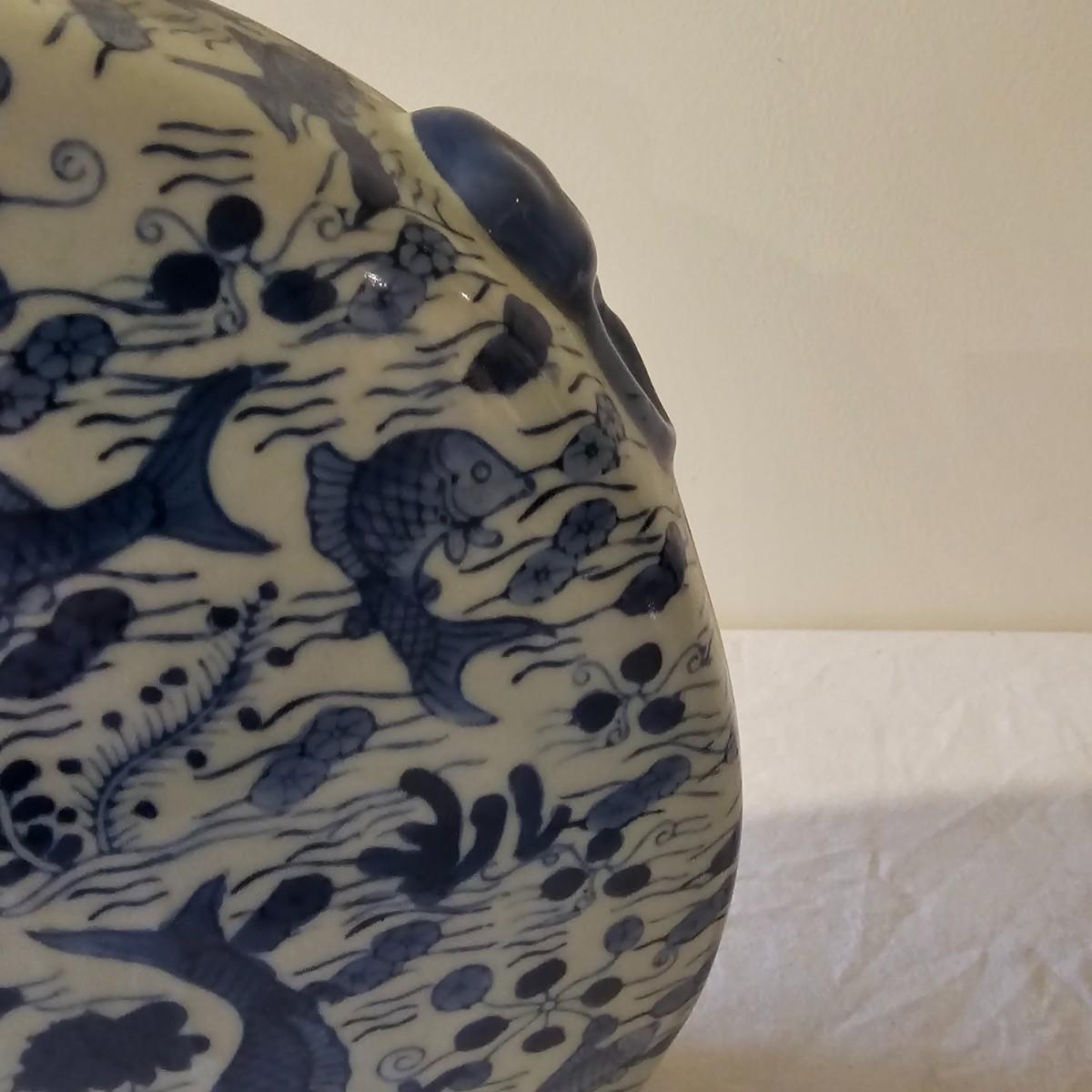 Ovoid shaped pottery vase in blue with fish themed artwork. Vase has suggested handles, open top and measures 12" x 4.25" x 13 5"H. See photos for details. Shipping available.