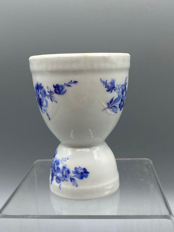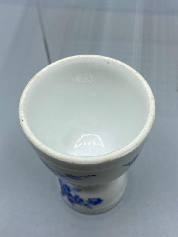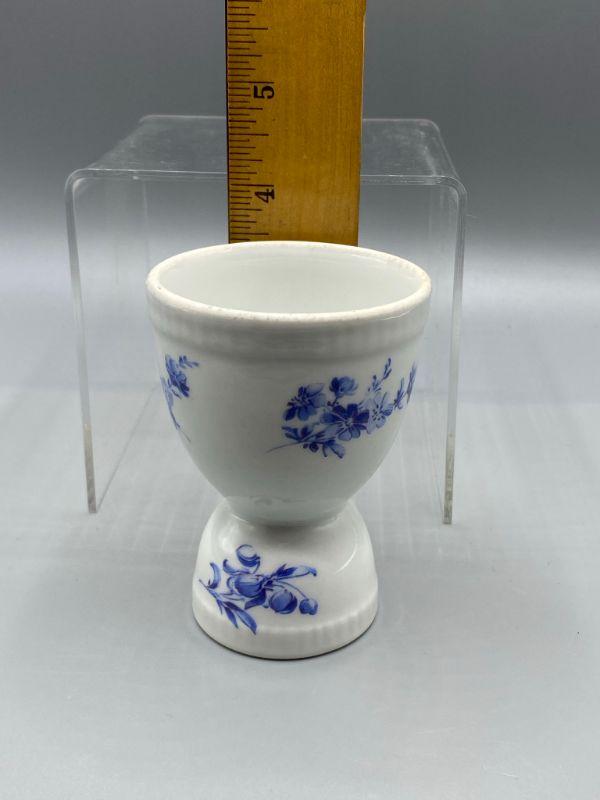 White ceramic egg cup with a blue floral print. Made by cordon Bleu BIA France. Good condition.