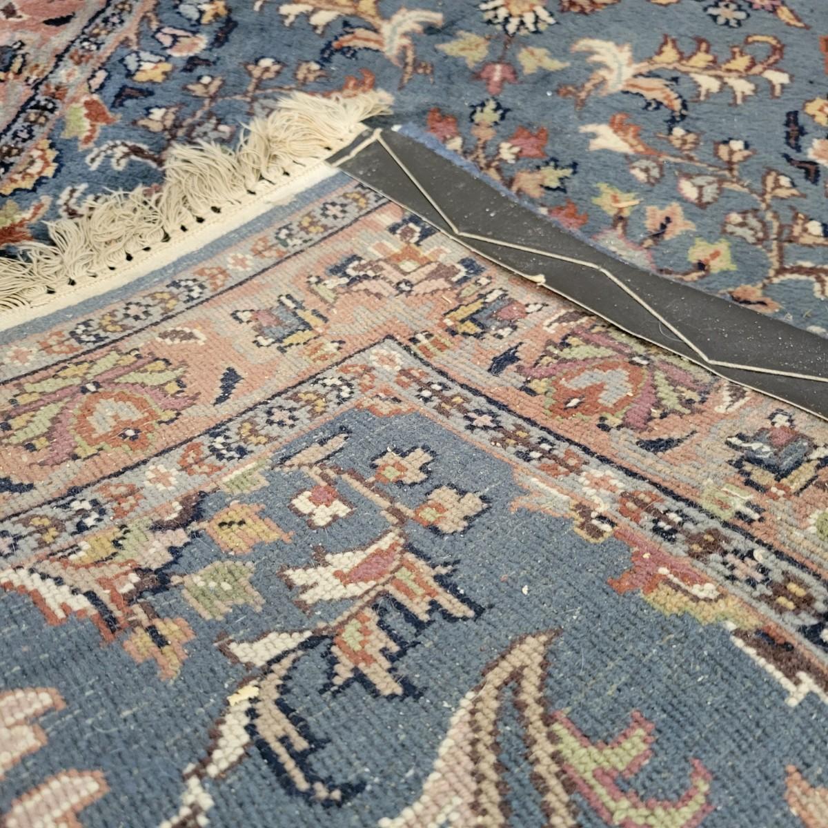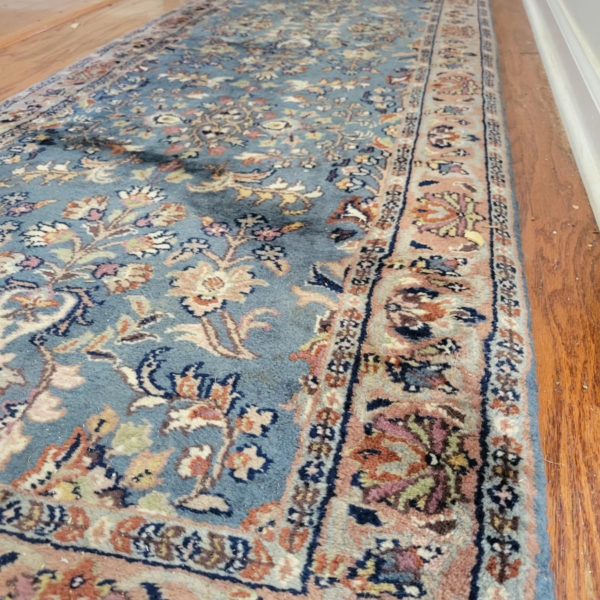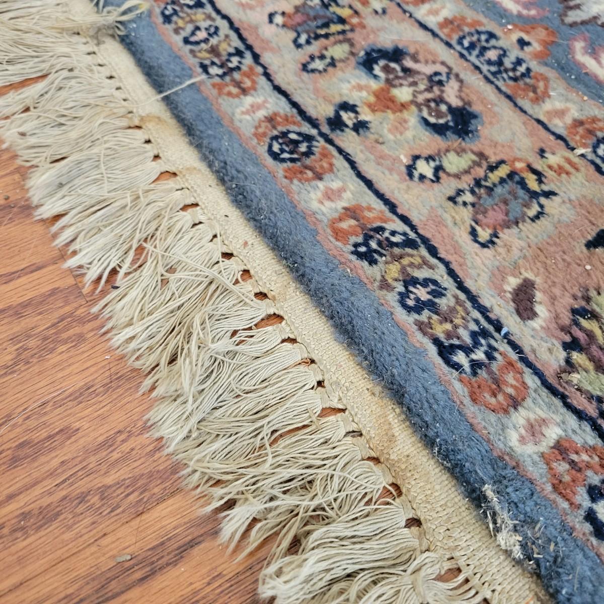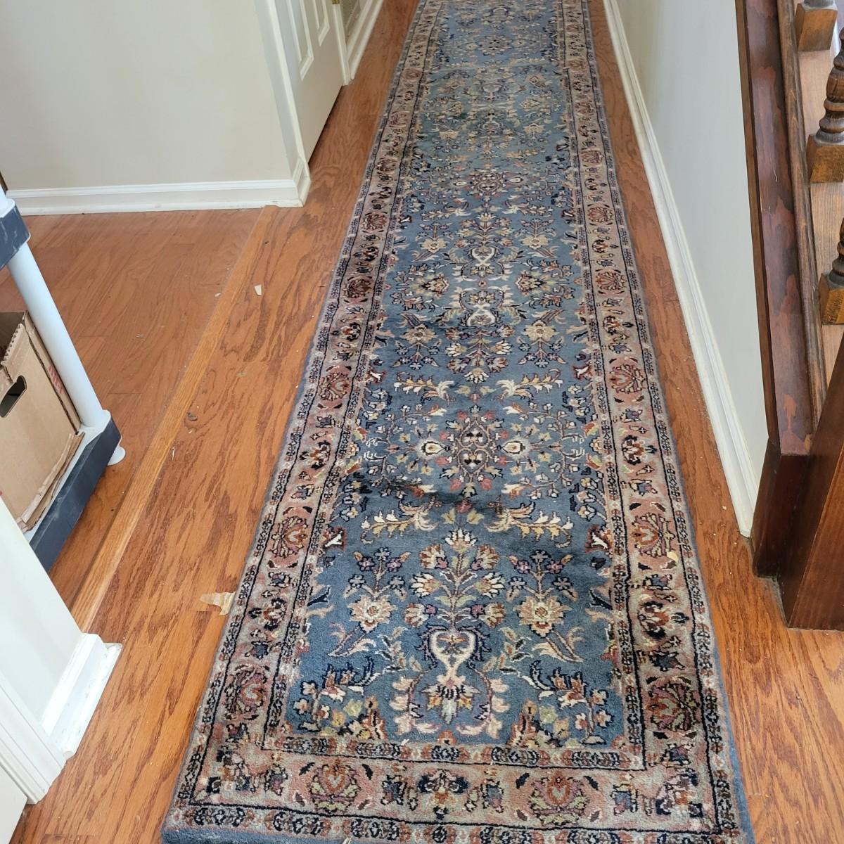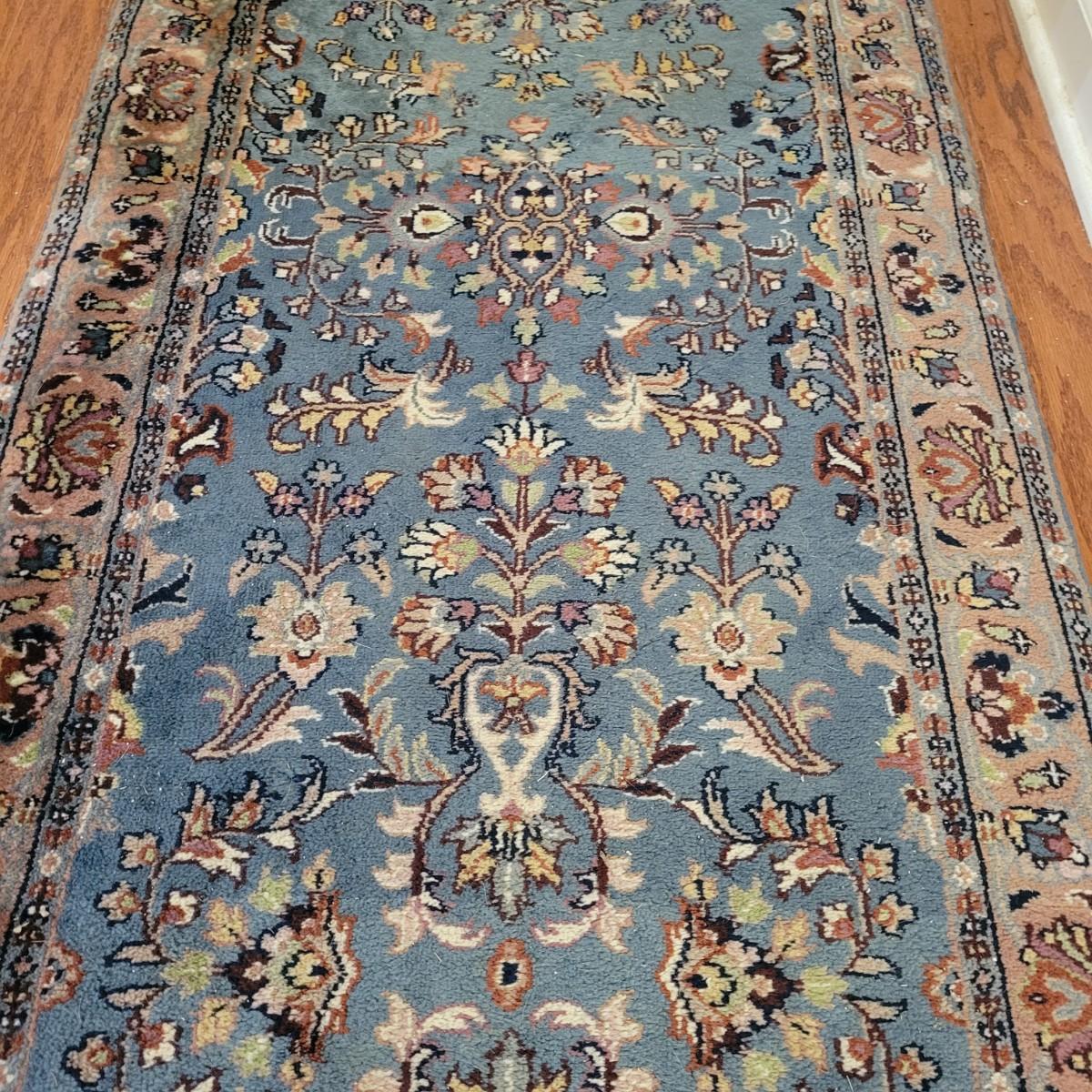 Blue, wool runner rug. Rug has dirty fringe and a few discolorations that could likely be removed with cleaning. Otherwise item is in good condition. This rug features a rich blue color with mauve and cream accents. Measures approximately 29" x 152". Local pickup only