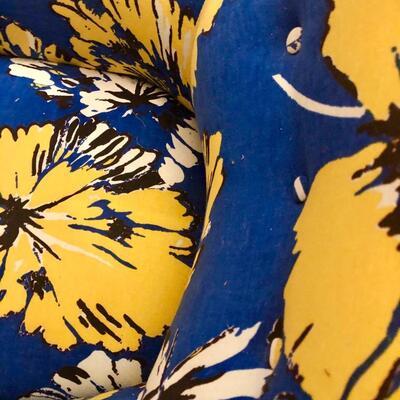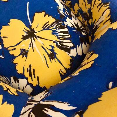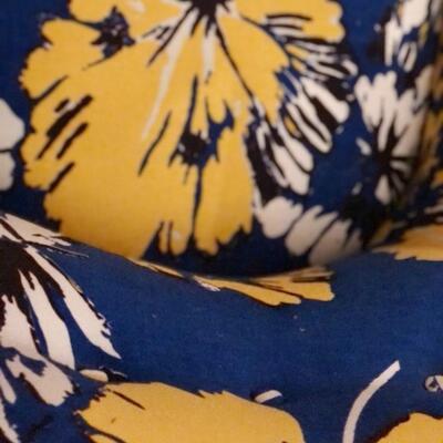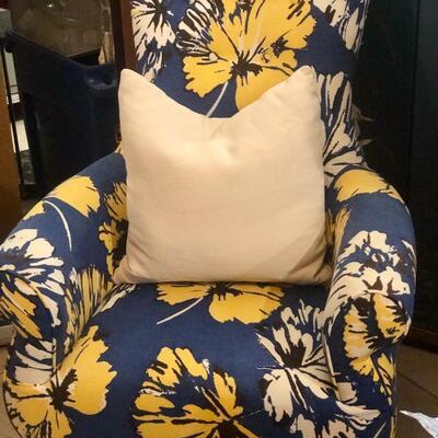 A perfect chair, never used. Pristine condition. The bright blue fabric has bold yellow blossoms printed on sturdy canvas. The chair leans back slightly, designed for a corner.🌼«🌼«🌼(Pillow is not