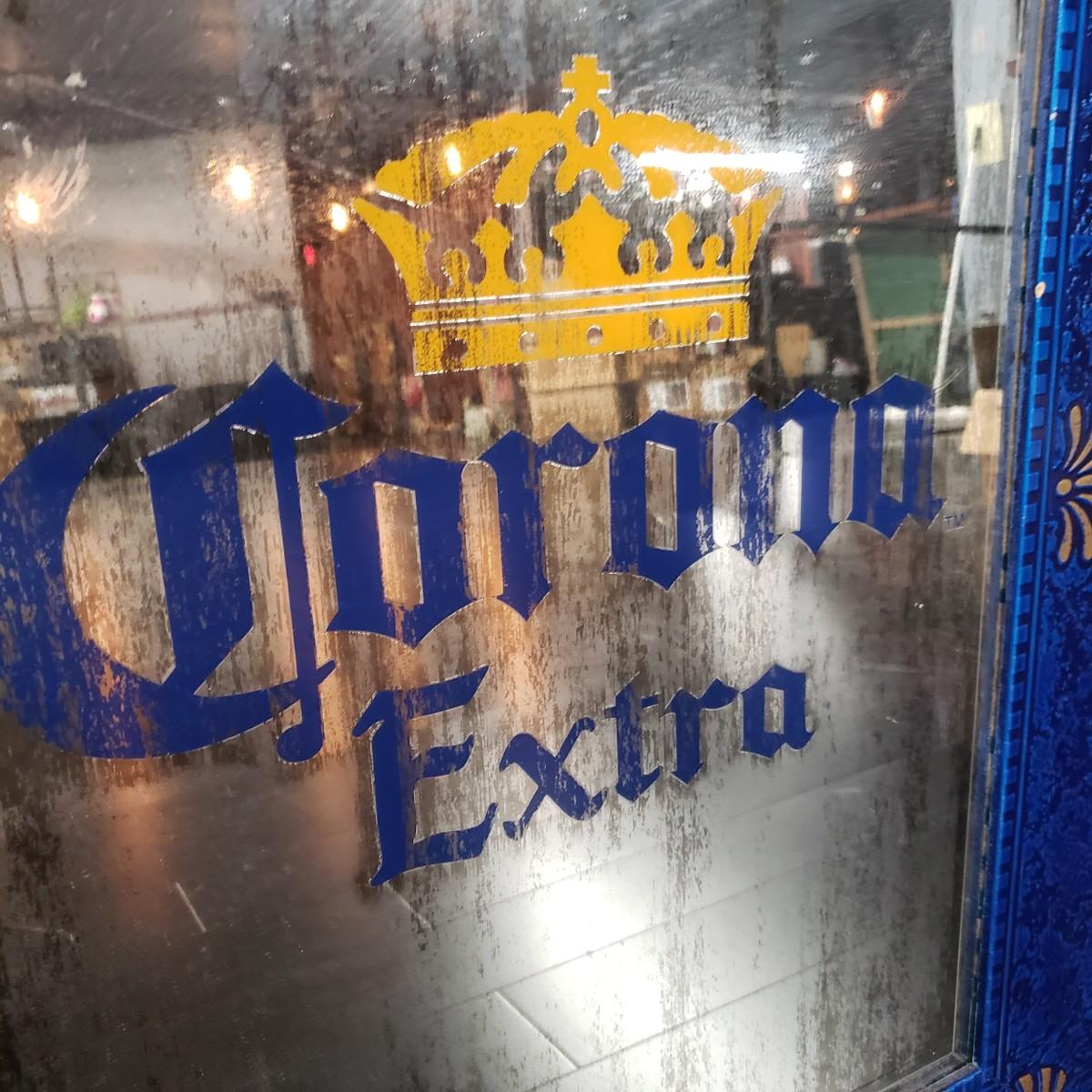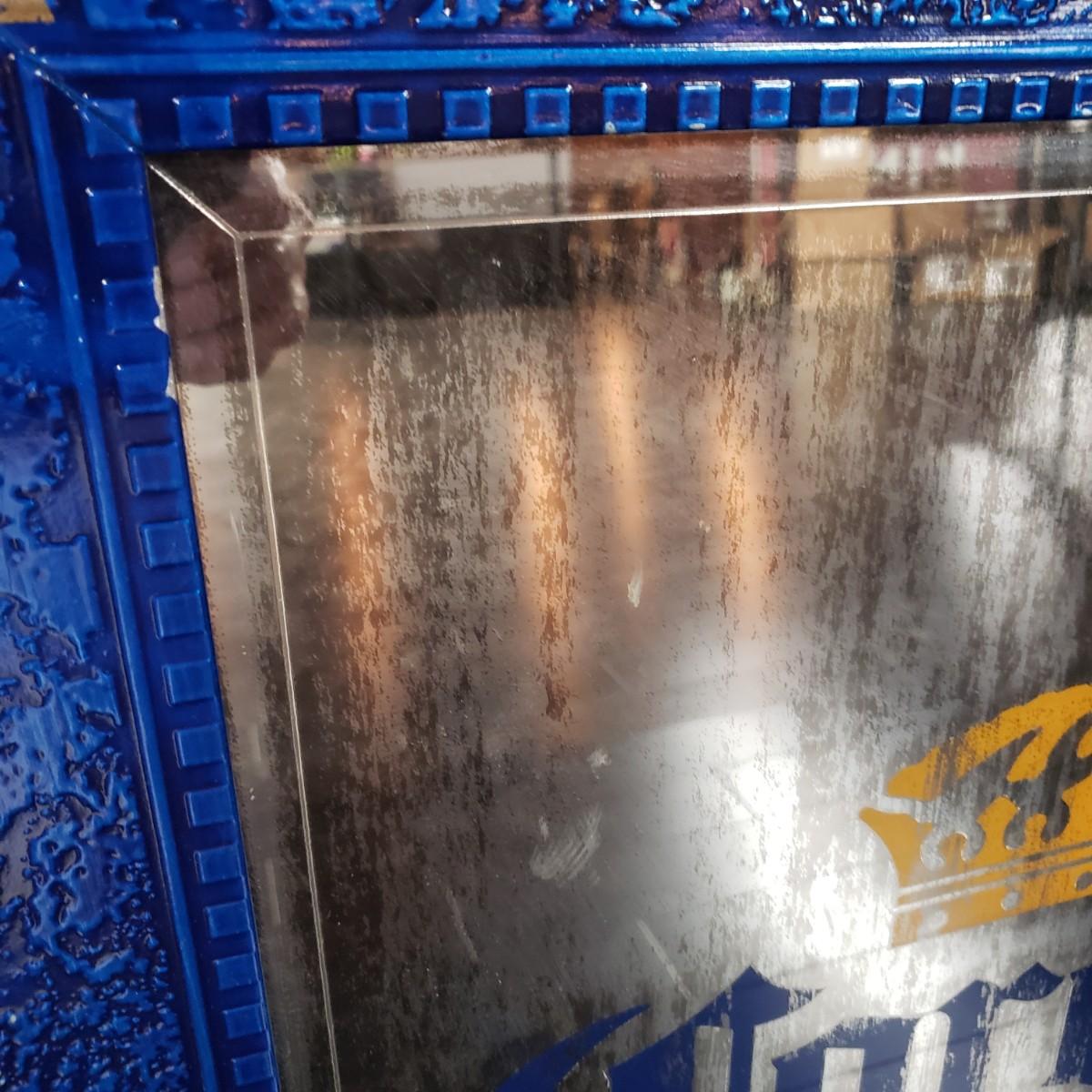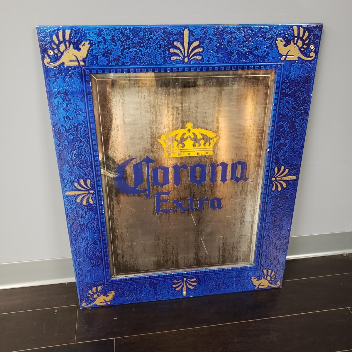 This wooden blue framed Corona Extra mirror measures approximately 26"x1"x32". The blue has a textured quality to it. The mirror has some wear marks on it. There is one drill hole on the bottom of the frame.