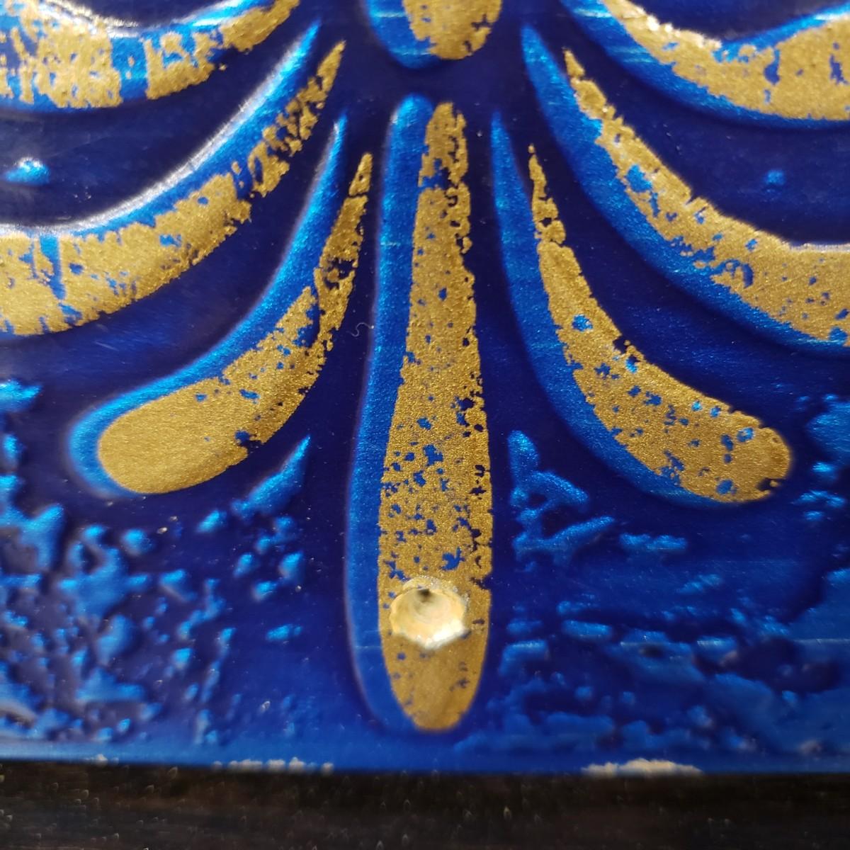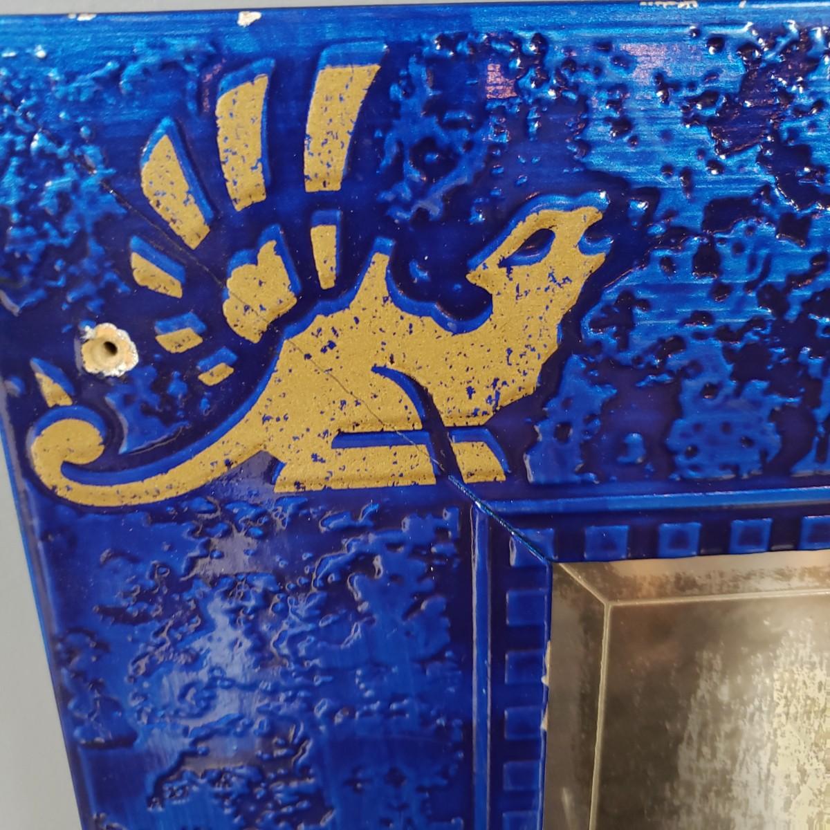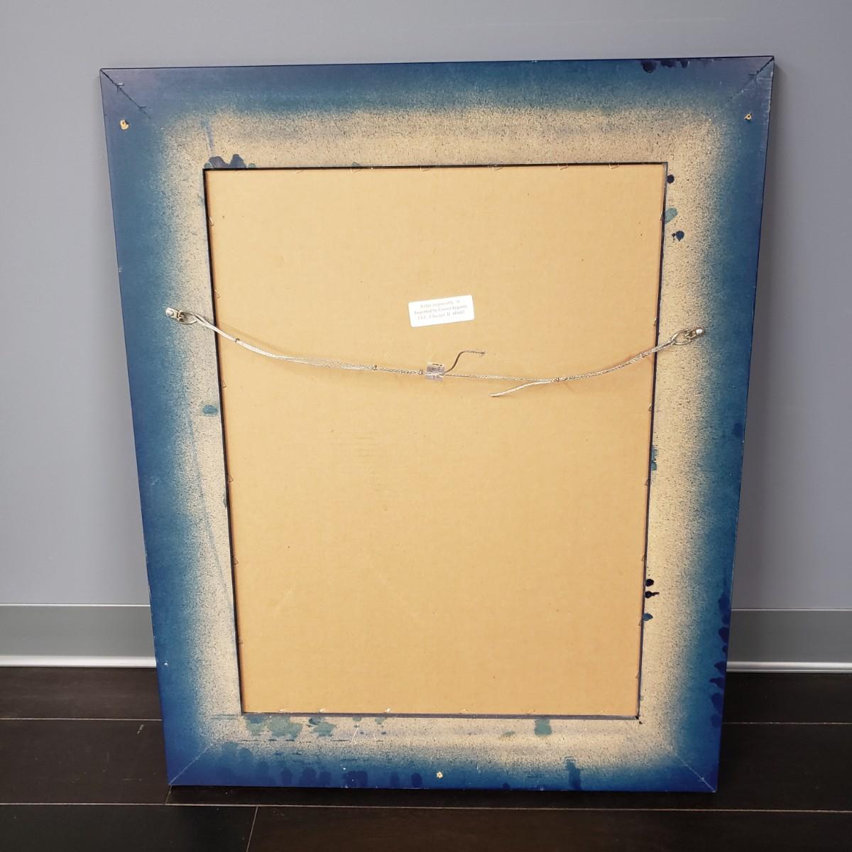 This wooden blue framed Corona Extra mirror measures approximately 26"x1"x32". The blue has a textured quality to it. The mirror has some wear marks on it. There is one drill hole on the bottom of the frame.
