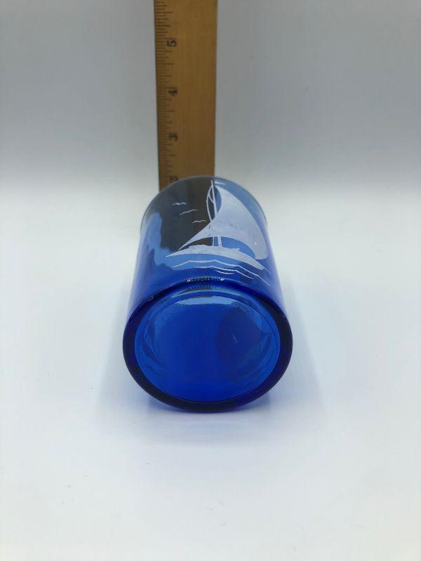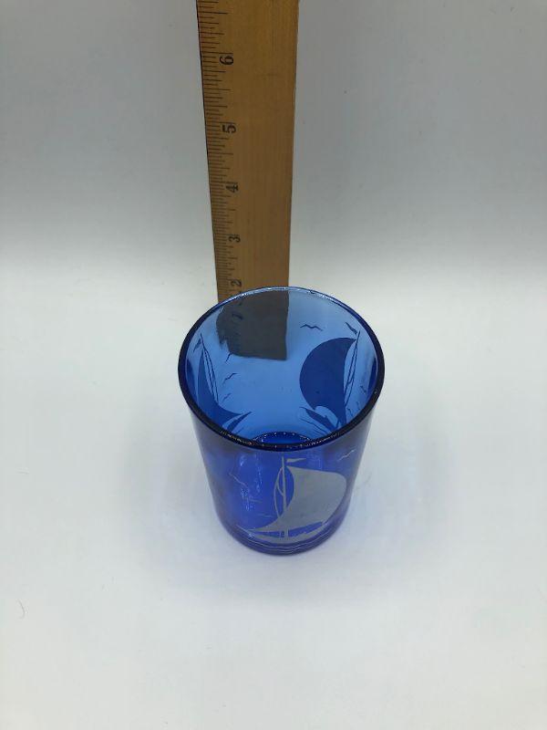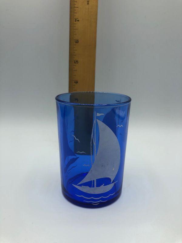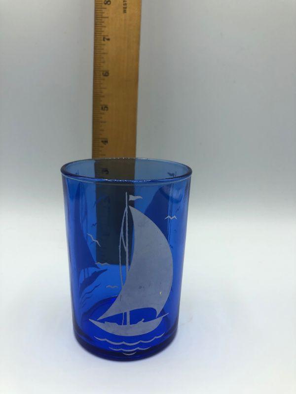 Vintage blue drink glass. Has a frosted/etched sailboat on one side. Good Condition.