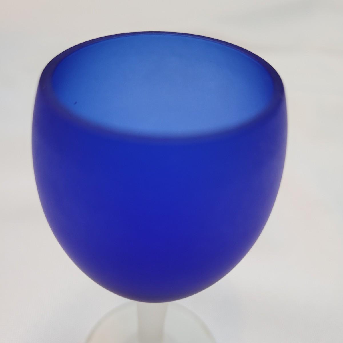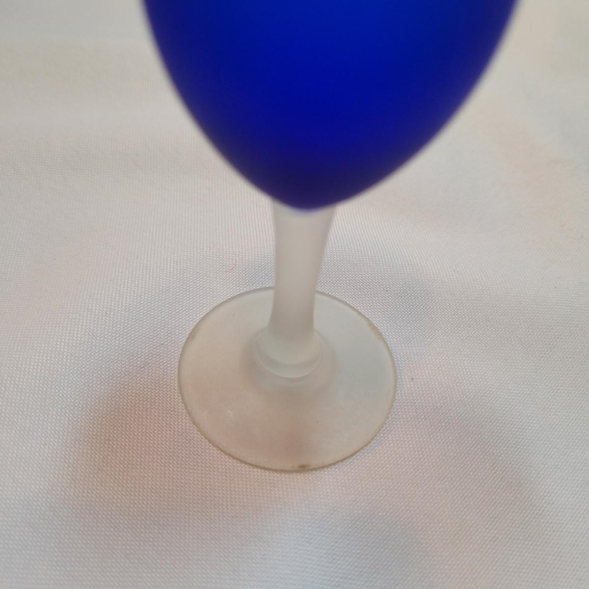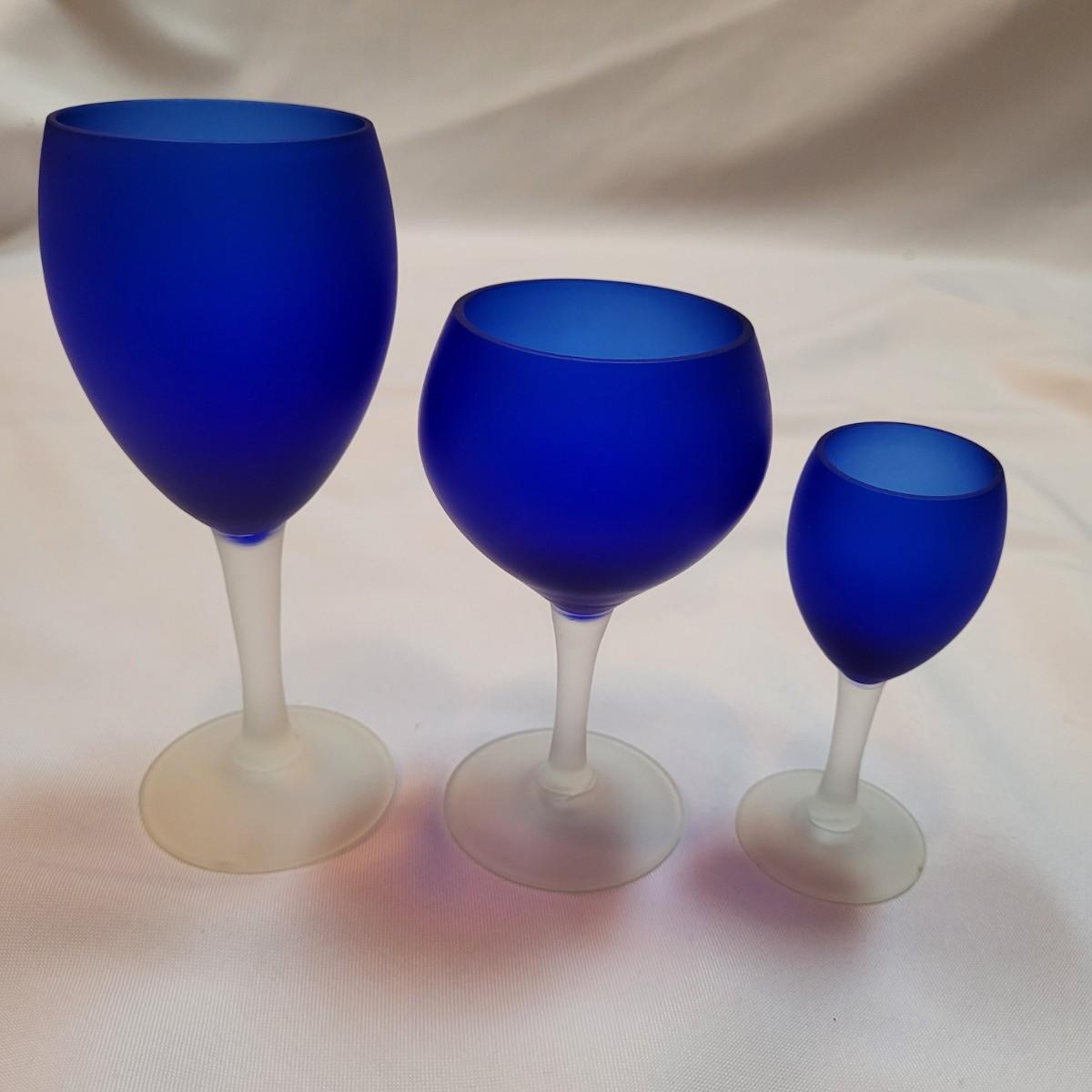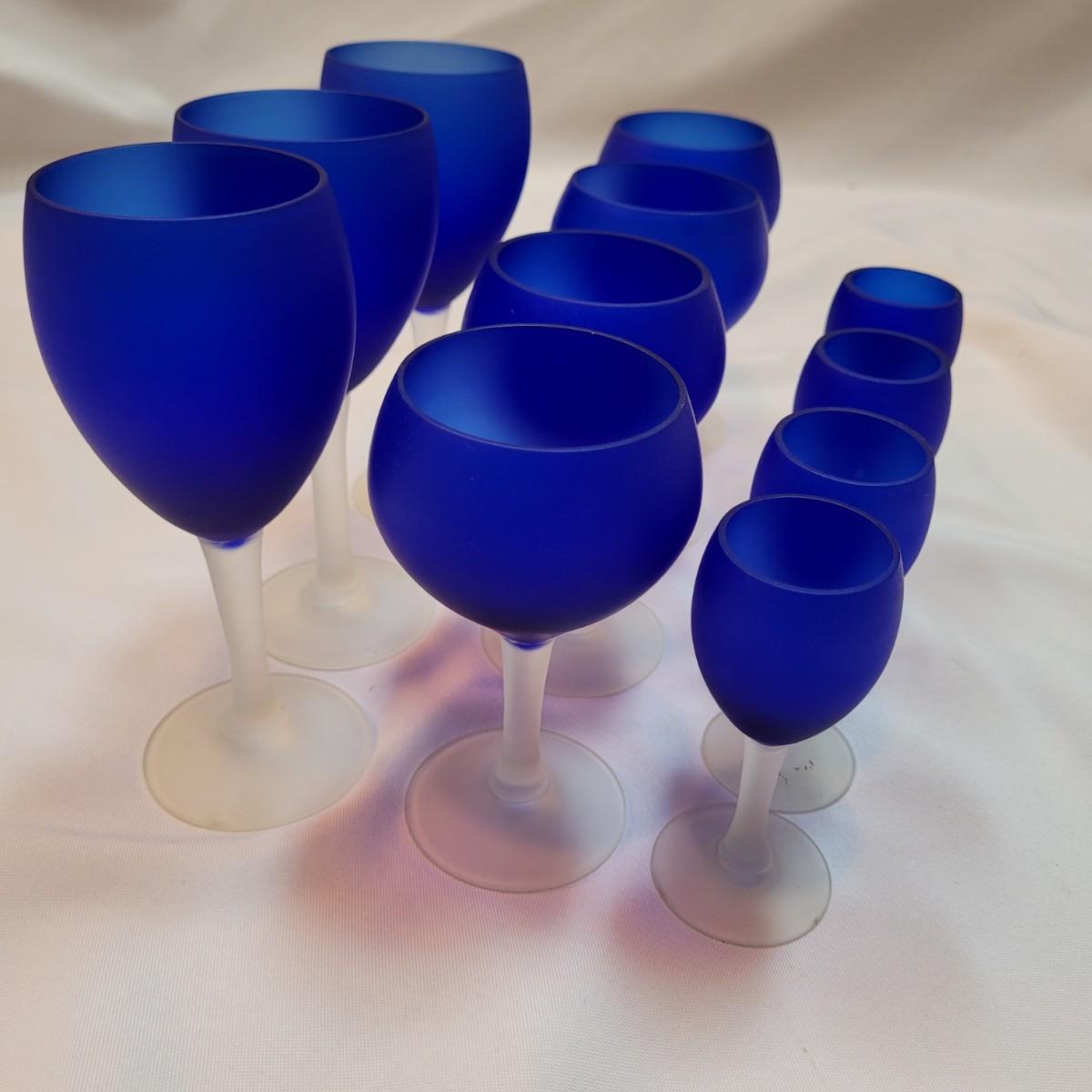 Set of eleven frosted stemware glasses. These glasses feature opaque stems and frosted blue cups. There are three different sizes and shapes. Three large, four medium, and four small cups included. Made from solid glass. The larger of the cups individually measure 2.5"D x 6"H.