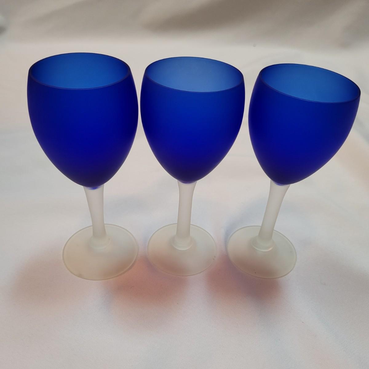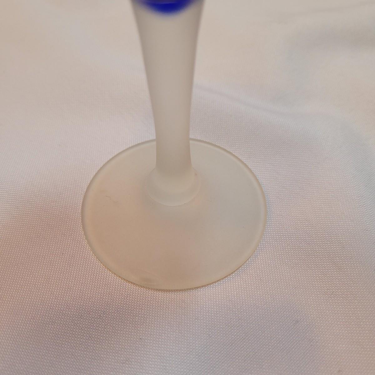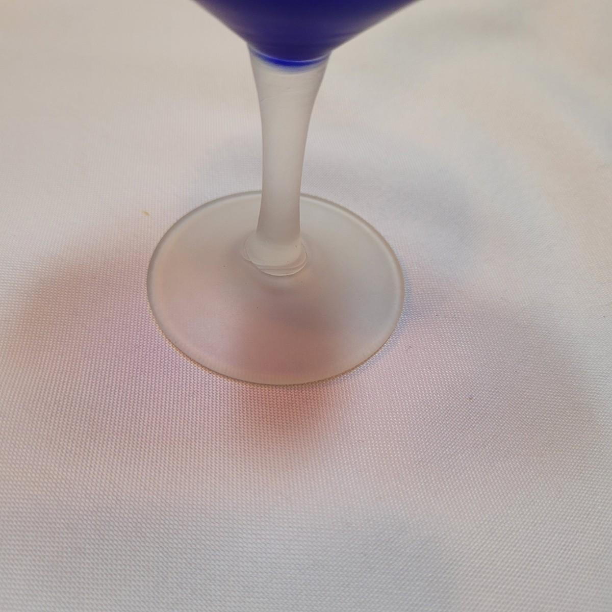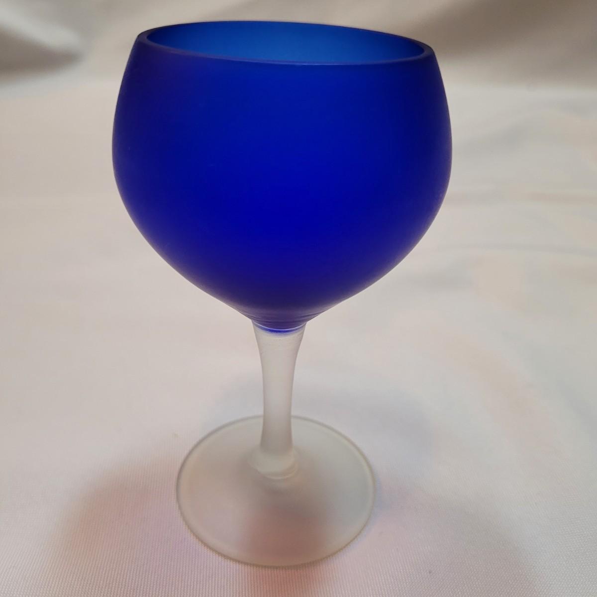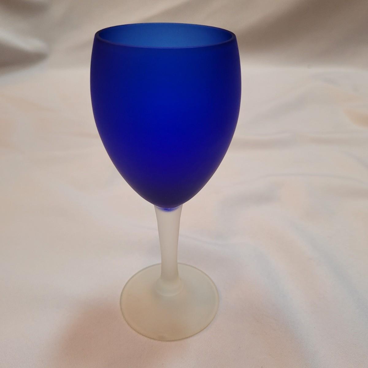 Set of eleven frosted stemware glasses. These glasses feature opaque stems and frosted blue cups. There are three different sizes and shapes. Three large, four medium, and four small cups included. Made from solid glass. The larger of the cups individually measure 2.5"D x 6"H.