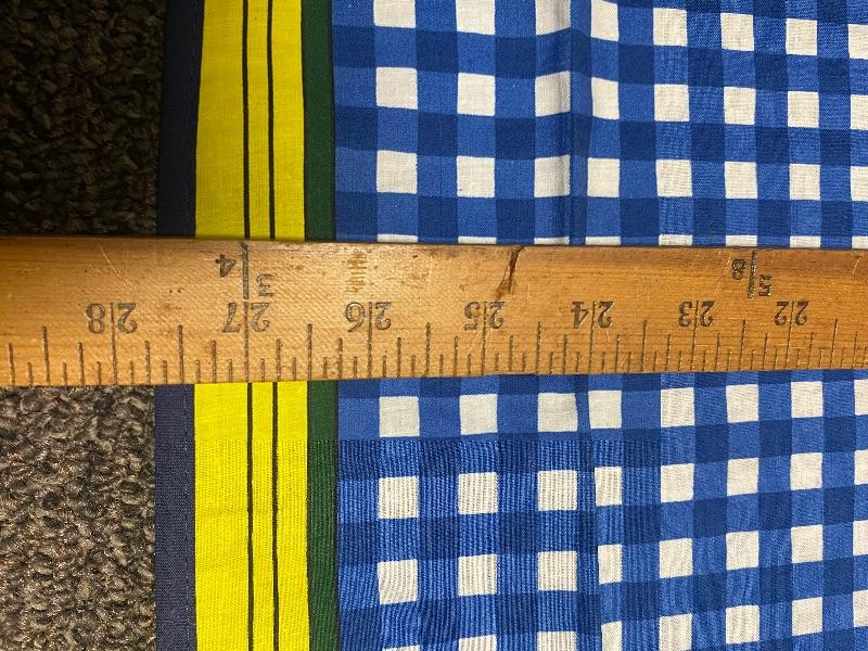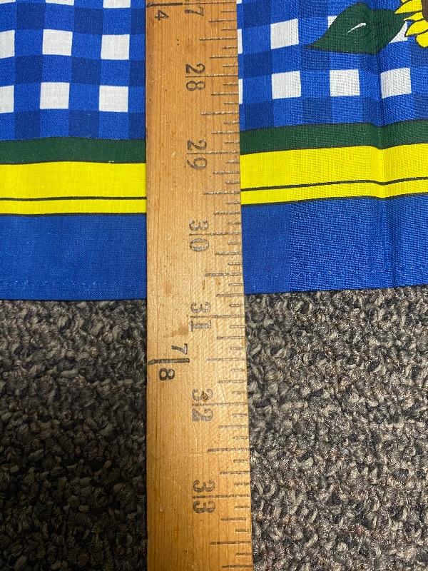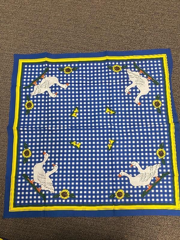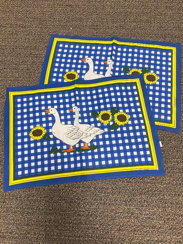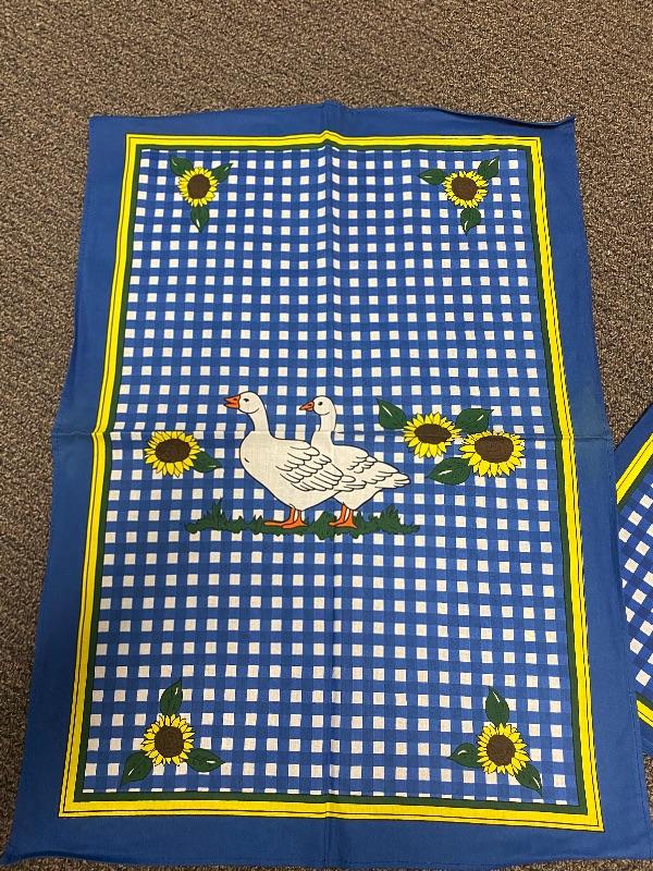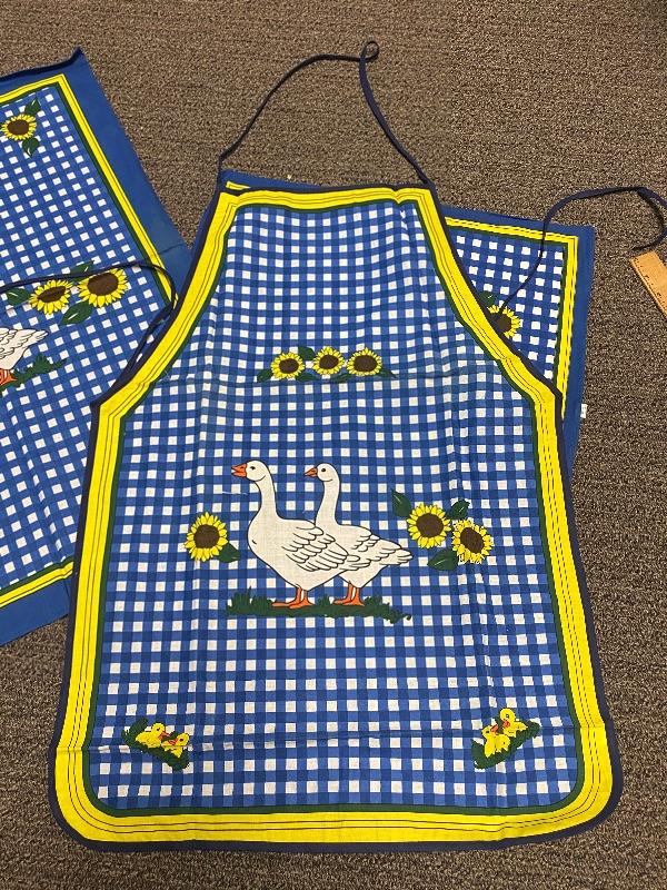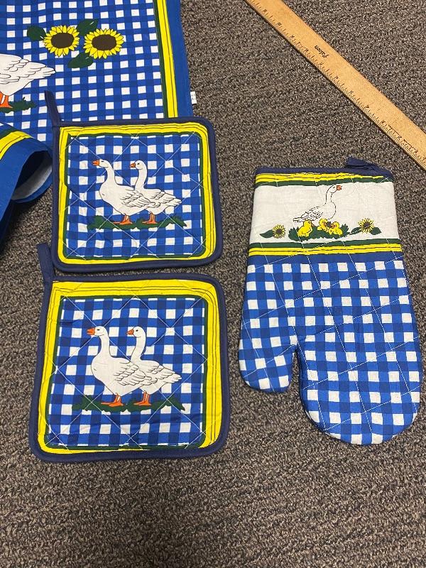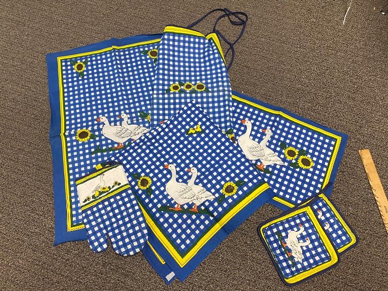 8 piece set of kitchen decor. Blue gingham pattern with yellow border. Features a pair of geese and sunflowers. Included is 2 pot holders, oven mitt, 2 placemats, apron, tea towel, and a square table cloth. Unused. Table cloth is about 31" square.