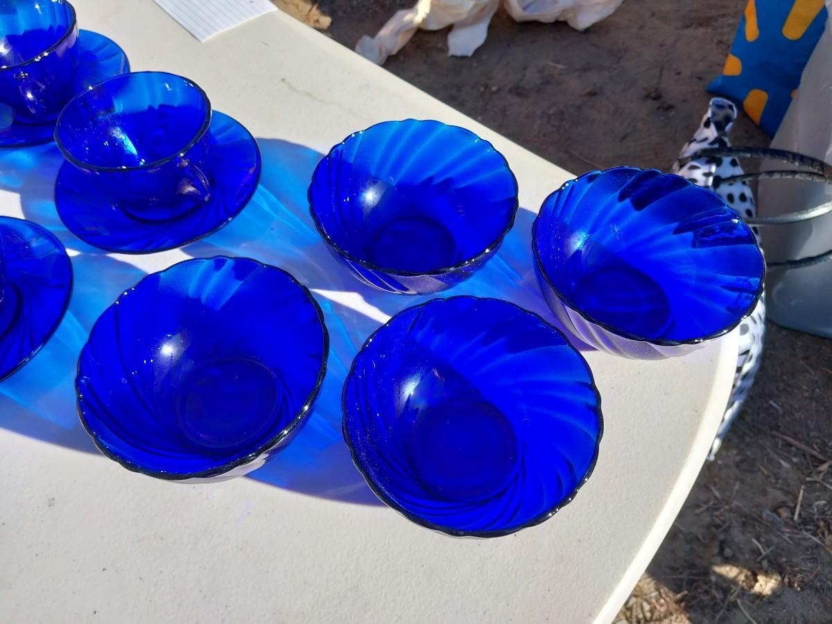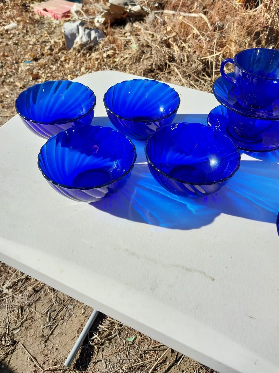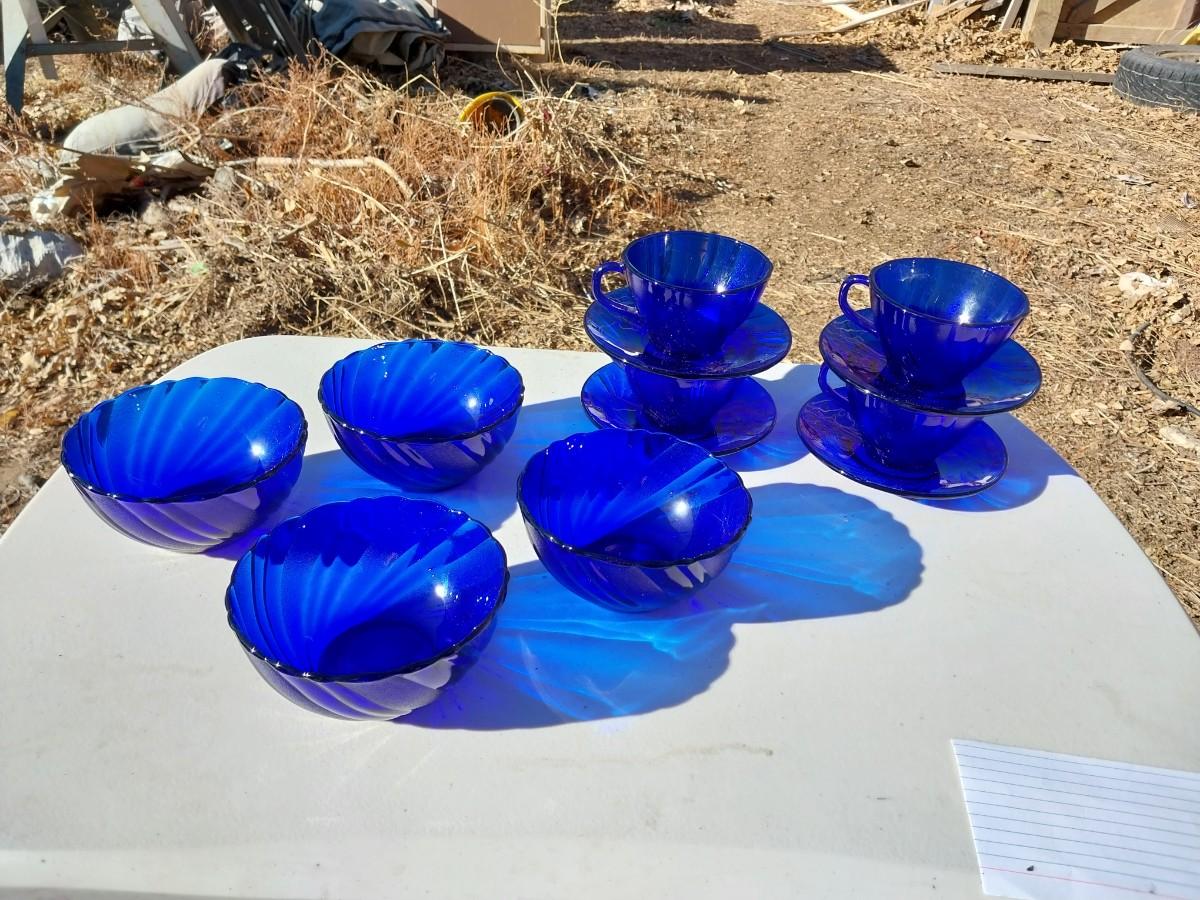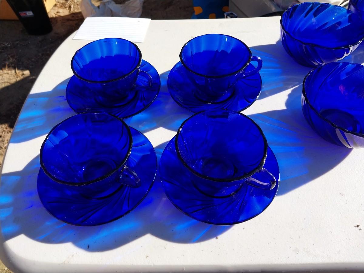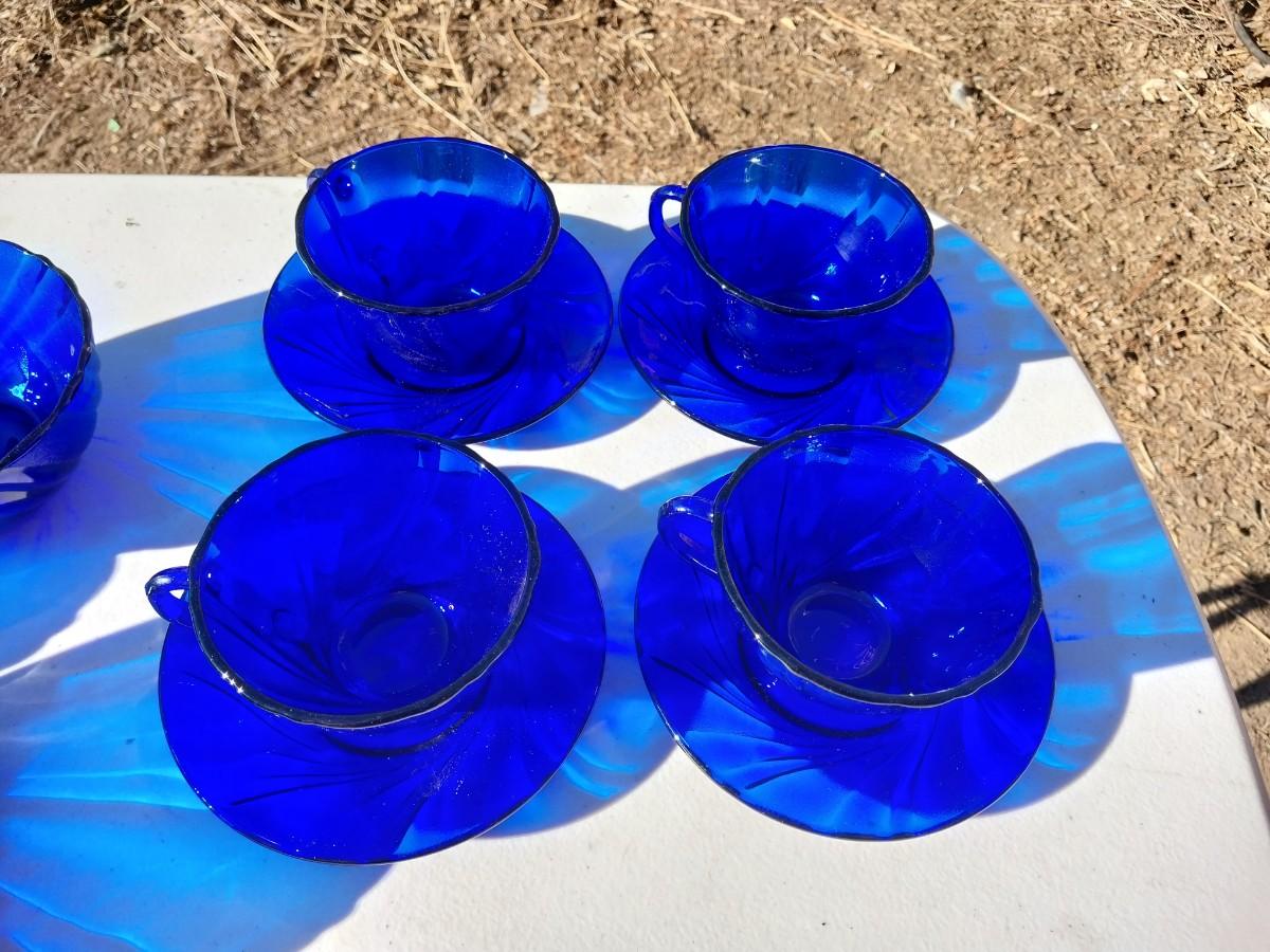 BLUE GLASS FOUR BOWLS AND FOUR CUP & SAUCERS