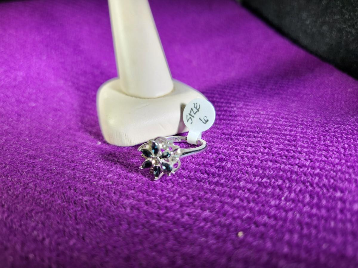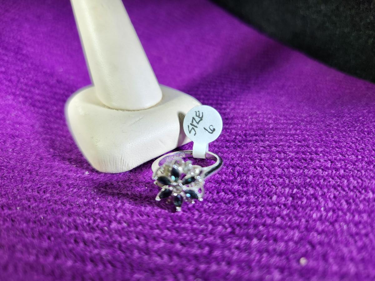 This auction lot is for a Blue Glass and Faux Diamond Costume Dinner Ring. The ring is a size 6. Marked 18KHGE. Very nicely made - will stun the crowd at your gathering.