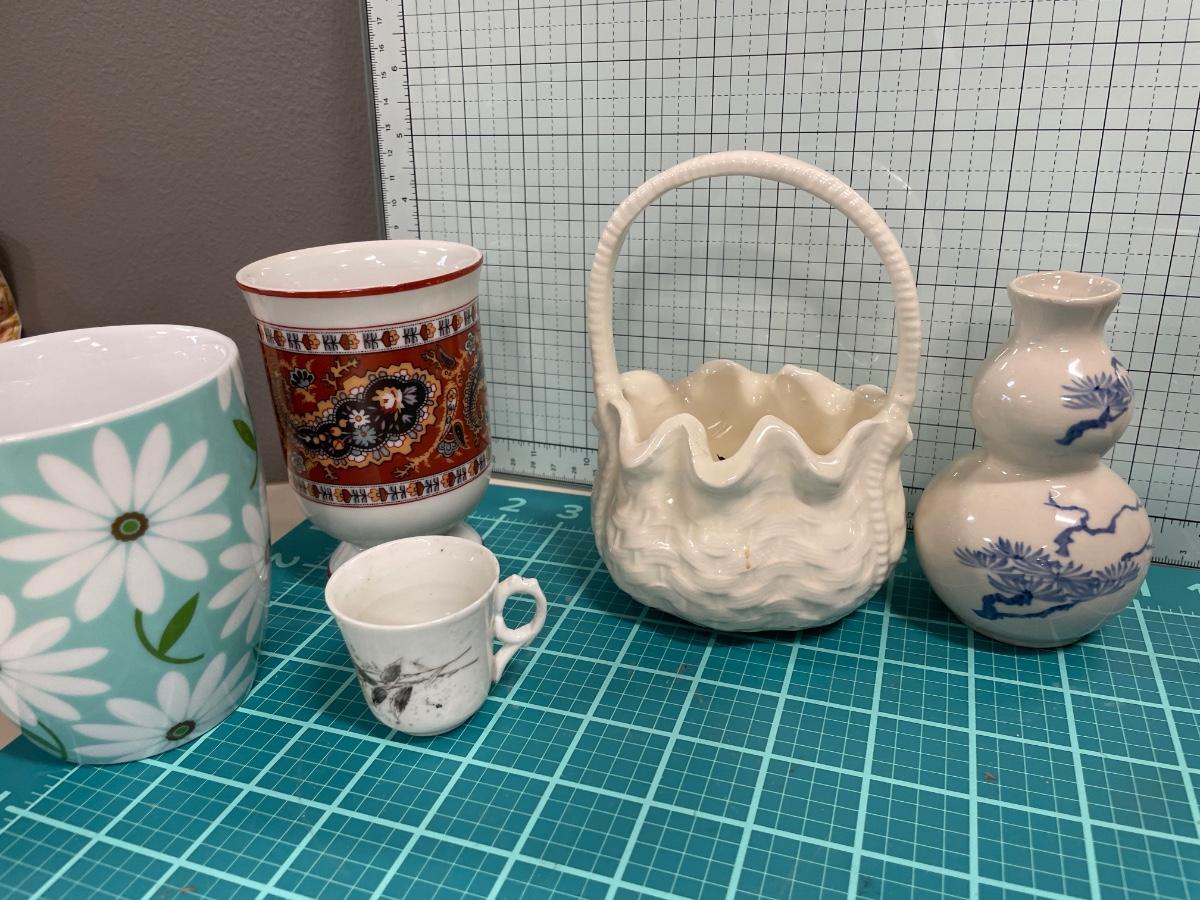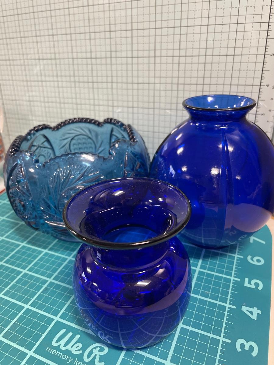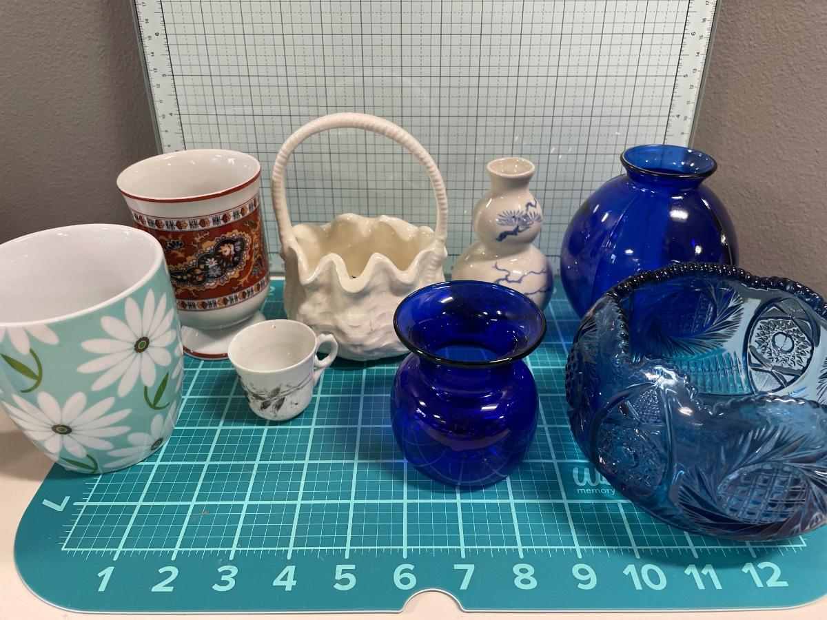 Mugs and blue glass vases