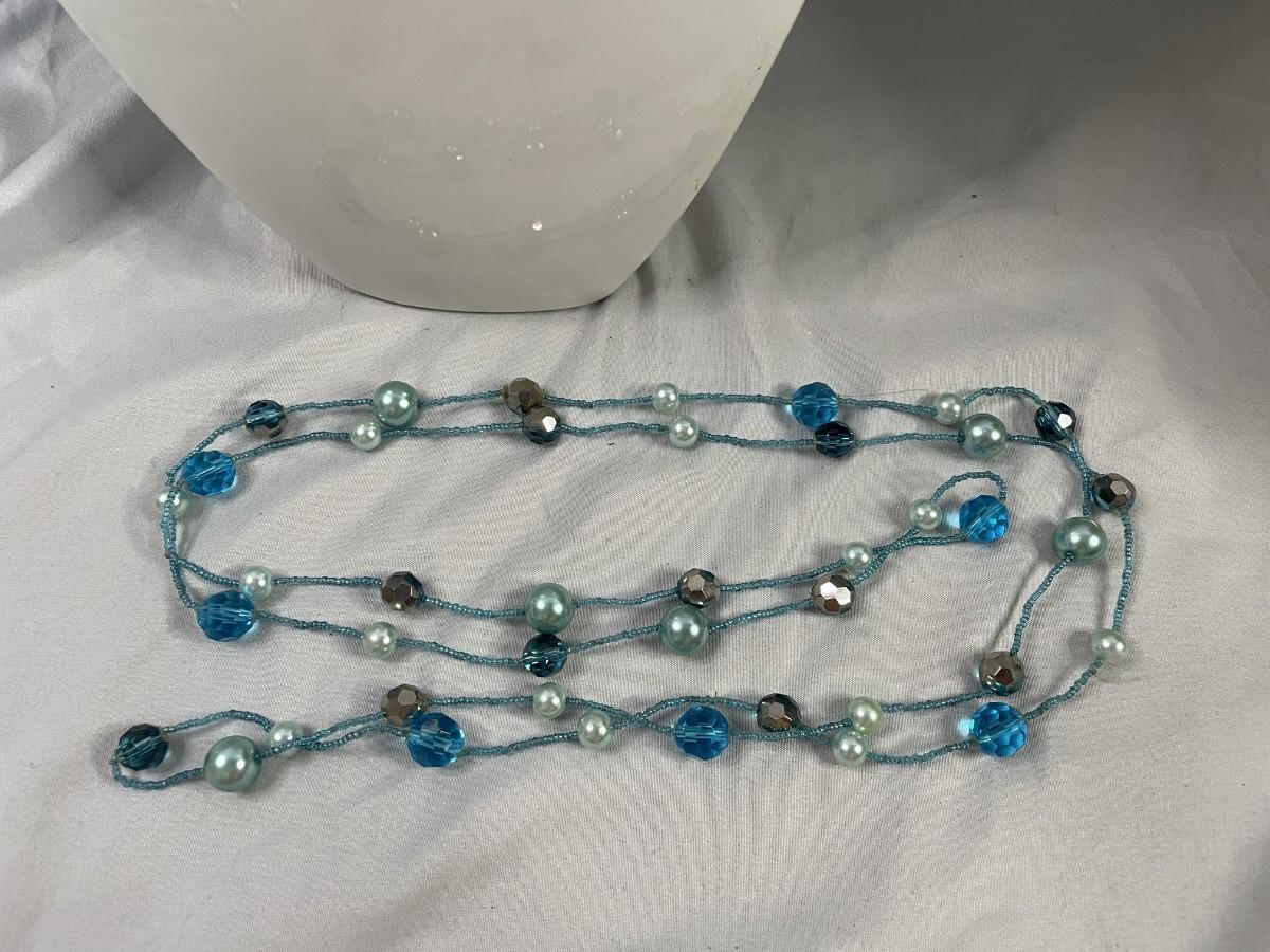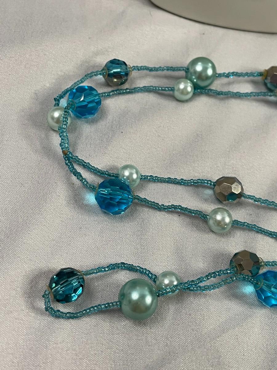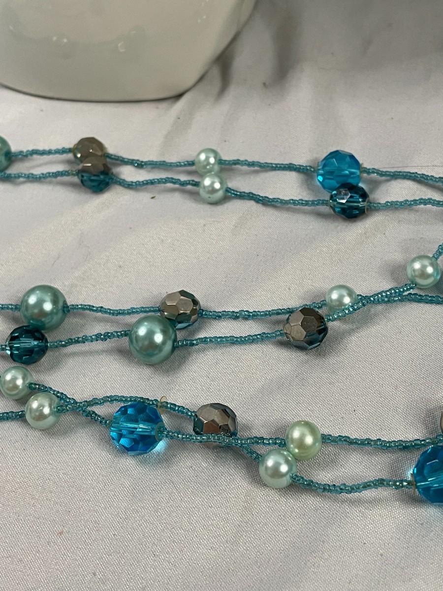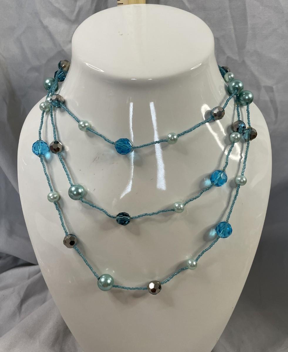 This necklace is made of a variety of shades of blue and a variety of shape and size beads. It is about 58 inches.