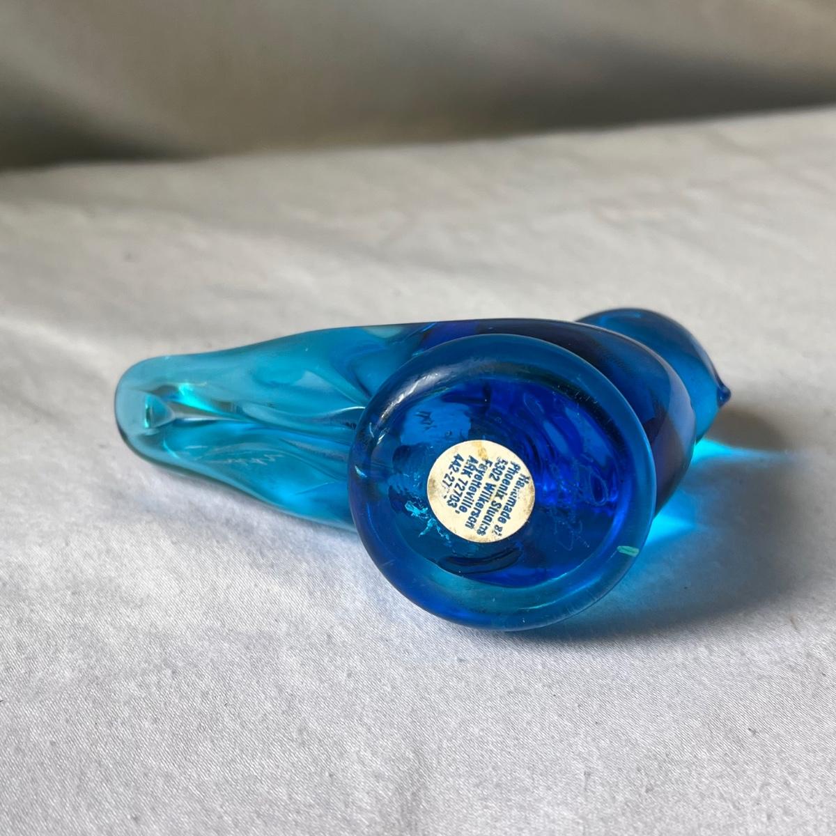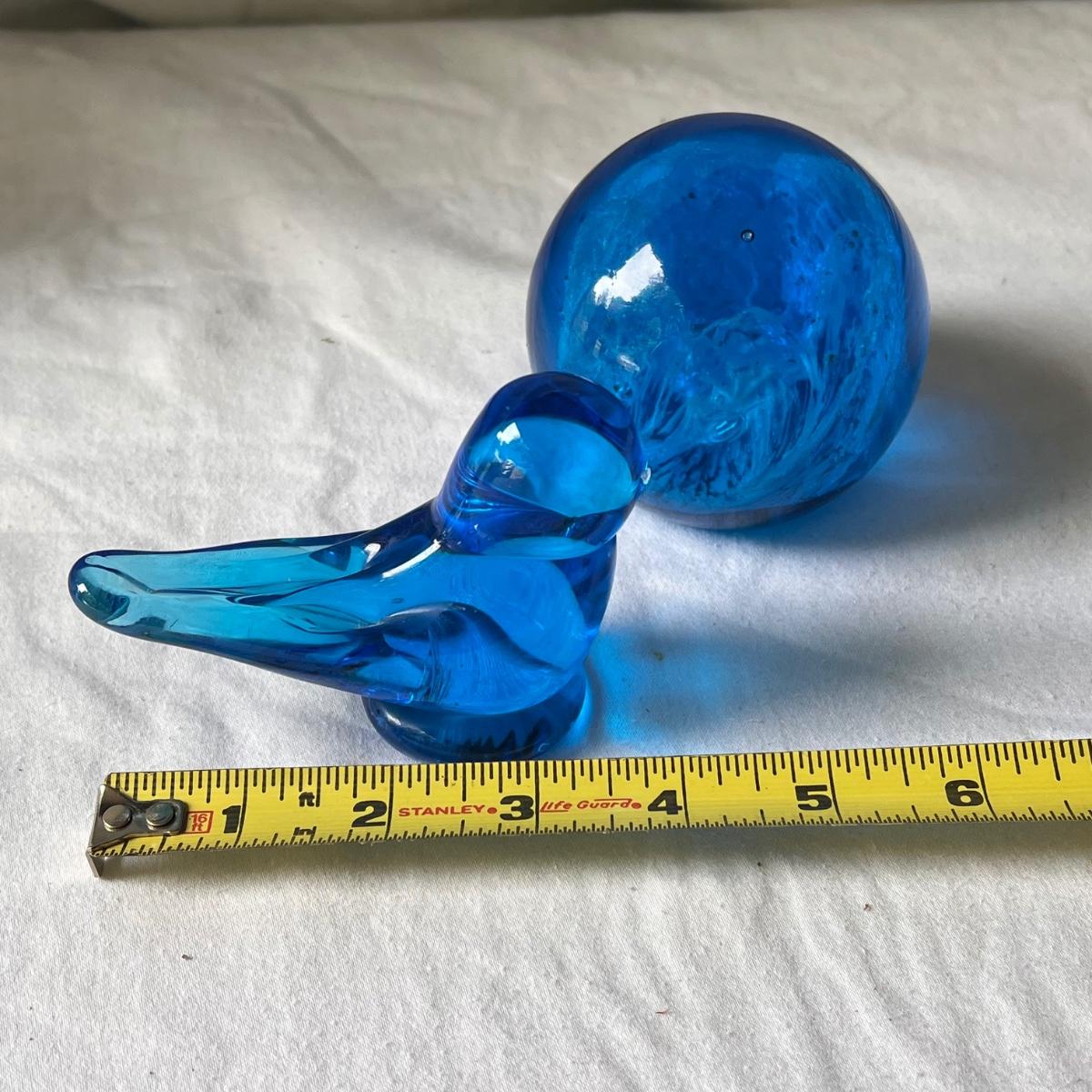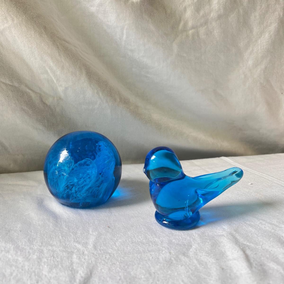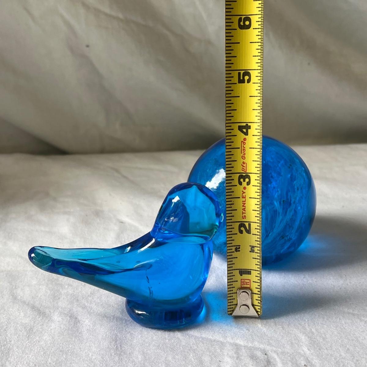 Lot includes one blue glass bird and one blue glass paper weight. The glass bird measures 3.5” x 2.75”H - see picture included. The bird reads “Altaglass” on the bottom. The paperweight appears to be handmade at Phoenix Studios. Shipping available.