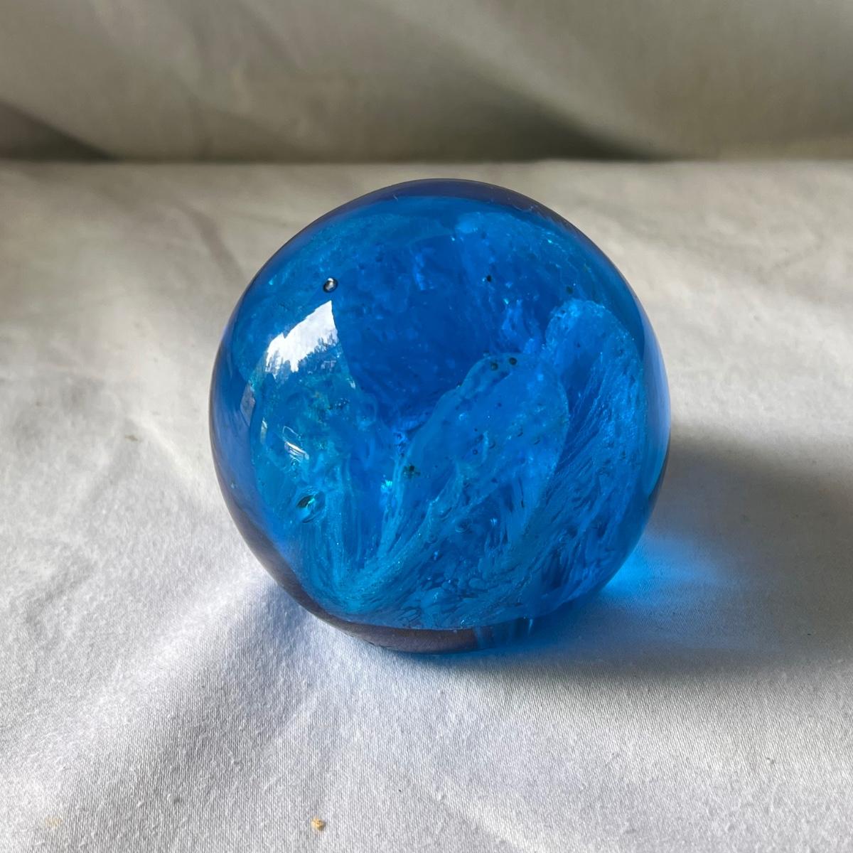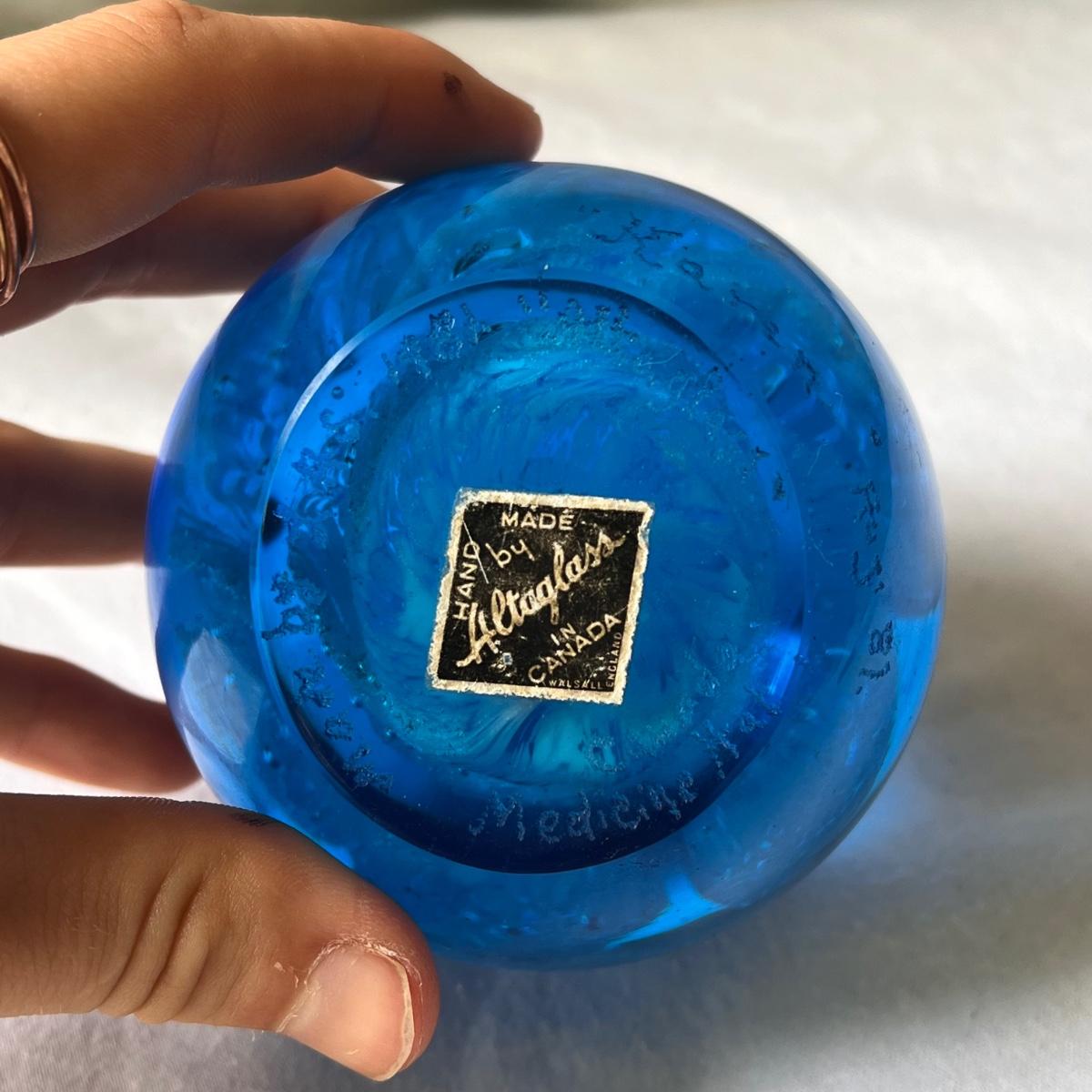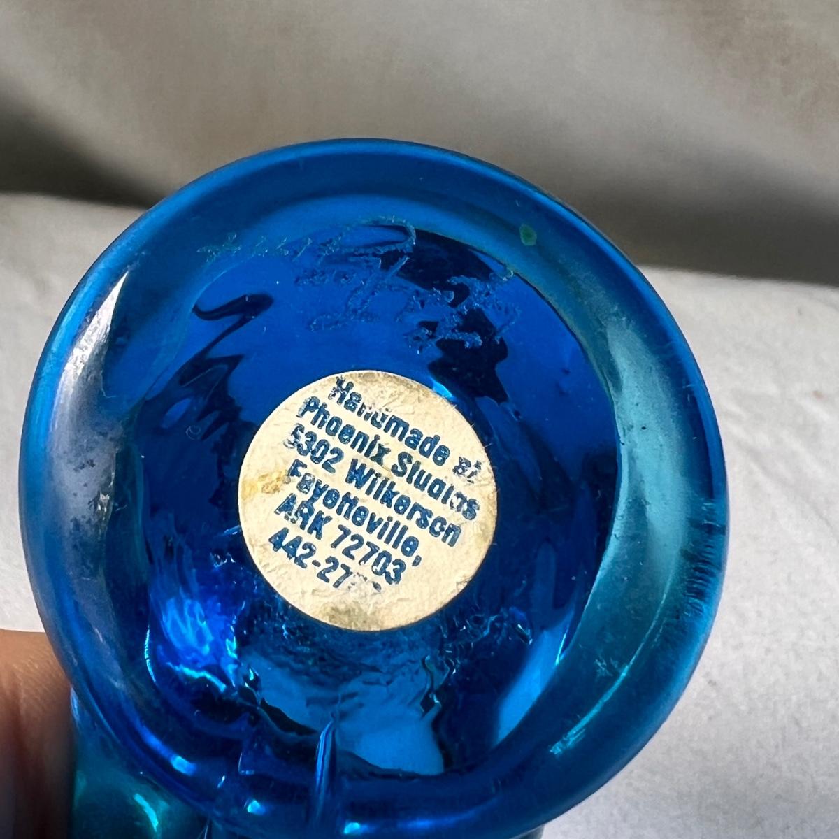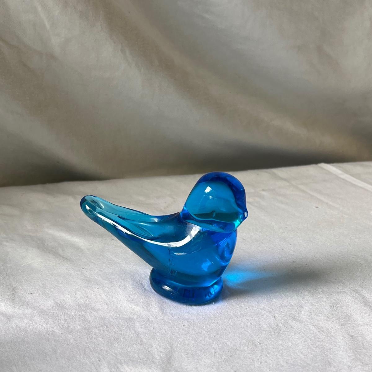 Lot includes one blue glass bird and one blue glass paper weight. The glass bird measures 3.5” x 2.75”H - see picture included. The bird reads “Altaglass” on the bottom. The paperweight appears to be handmade at Phoenix Studios. Shipping available.