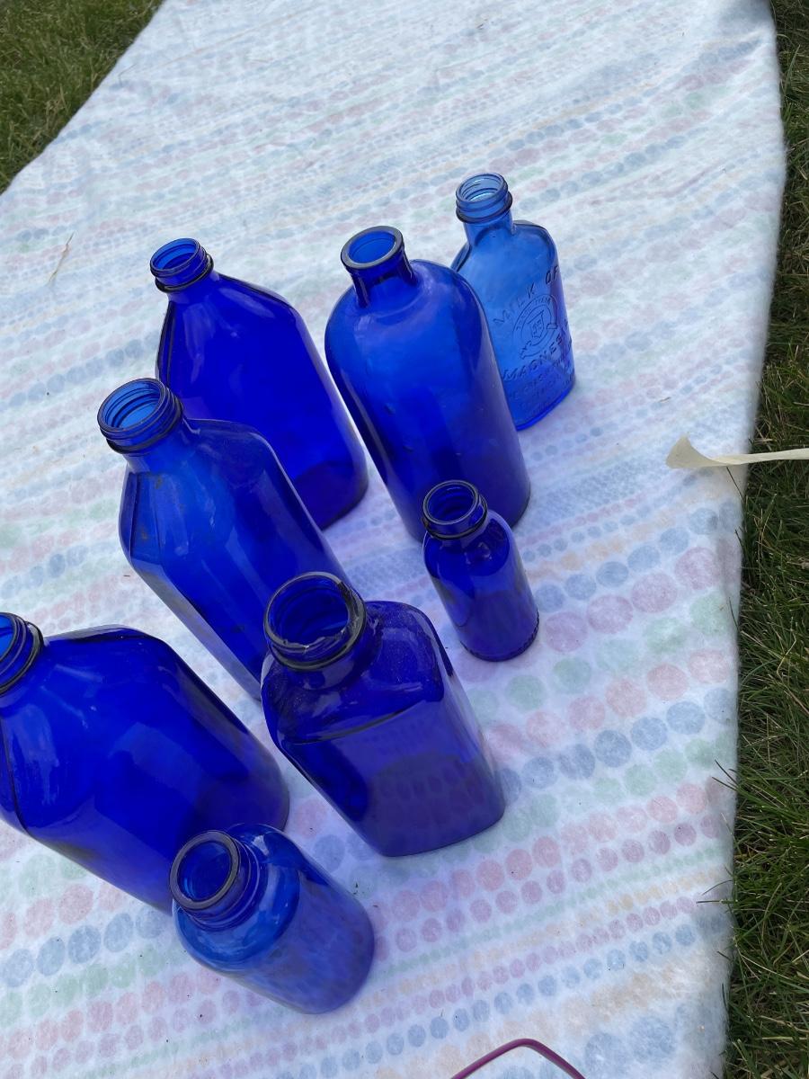Multiple blue glass bottles