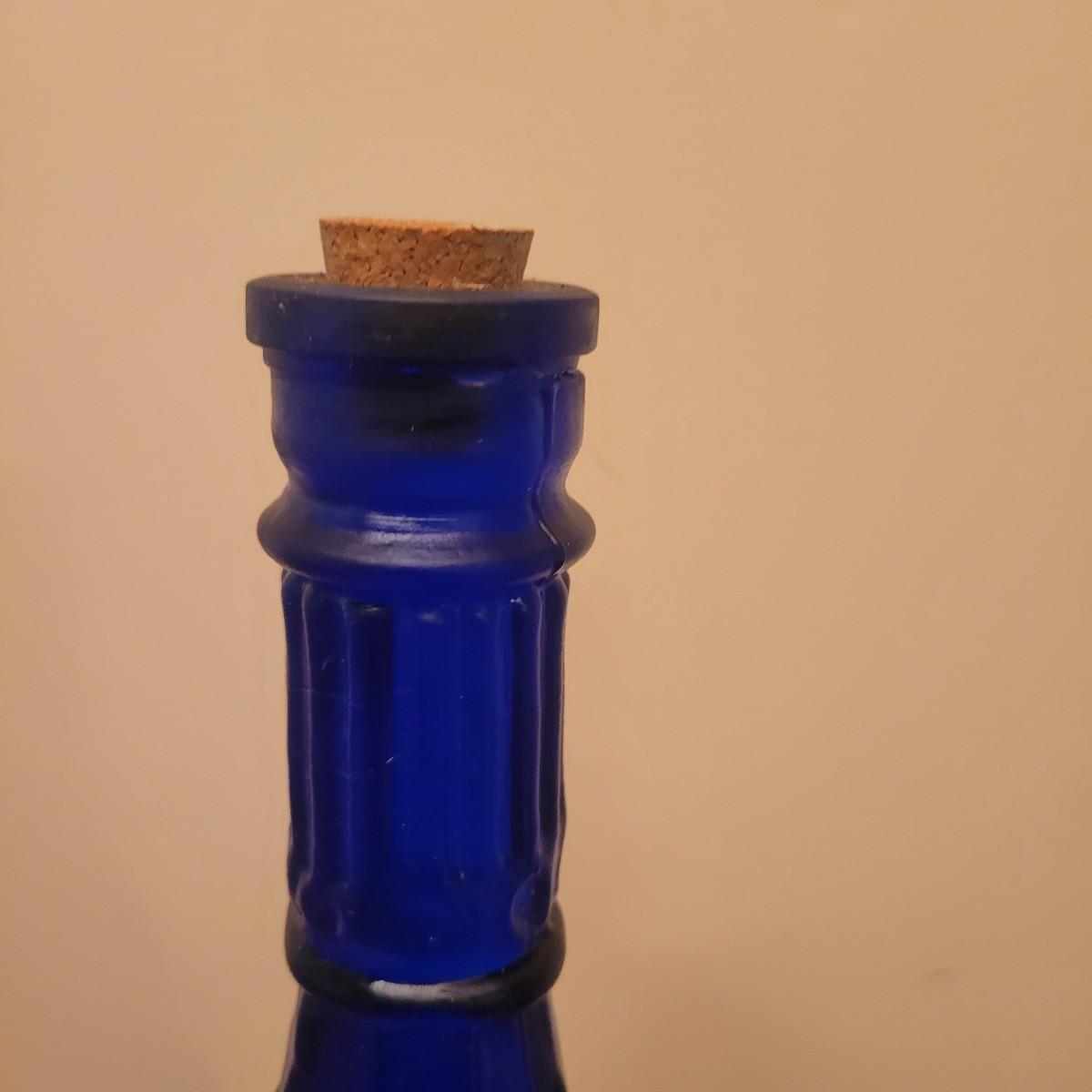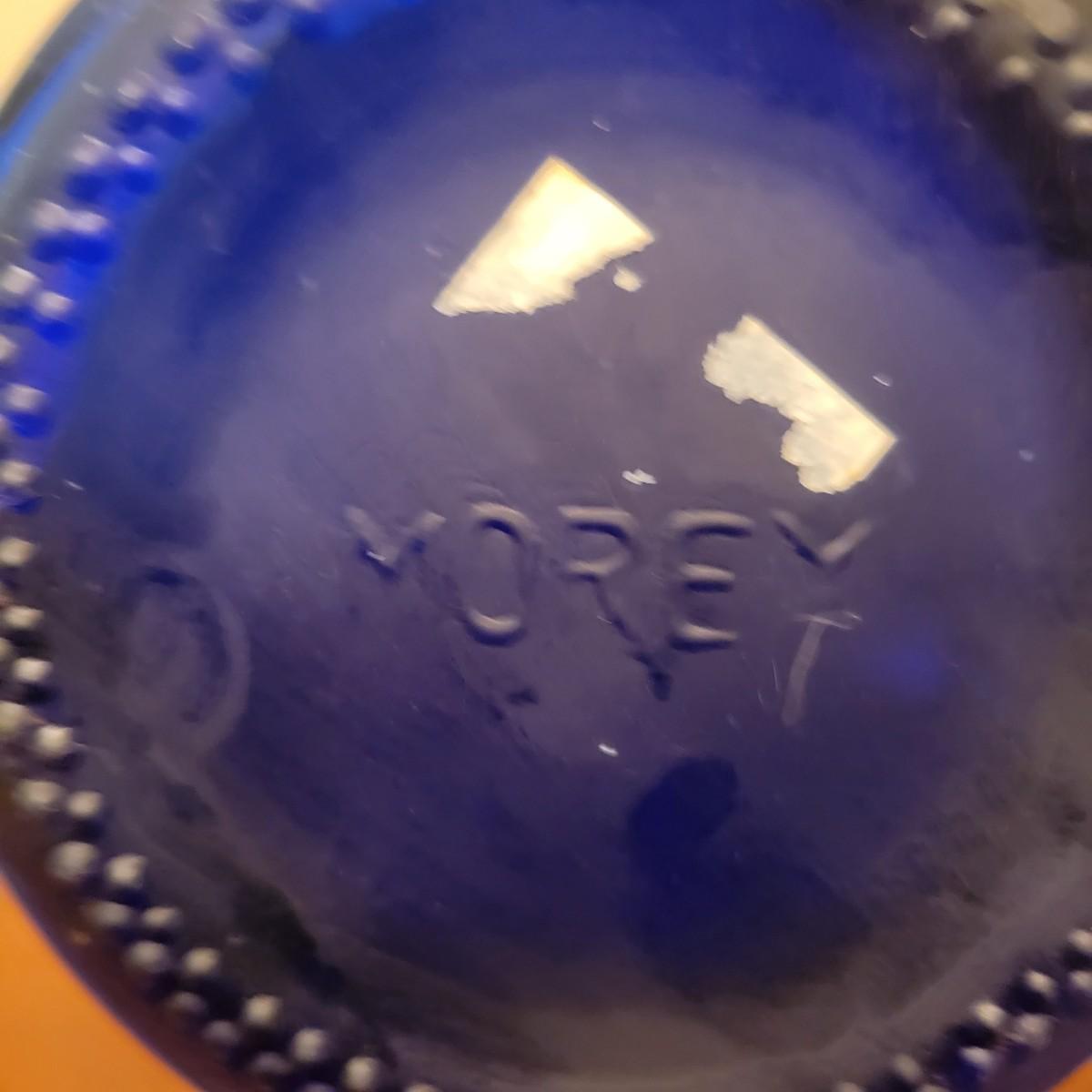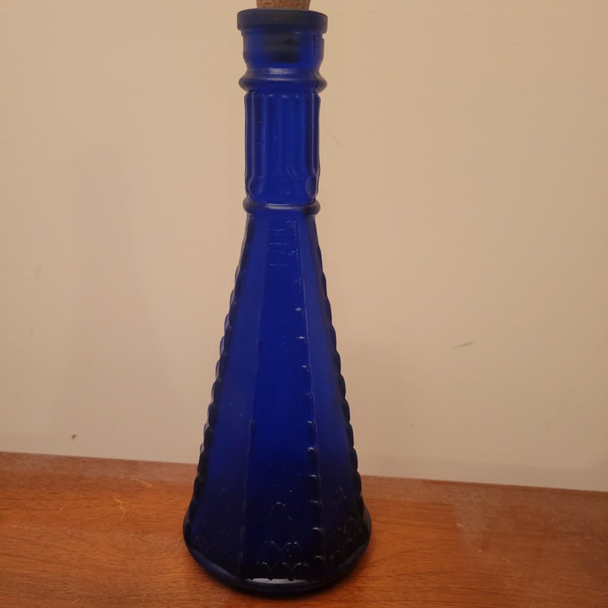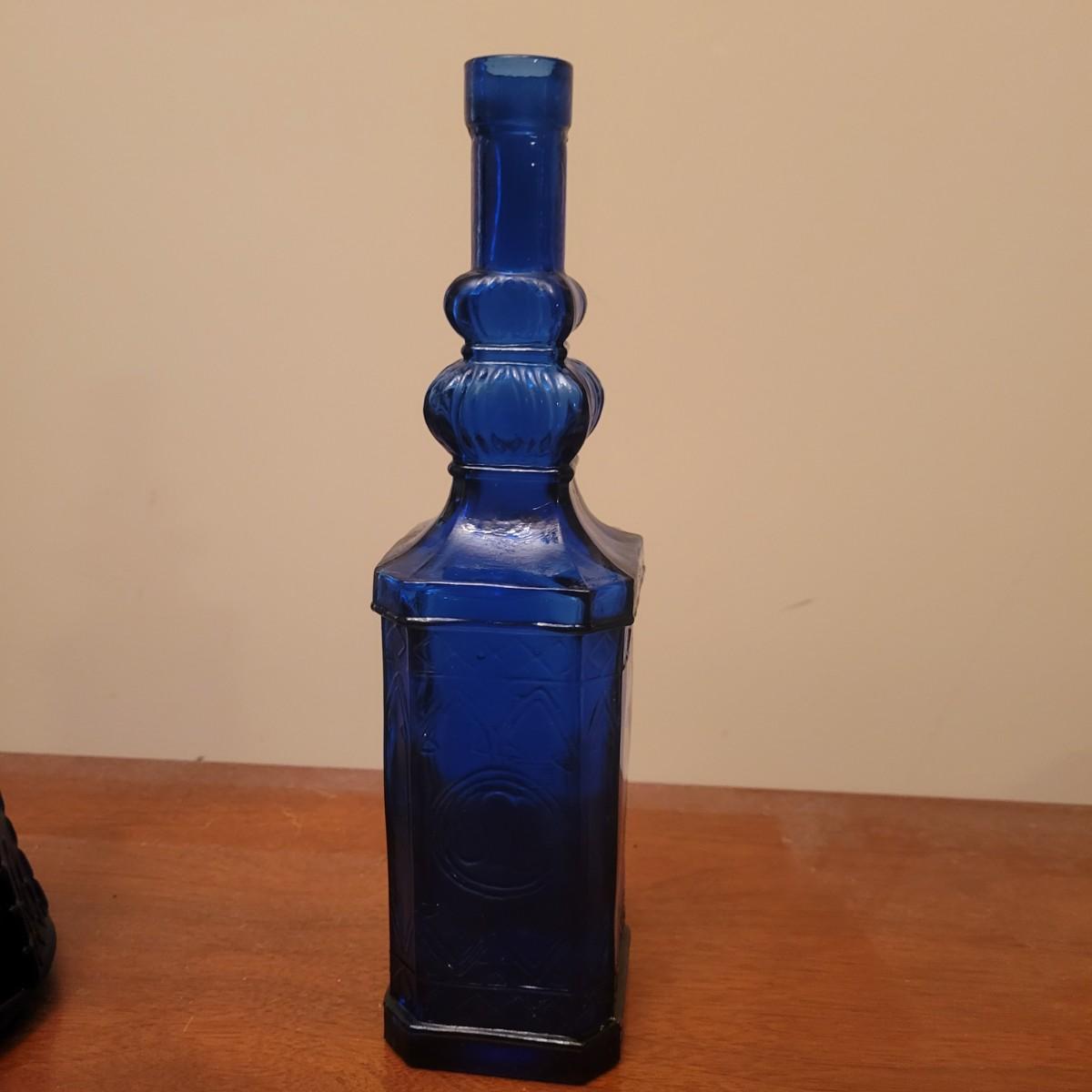 A pair of cobalt blue glass bottles in good condition with no notable damage. The bottles feature a deep cobalt blue glass color with some detail on them. The corked bottle has Morey marked on its base and measures approximately 4.5" x 12" Shipping available