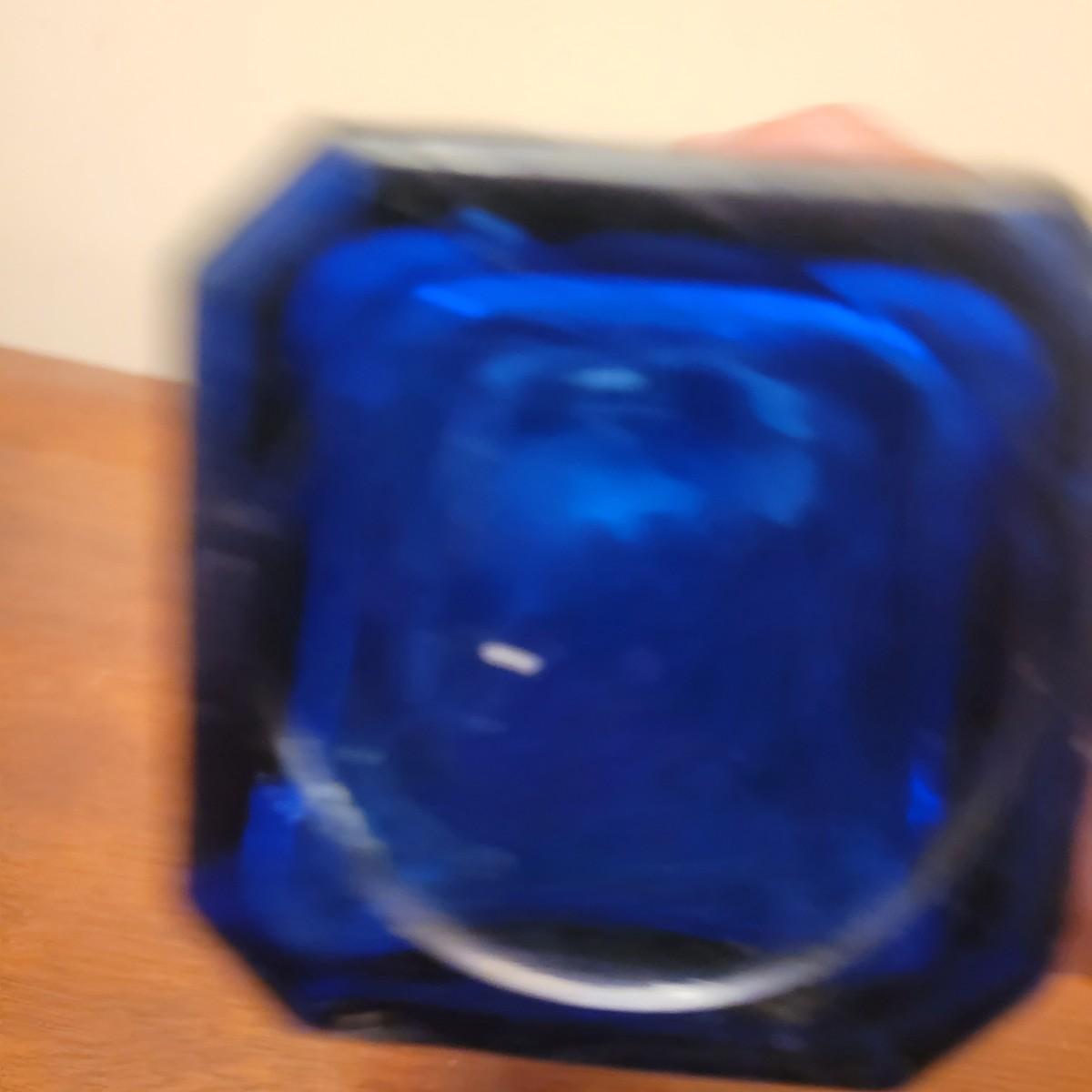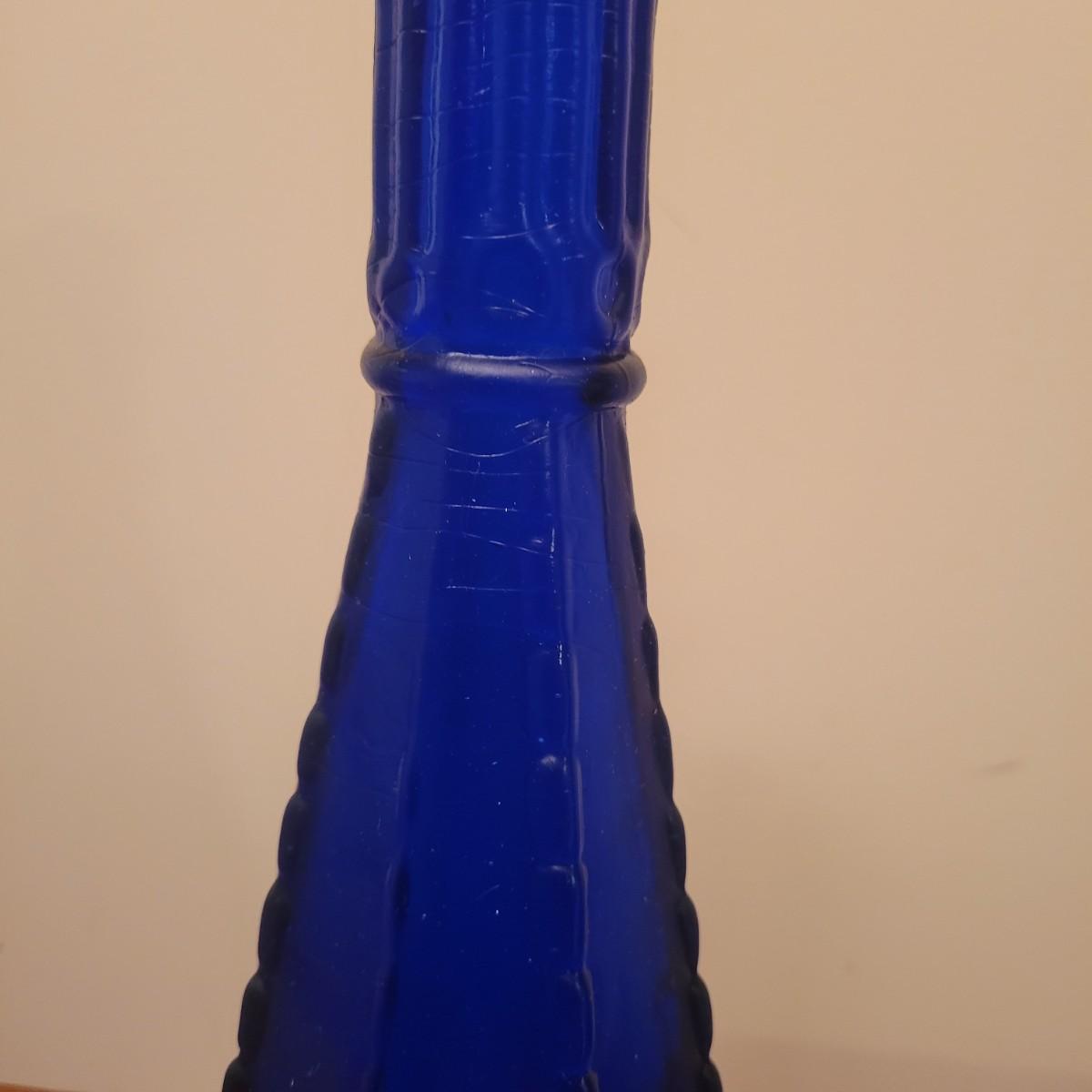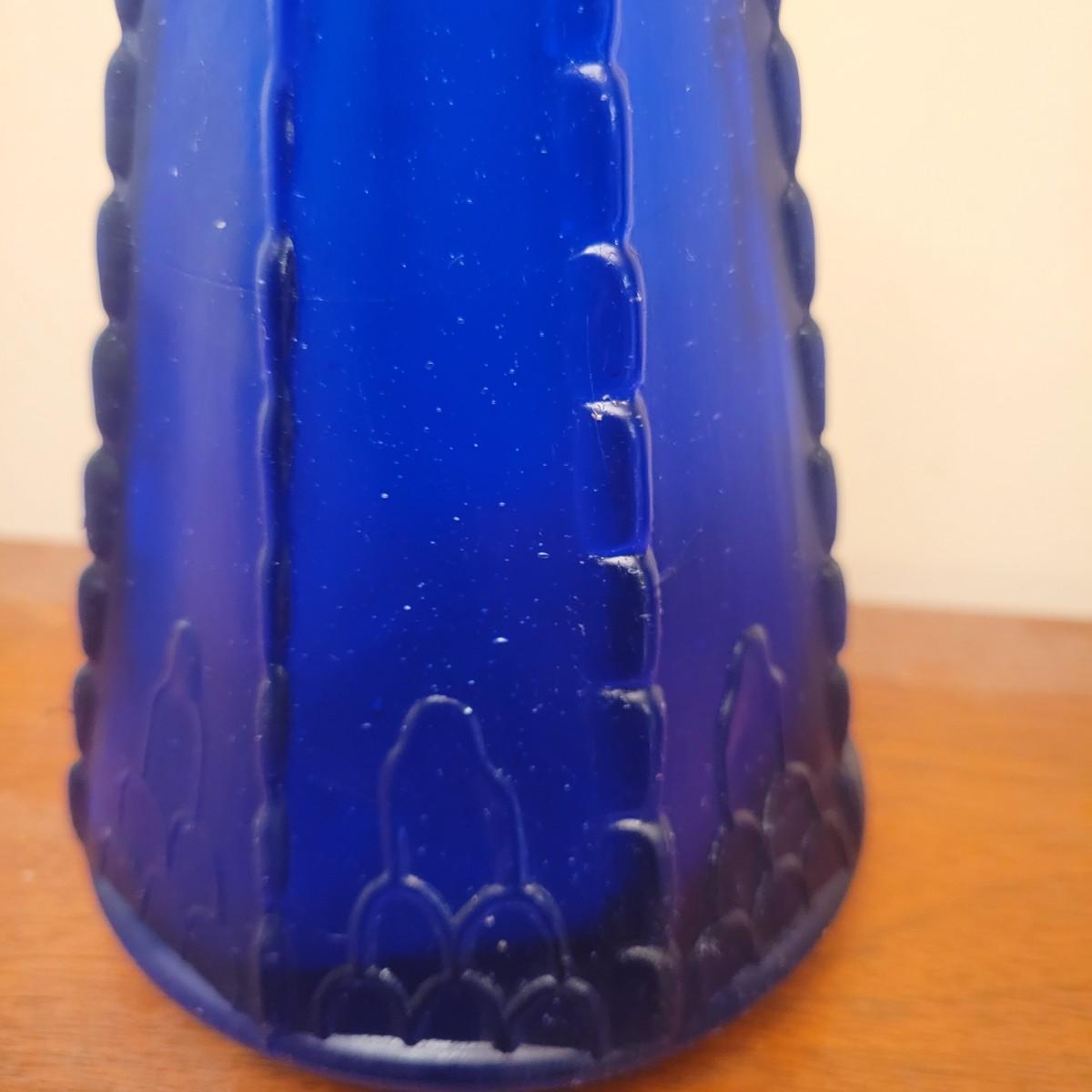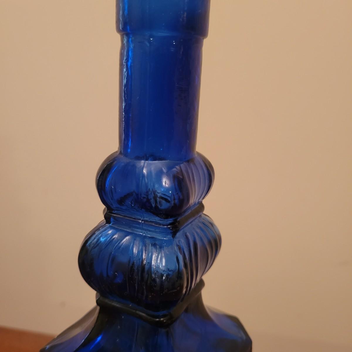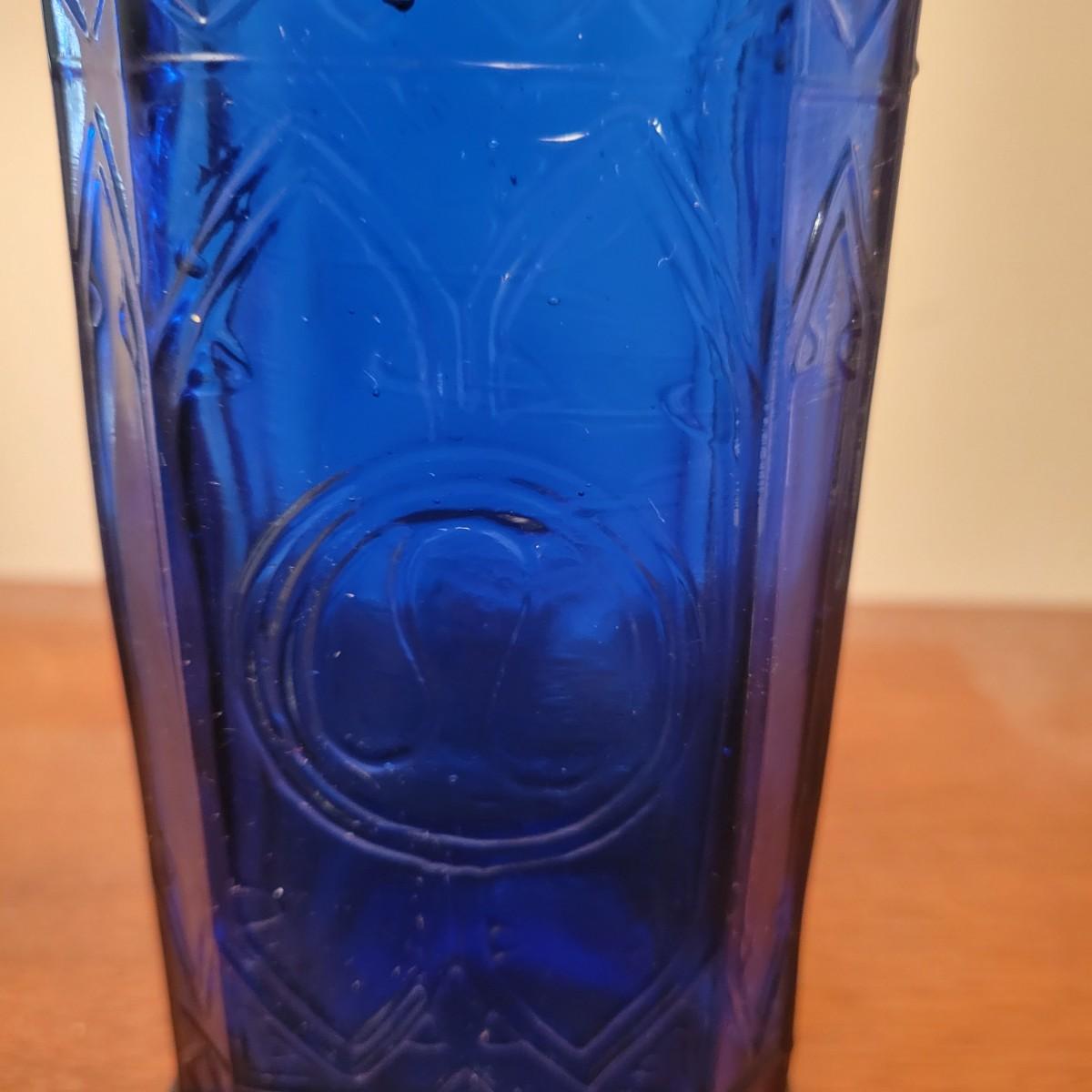 A pair of cobalt blue glass bottles in good condition with no notable damage. The bottles feature a deep cobalt blue glass color with some detail on them. The corked bottle has Morey marked on its base and measures approximately 4.5" x 12" Shipping available