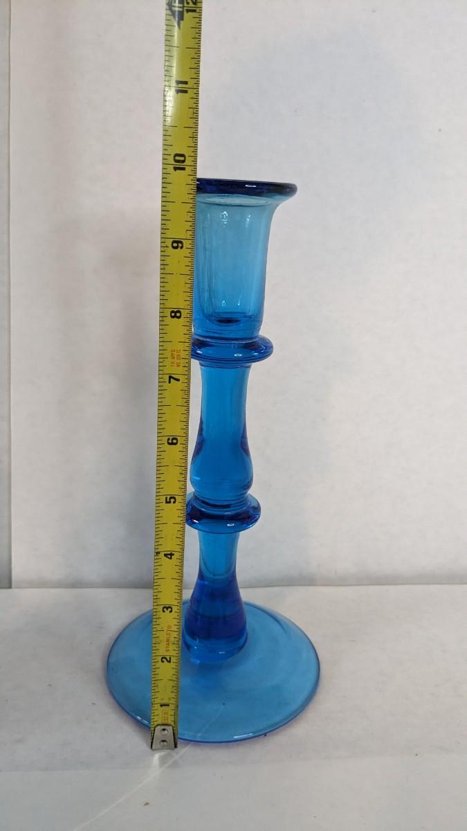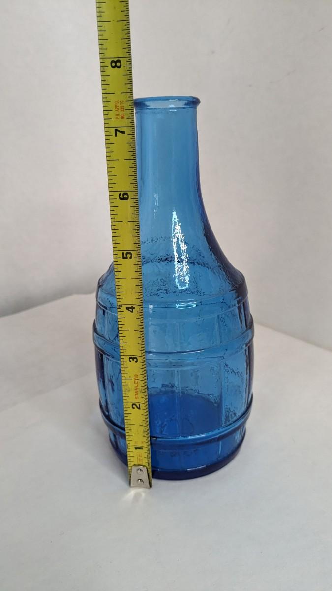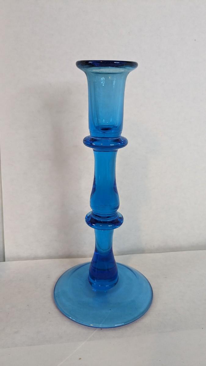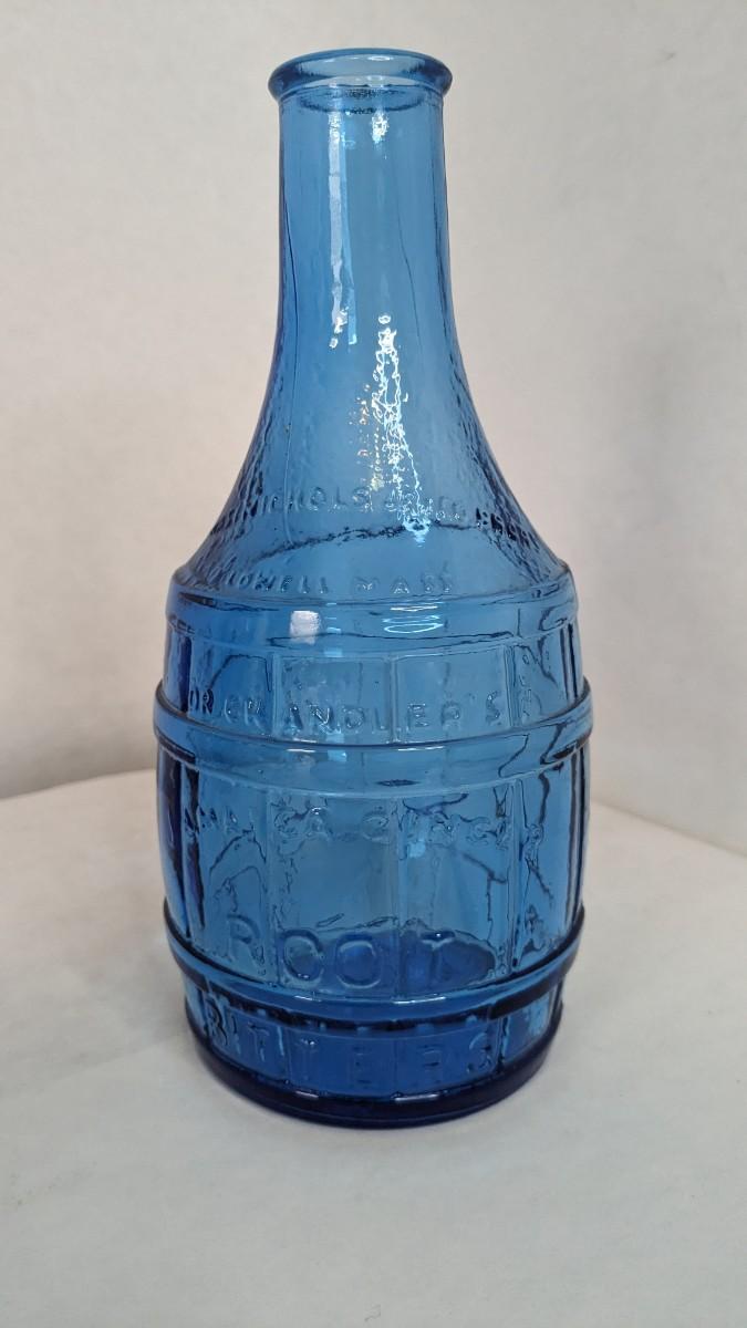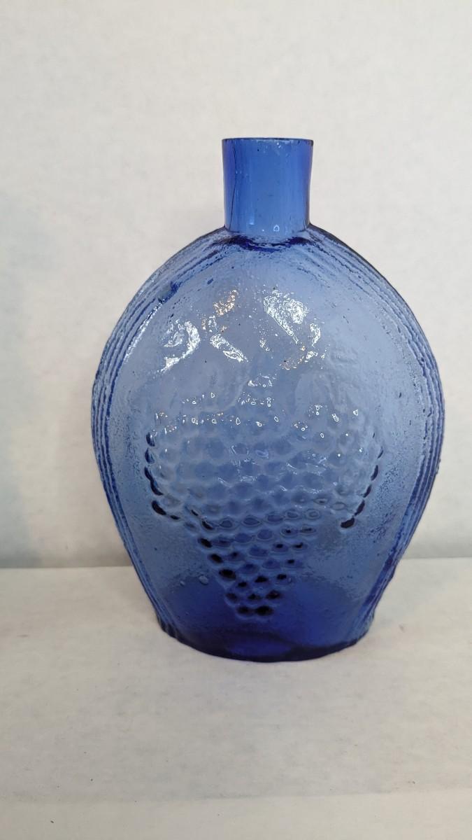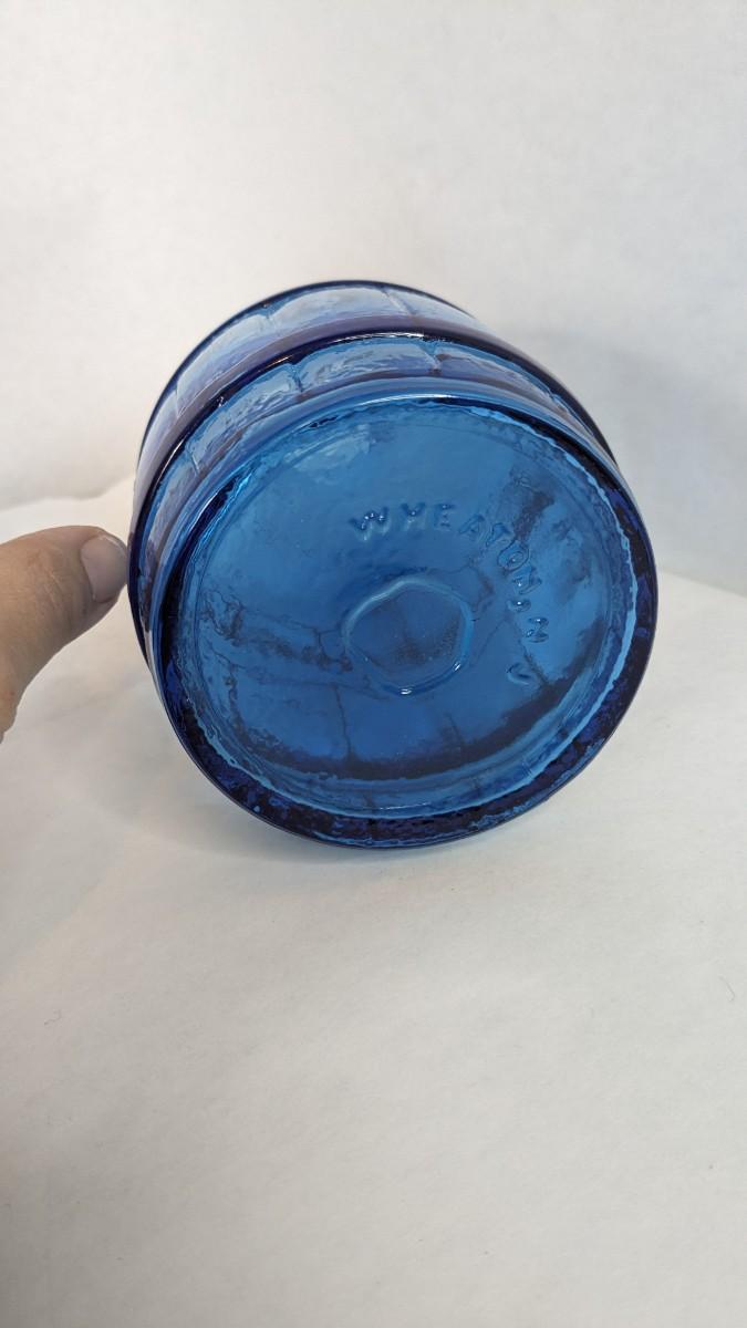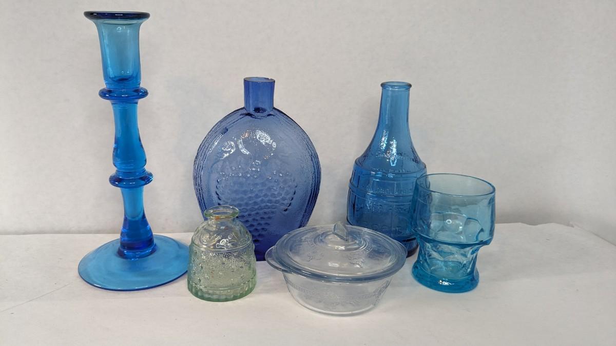 6 total pieces including beautiful Wheaton blue grape jug, Dr. Chandler's Jamaican Ginger Root Bitters barrel bottle, ink well, Fire King covered dish, 4 1/8" aquamarine honeycomb tumbler, and 10" candlestick holder. Extra handling fees will apply