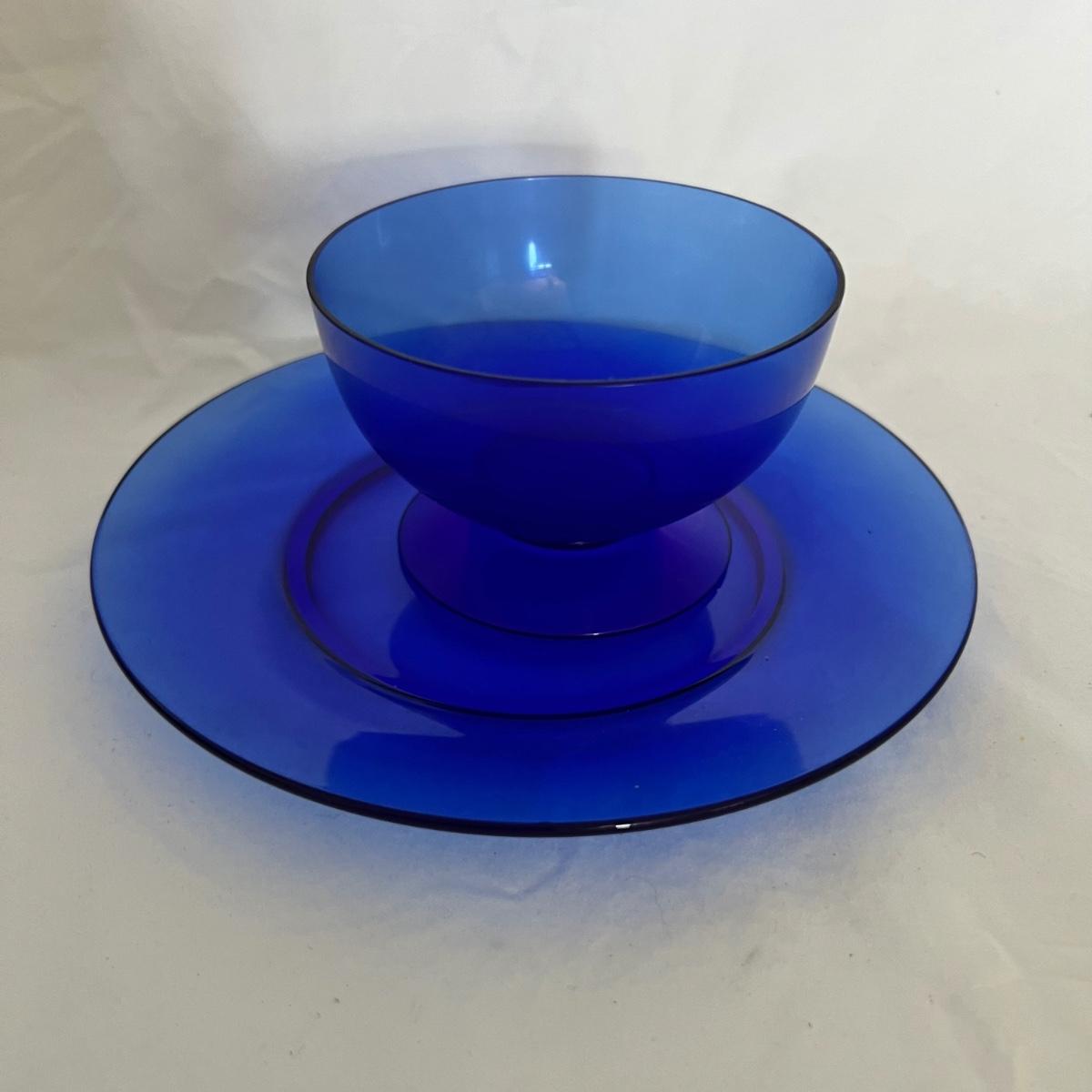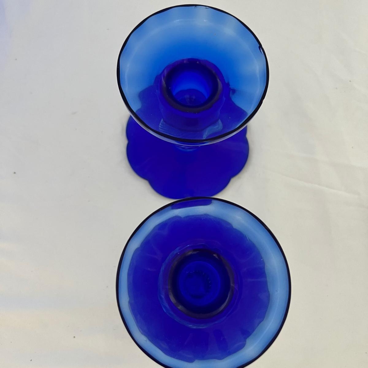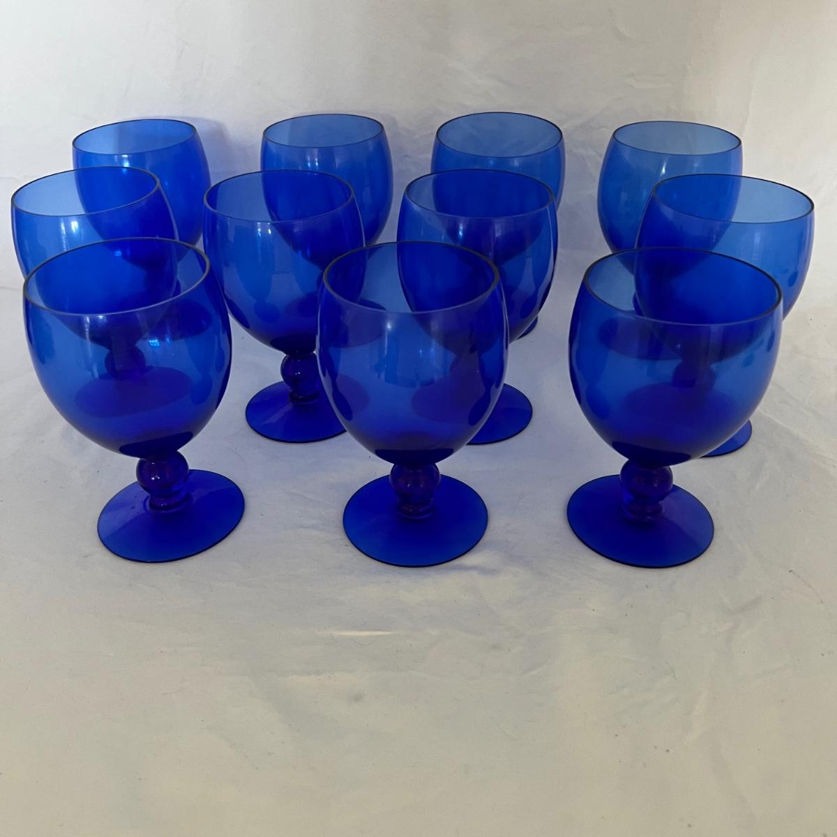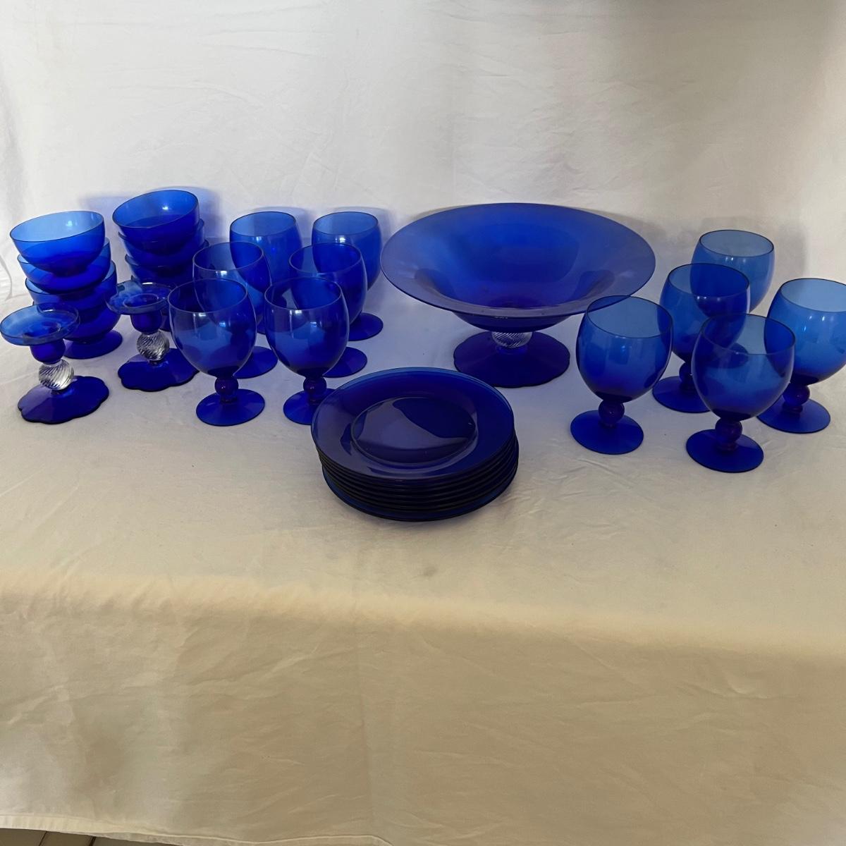 Eleven cobalt blue glasses measure 3”D x 5.5”H. Two glass candlesticks measure 3”D x 4”H. One large serving bowl measures 11.85”D x 5.25”H. Eight dessert, cups, and saucers