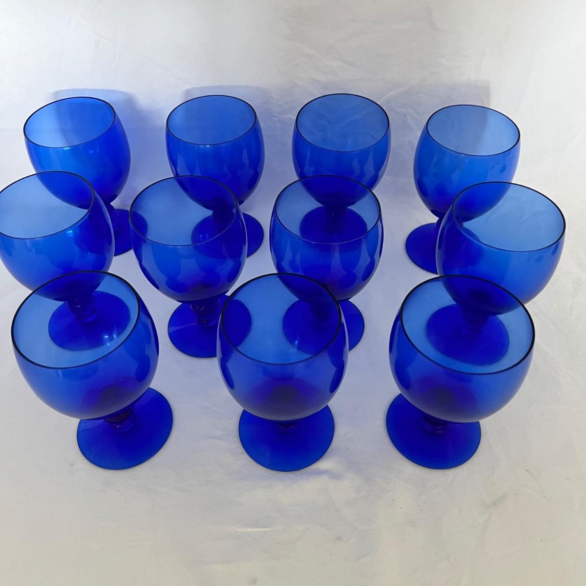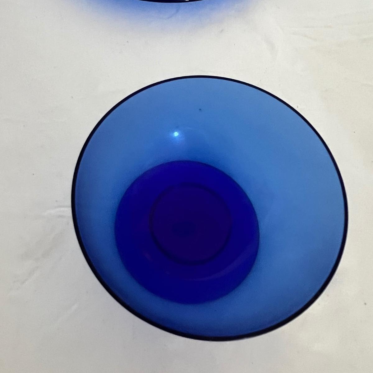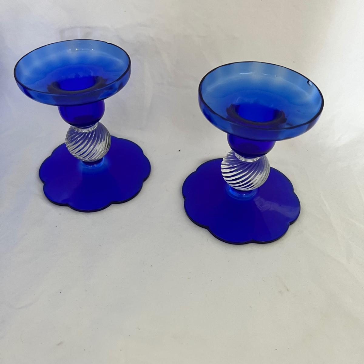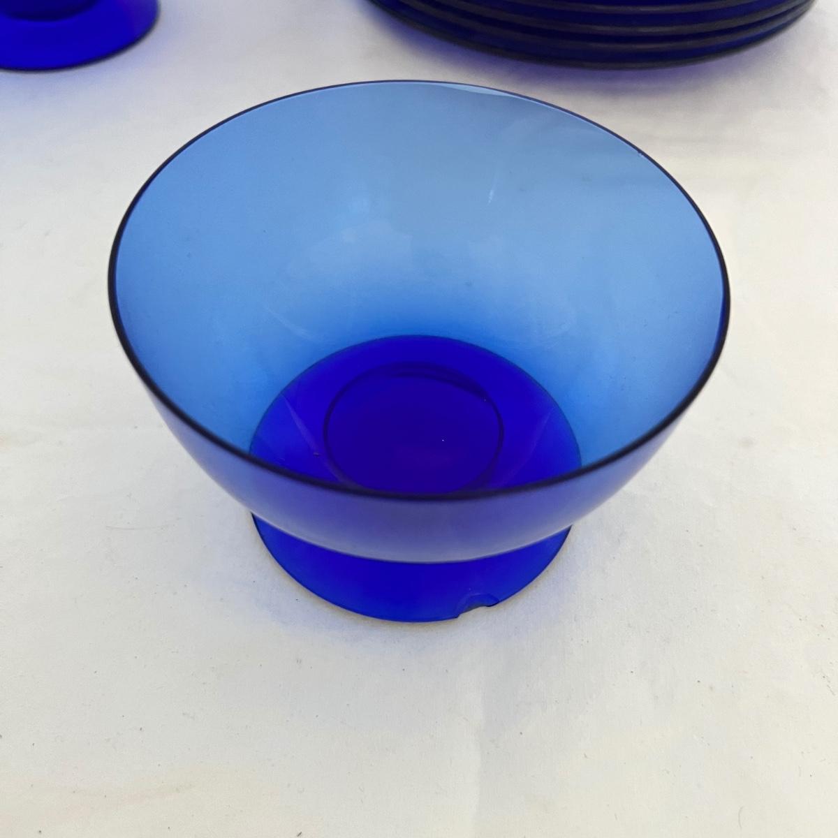 Eleven cobalt blue glasses measure 3”D x 5.5”H. Two glass candlesticks measure 3”D x 4”H. One large serving bowl measures 11.85”D x 5.25”H. Eight dessert, cups, and saucers