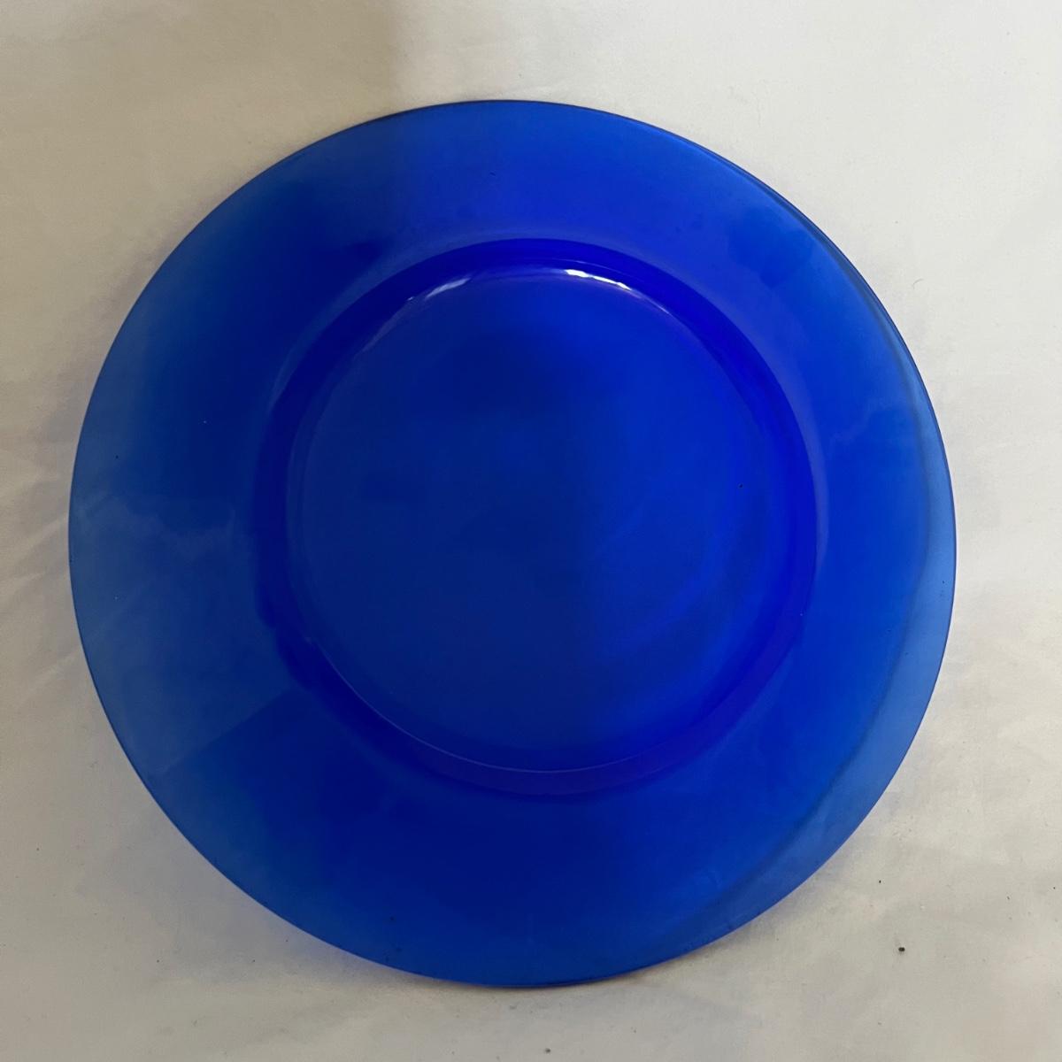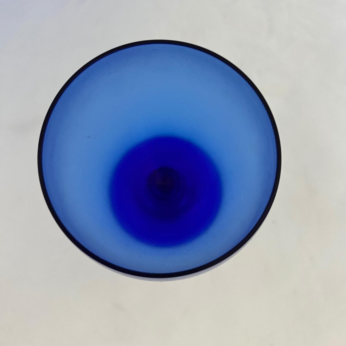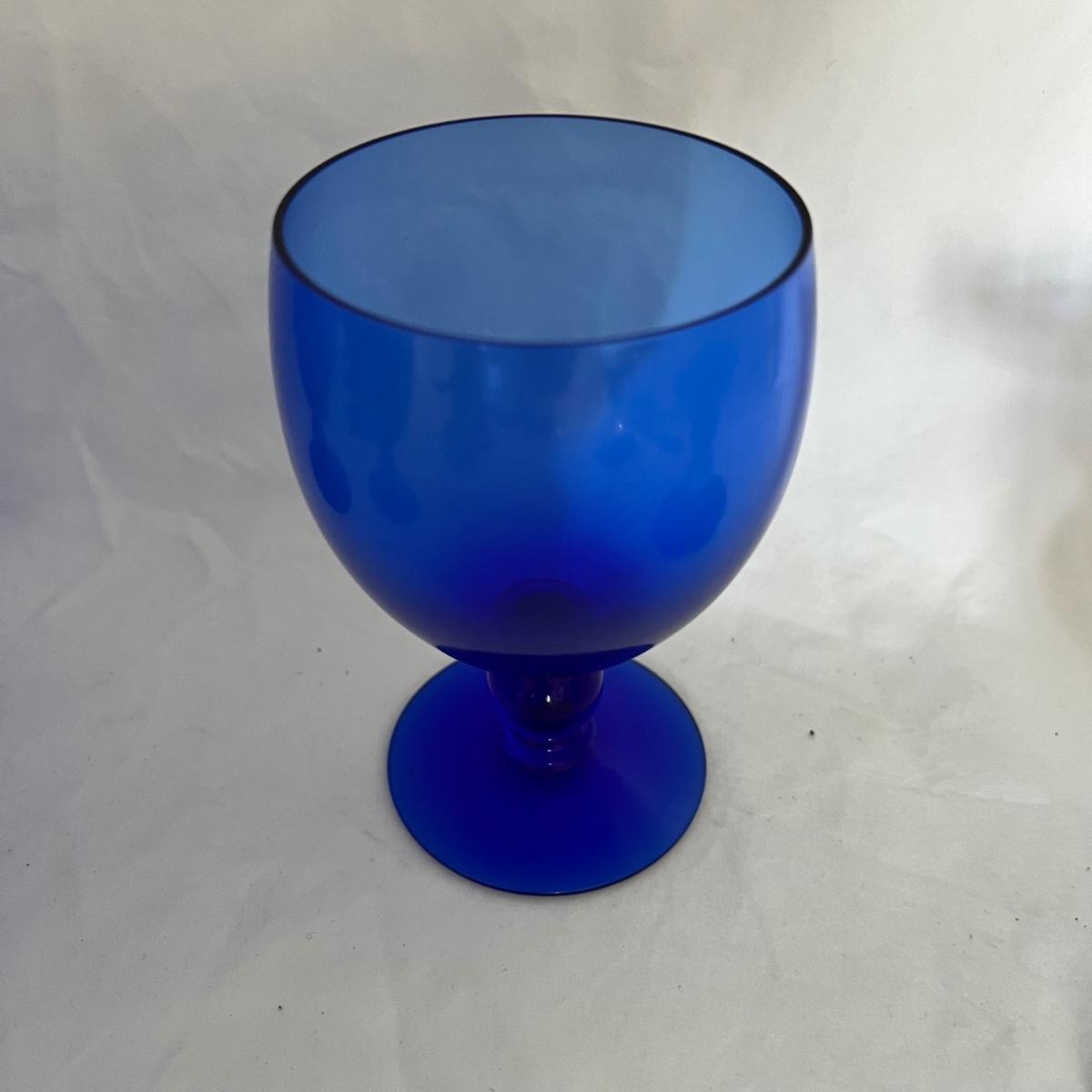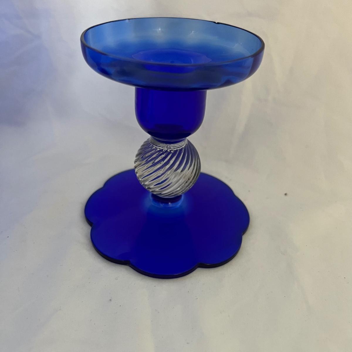 Eleven cobalt blue glasses measure 3”D x 5.5”H. Two glass candlesticks measure 3”D x 4”H. One large serving bowl measures 11.85”D x 5.25”H. Eight dessert, cups, and saucers