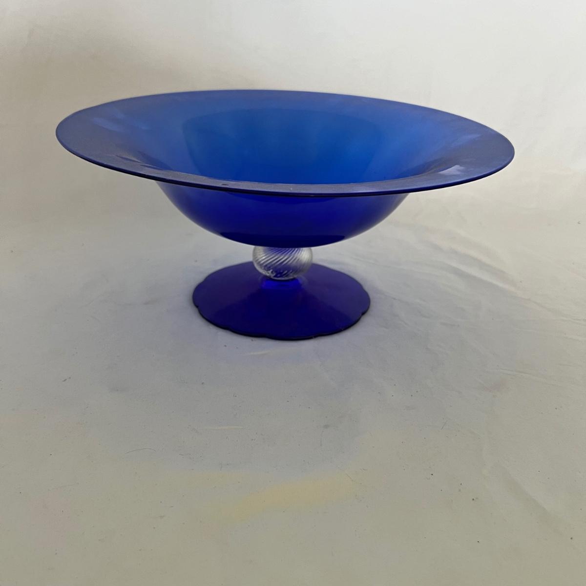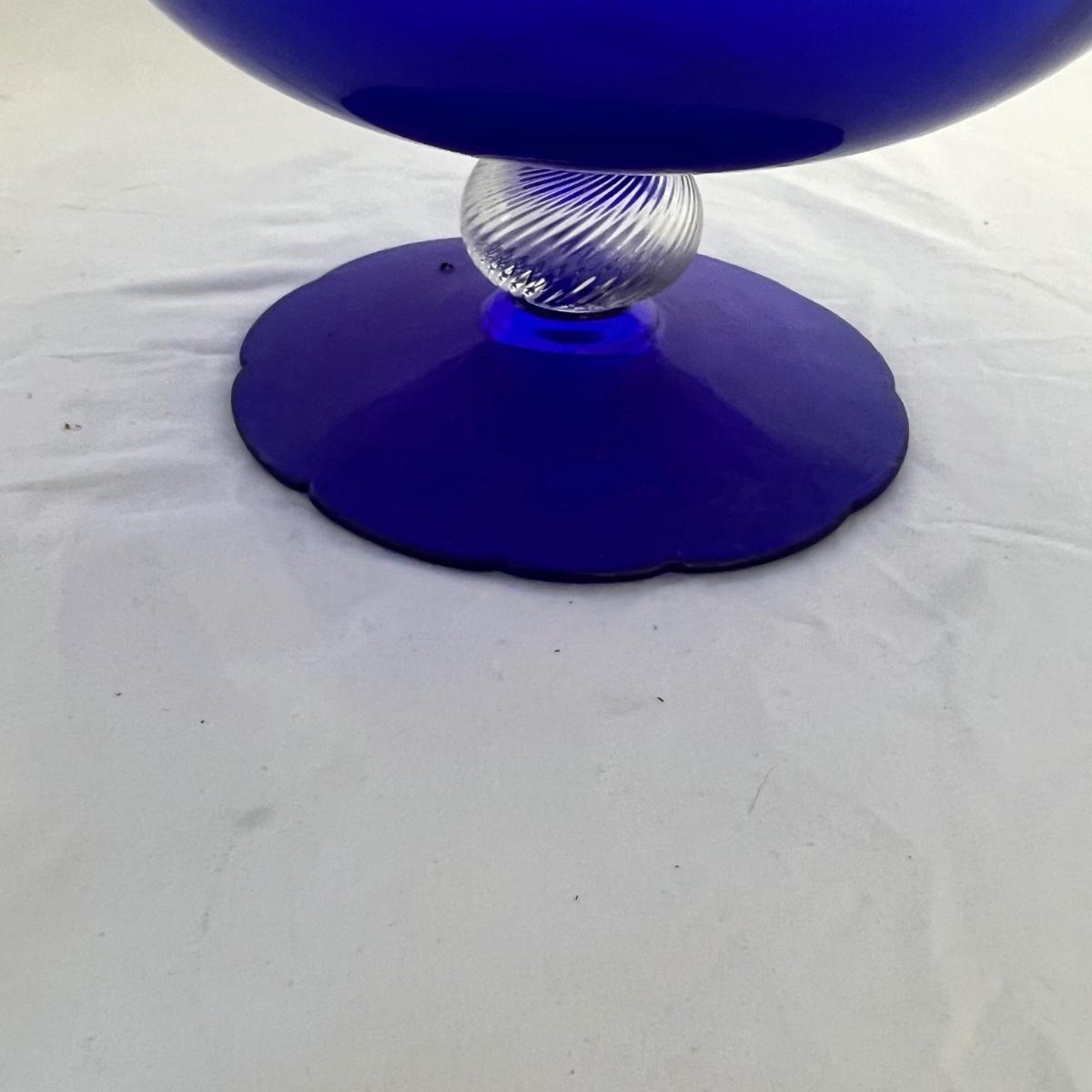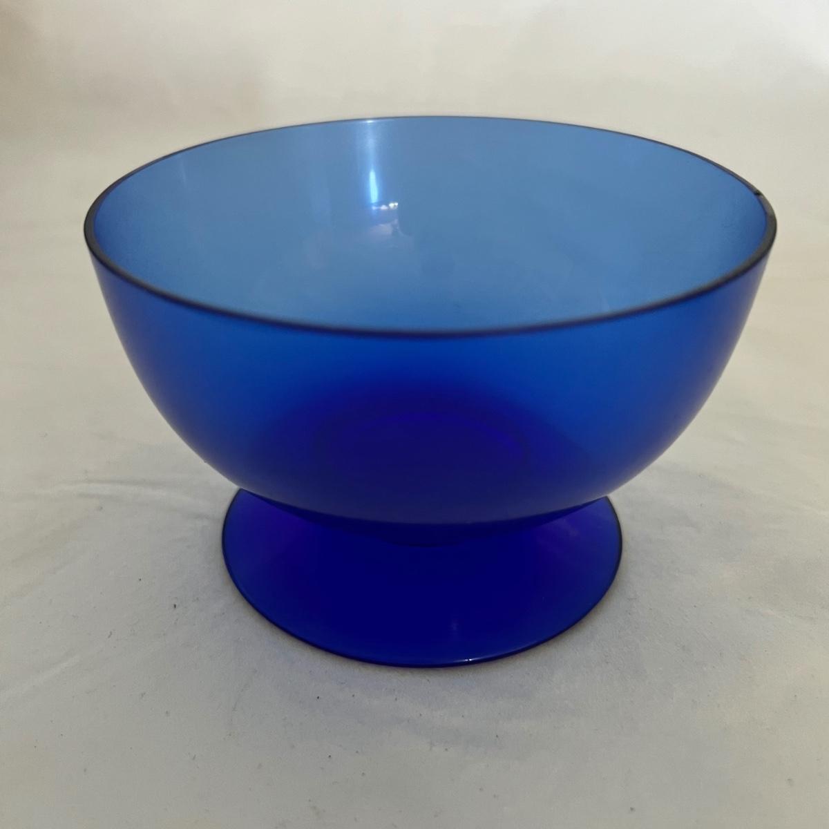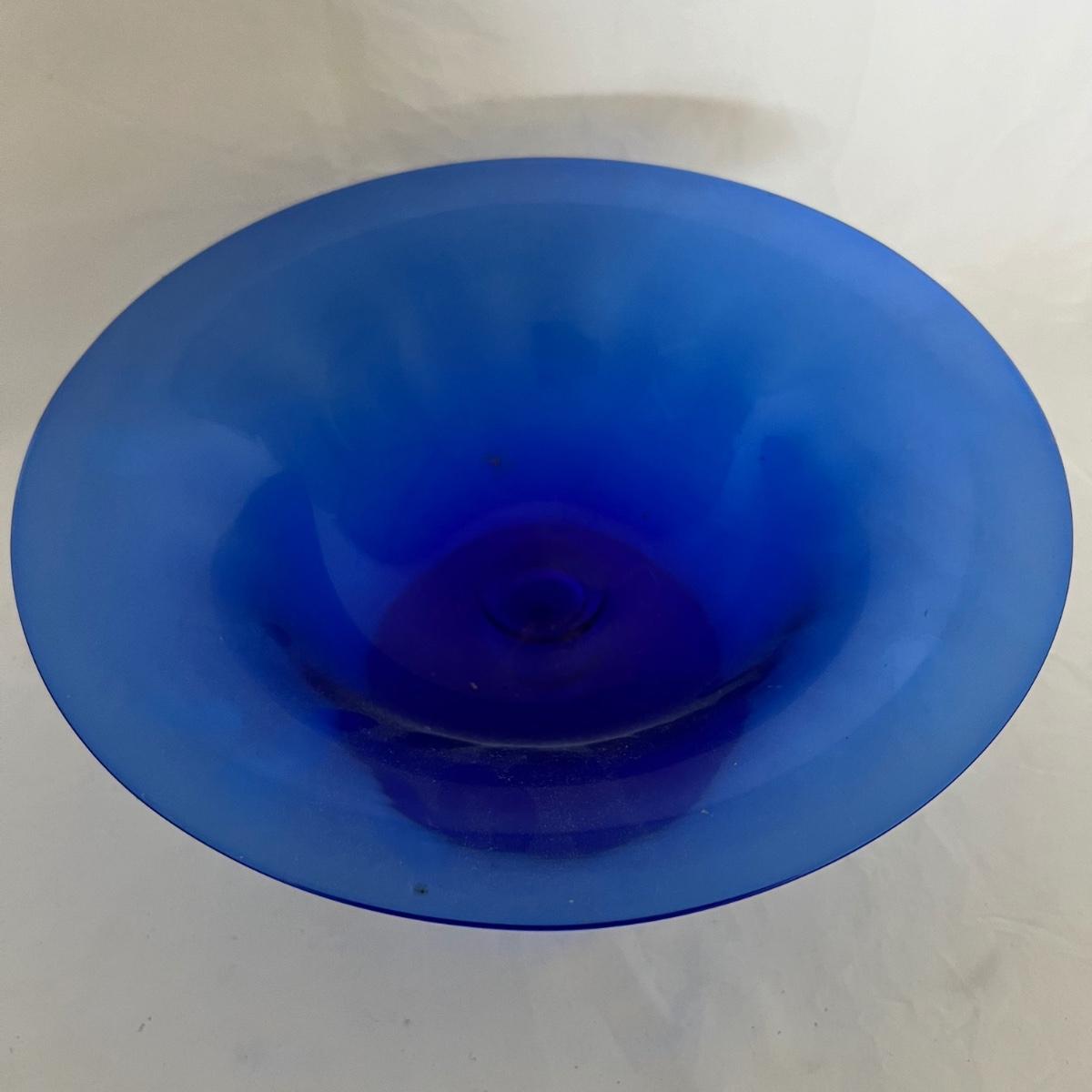 Eleven cobalt blue glasses measure 3”D x 5.5”H. Two glass candlesticks measure 3”D x 4”H. One large serving bowl measures 11.85”D x 5.25”H. Eight dessert, cups, and saucers