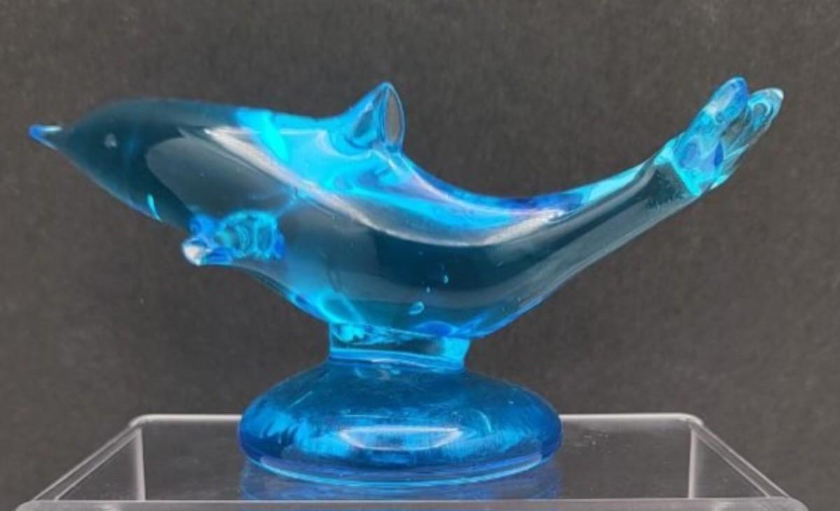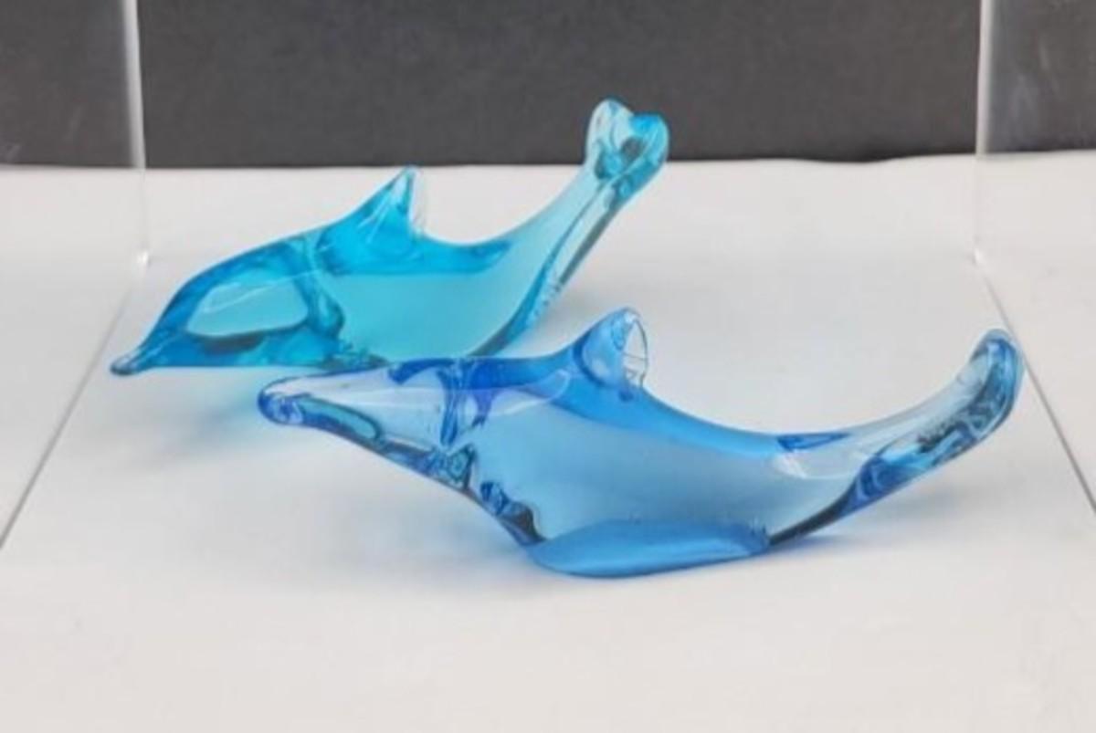 Signed Ron Ray '92 blue glass dolphin, 6" long x 3" tall x 2.5" base. Two smaller glass dolphins (3" x 1") also included. They could be mounted on their own base of your choosing.