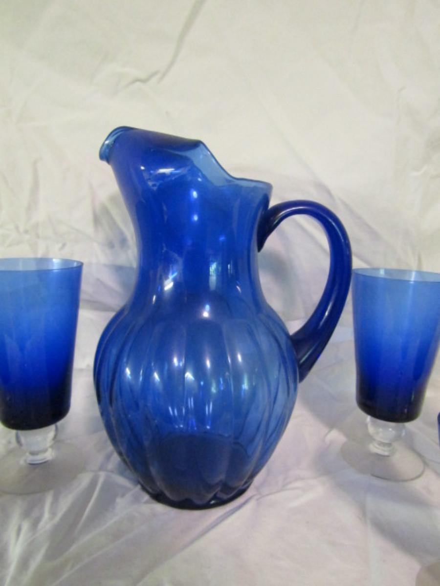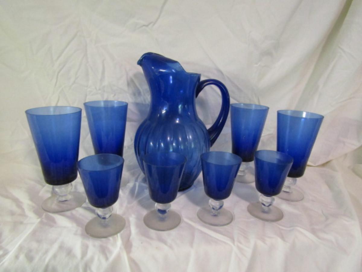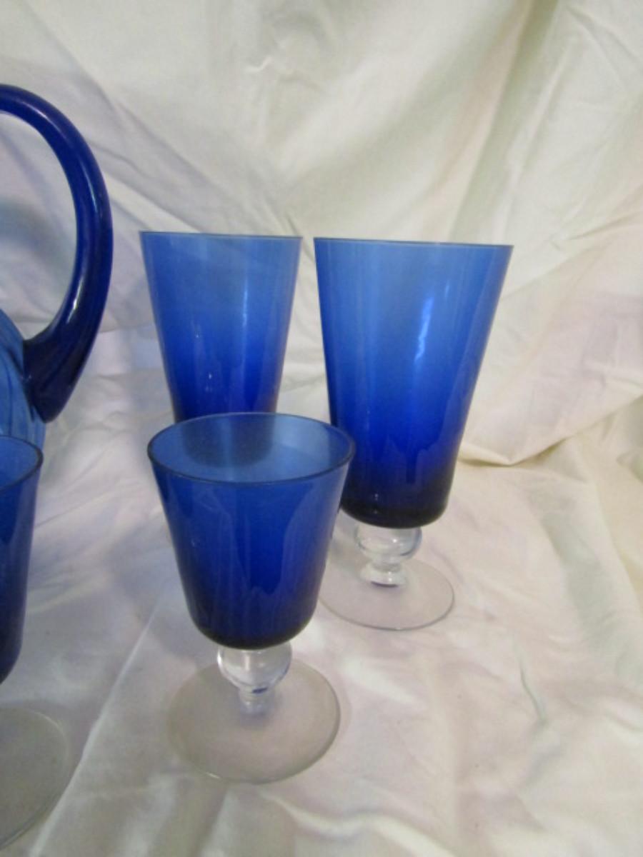 Blue Glass Drinkware Set. Four Tall Footed Glasses, Four Short Footed Glasses, and One Pitcher.