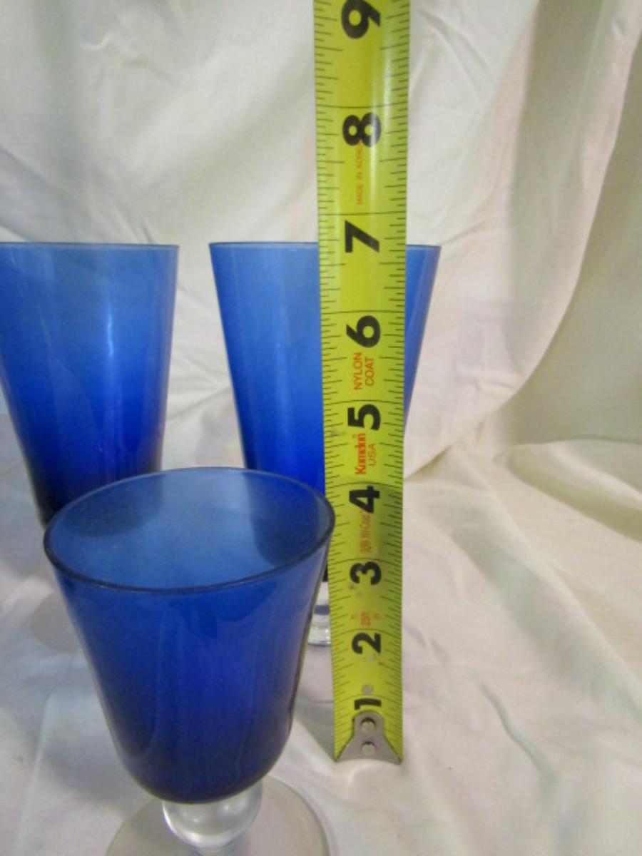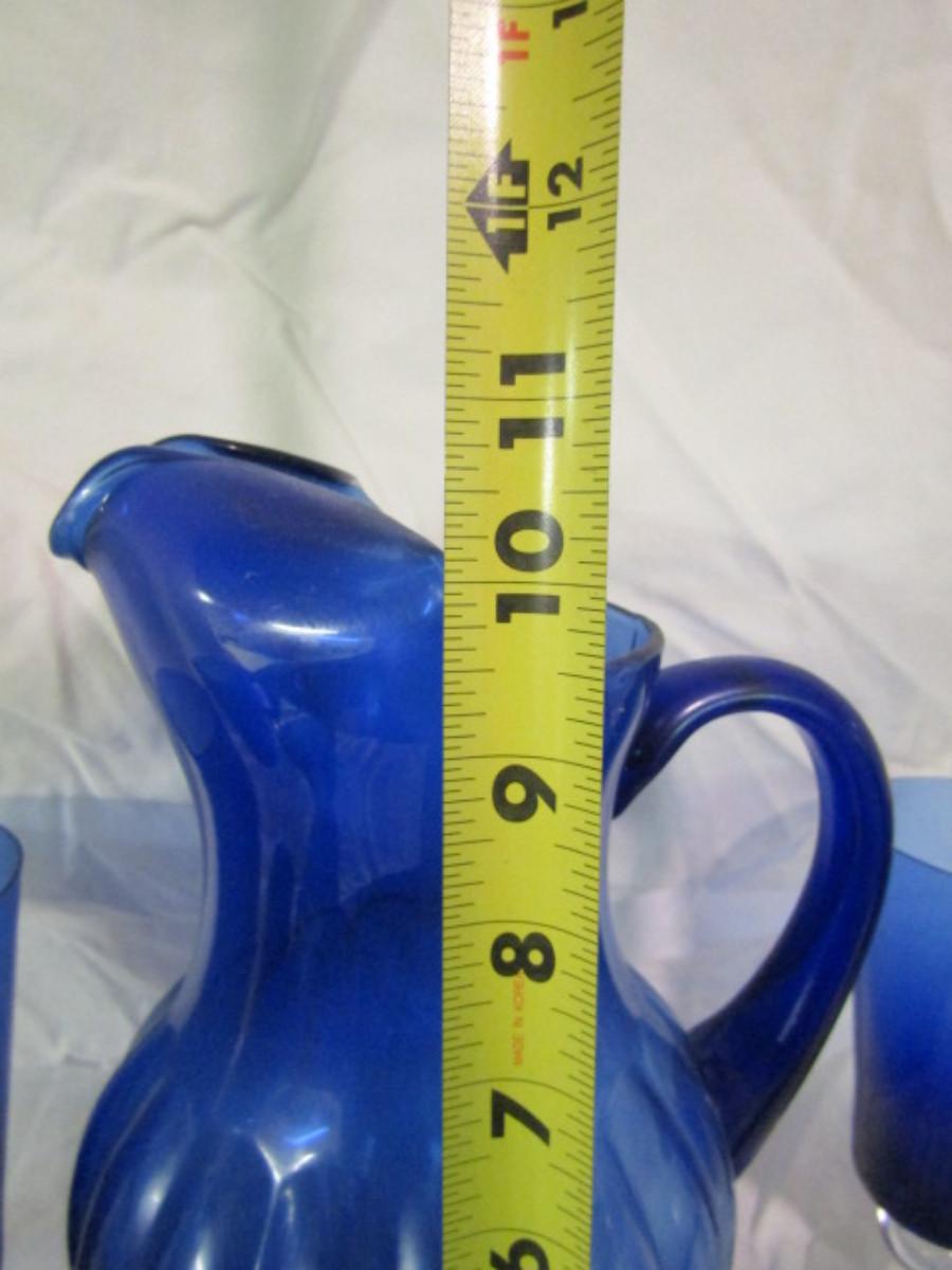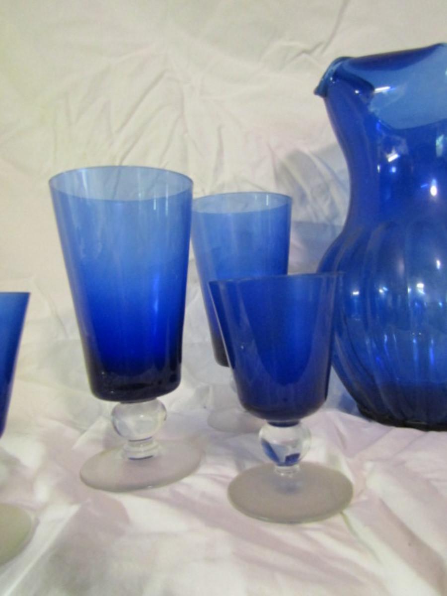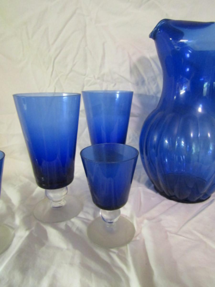 Blue Glass Drinkware Set. Four Tall Footed Glasses, Four Short Footed Glasses, and One Pitcher.