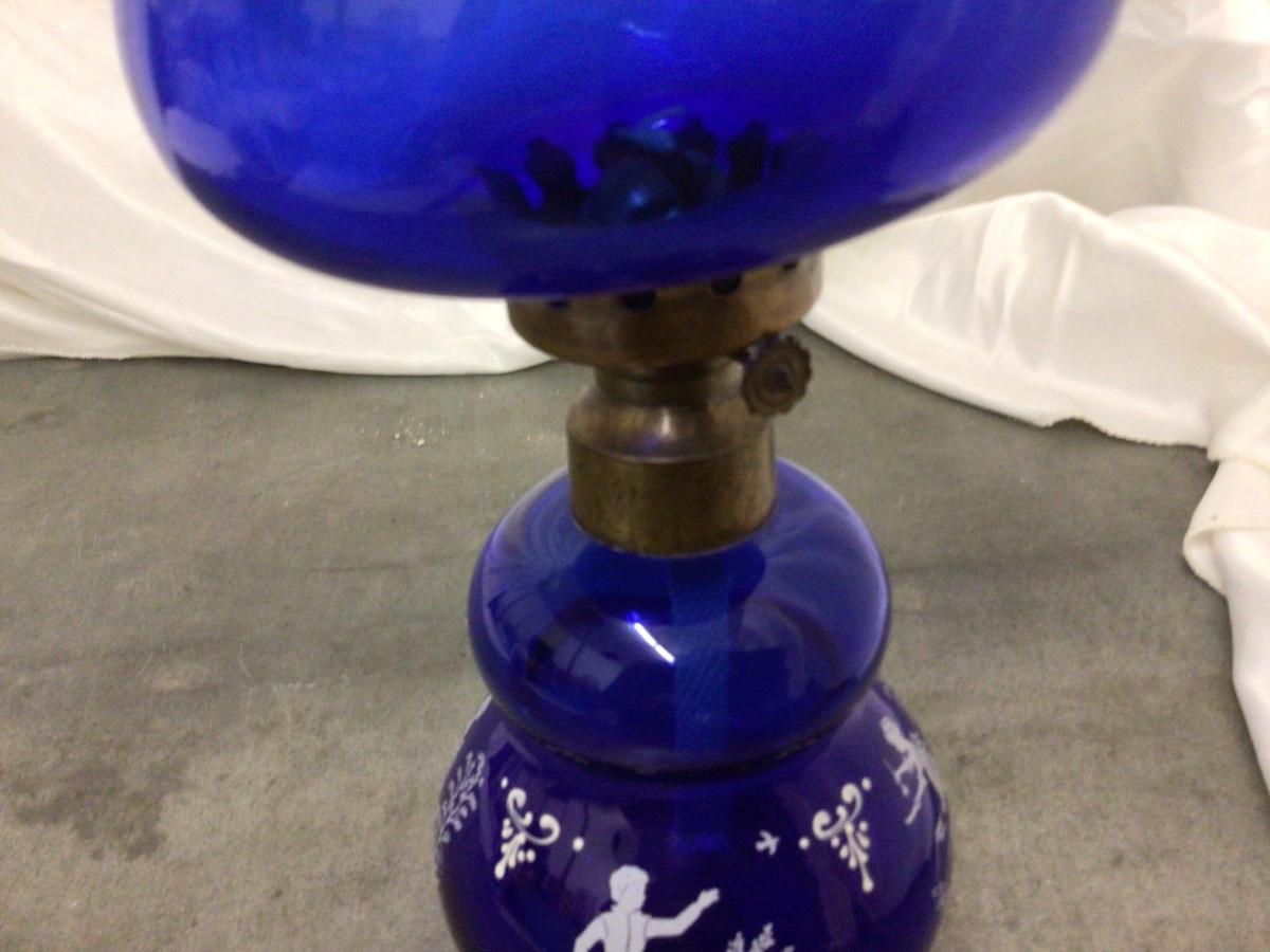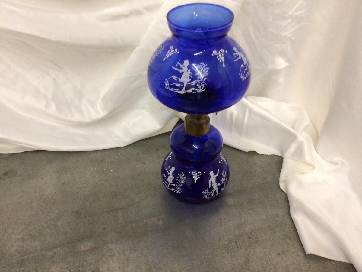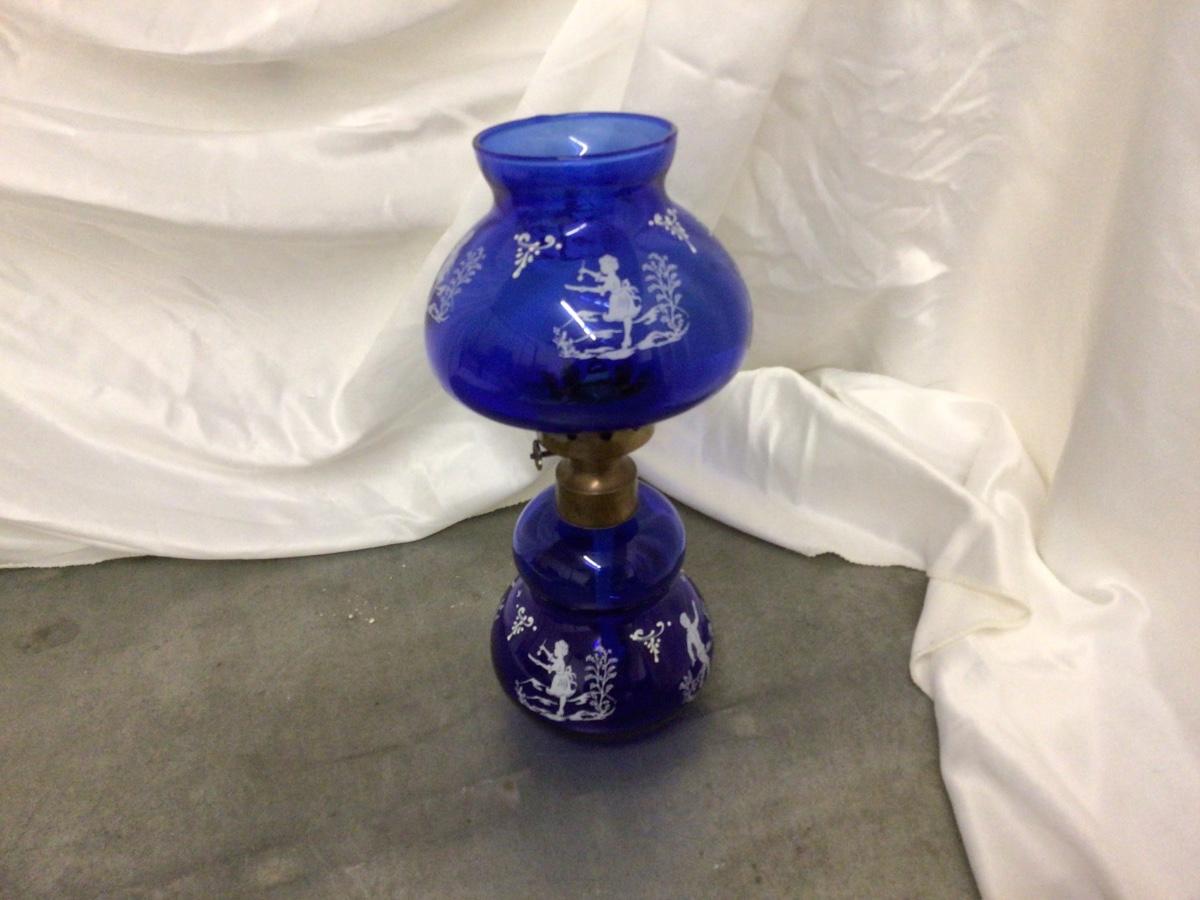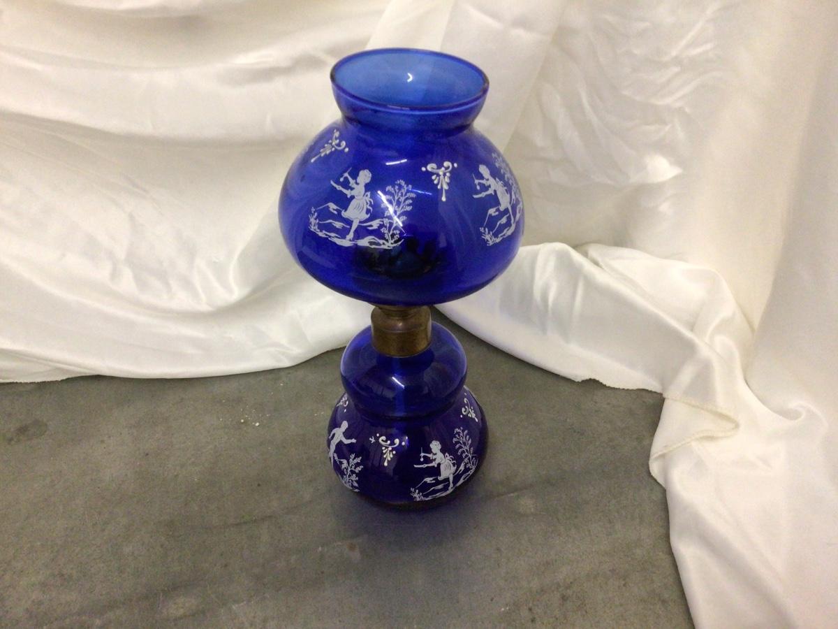 You get a great blue glass oil lamp with white decal fairy’s