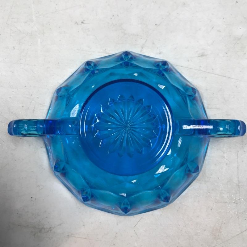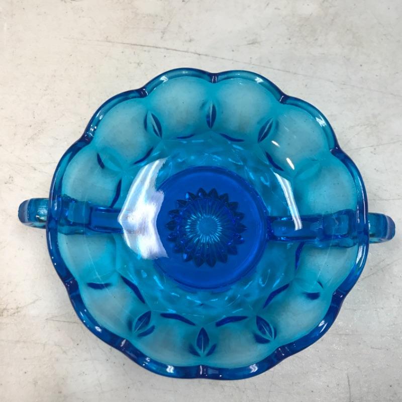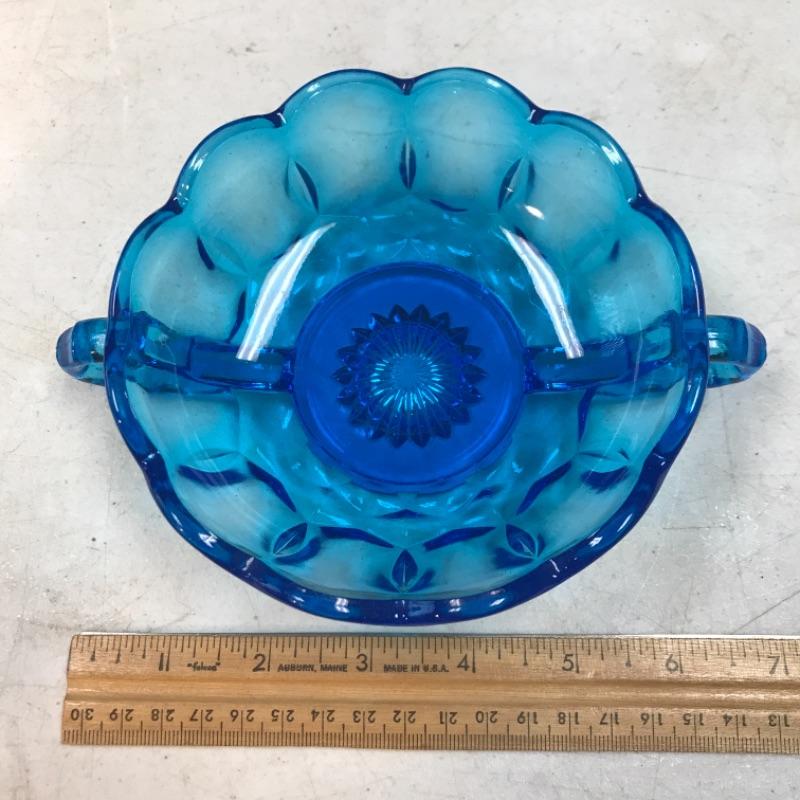 Vintage Anchor Hocking double handle glass bowl. Fairfield blue pressed glass bowl. Great for nuts, candy, or as a trinket dish. About 7" handle to handle.