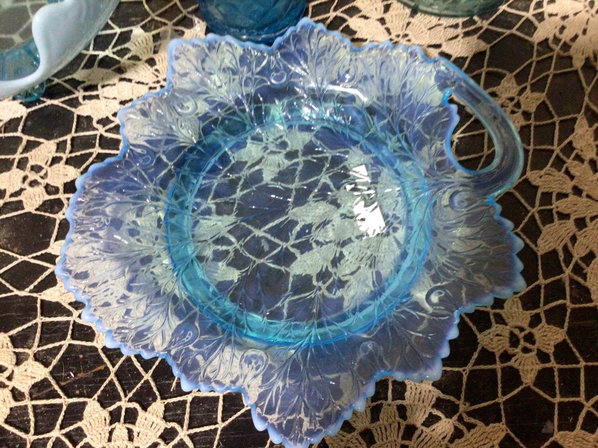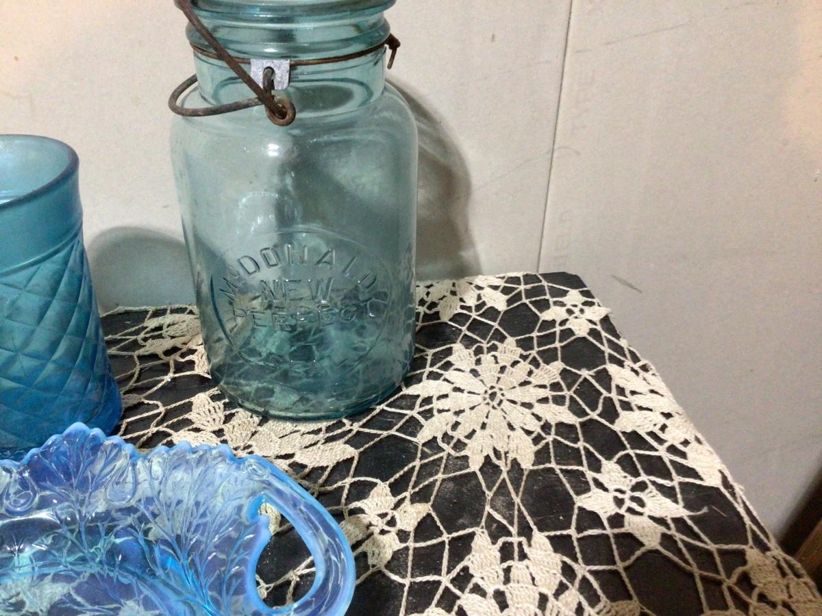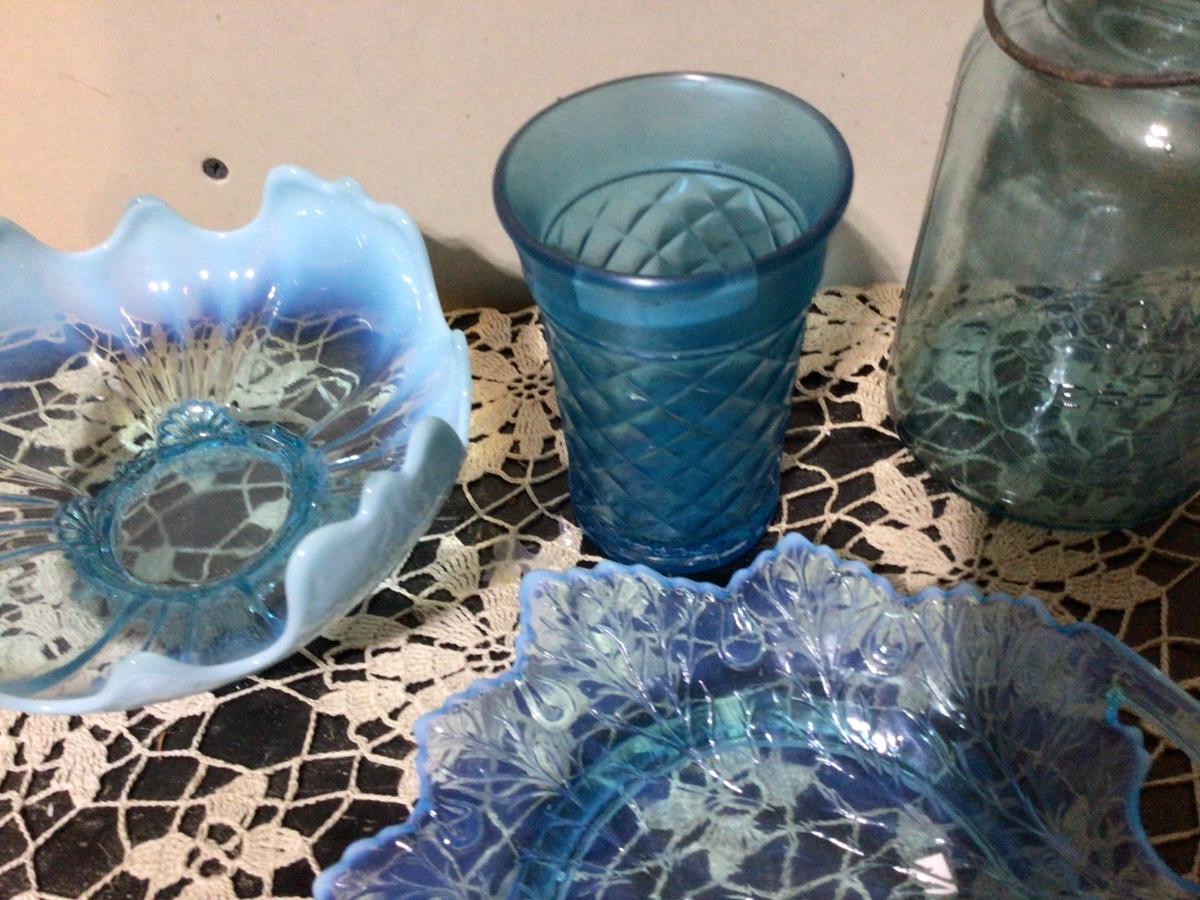 You get McDonald New Perfect Jar, blue lattes drinking glass, leaf tray and nice opalescent bowl. The bowl and leaf tray glow see pics.