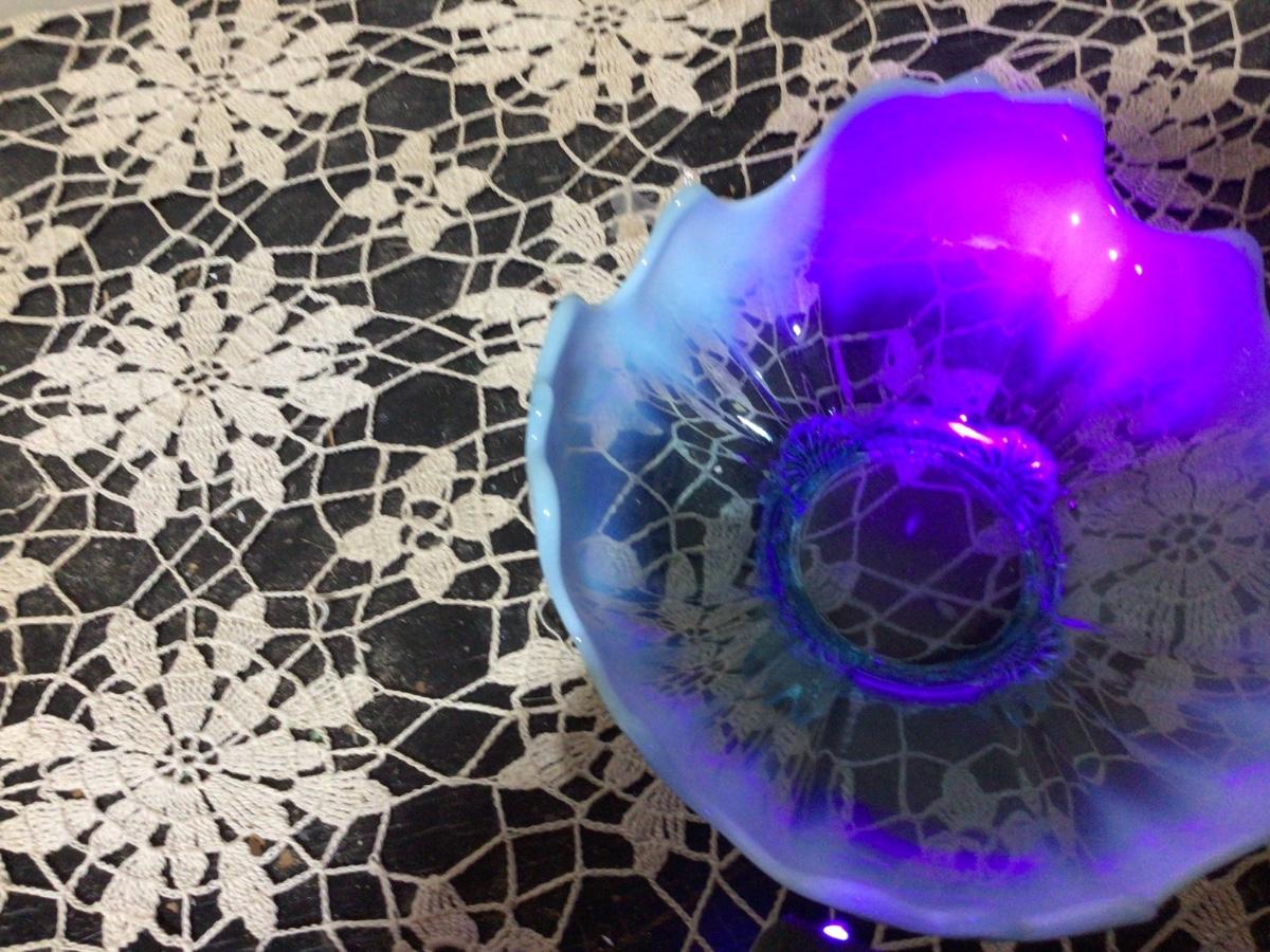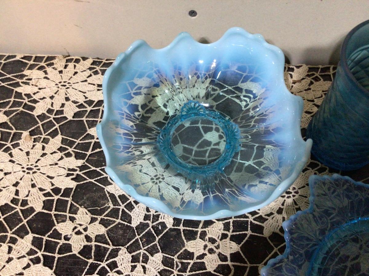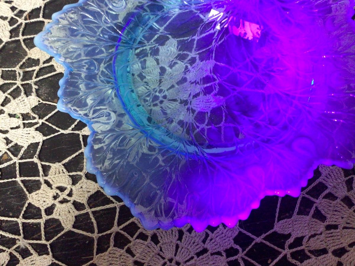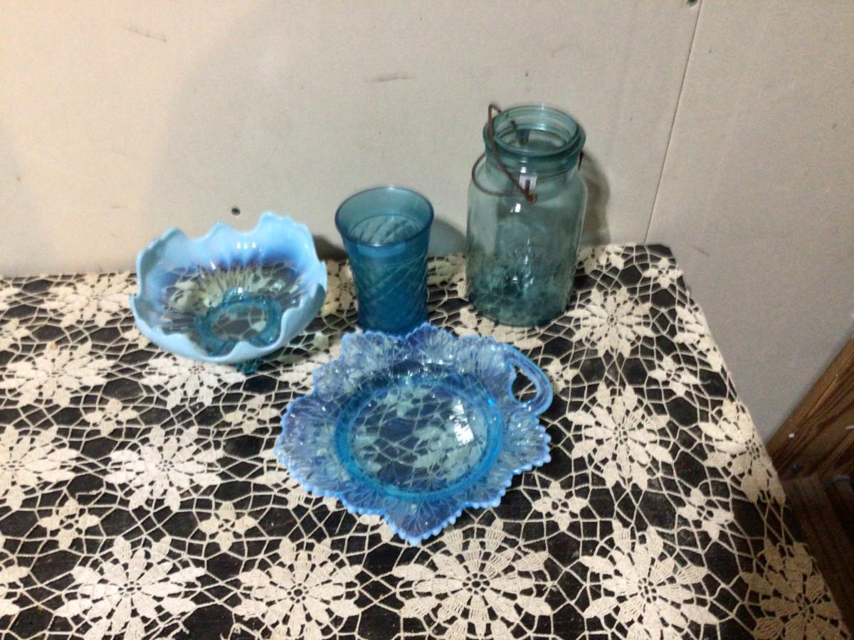 You get McDonald New Perfect Jar, blue lattes drinking glass, leaf tray and nice opalescent bowl. The bowl and leaf tray glow see pics.