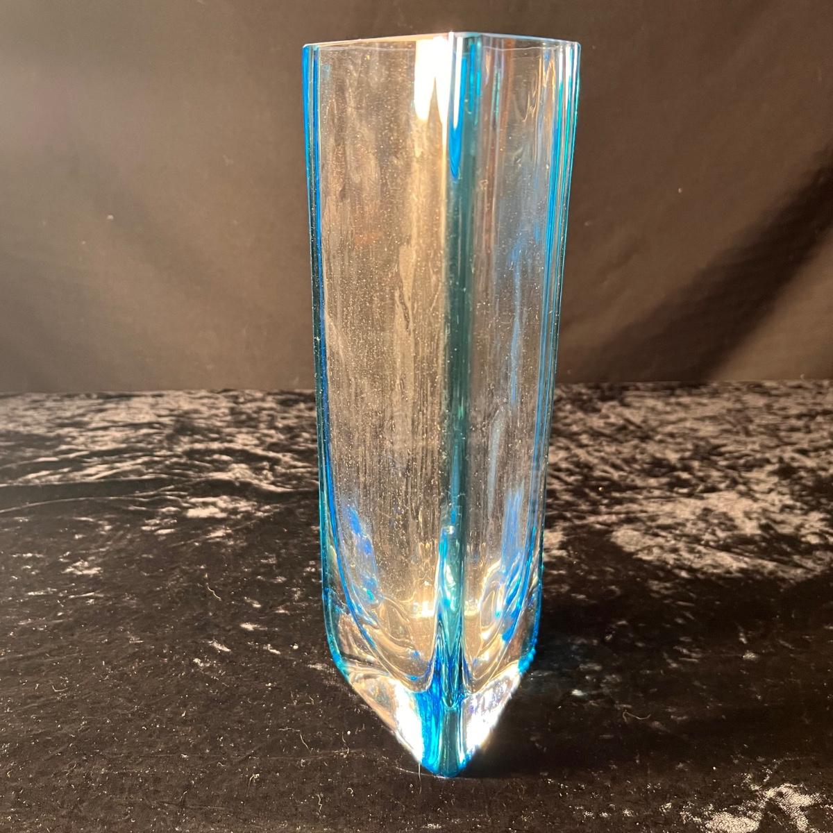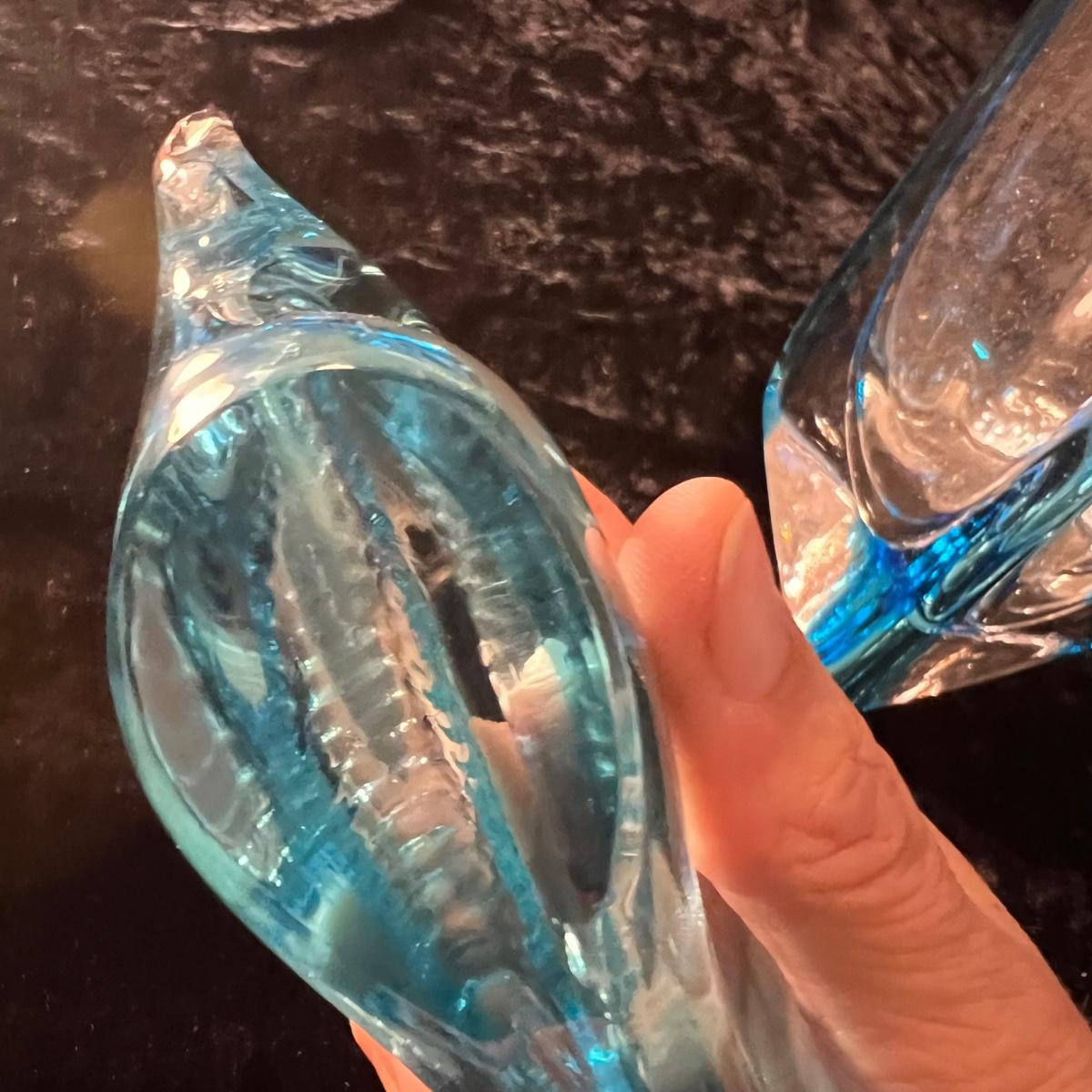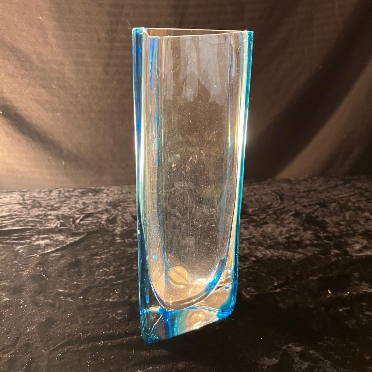 This beautiful glass vase has a triangle shape and blue tints in the glass; it measures 4.5” x 12”H. The glass fish figurine is predominantly blue with clear glass just in a few small areas. No markings found on either item.