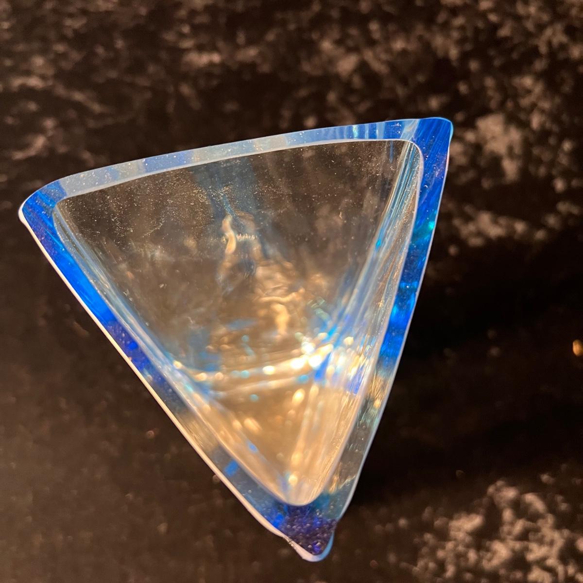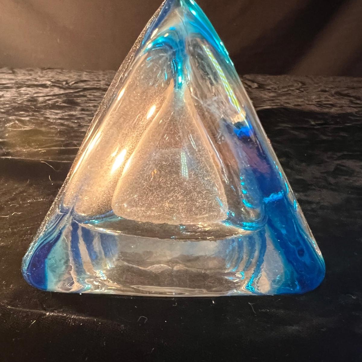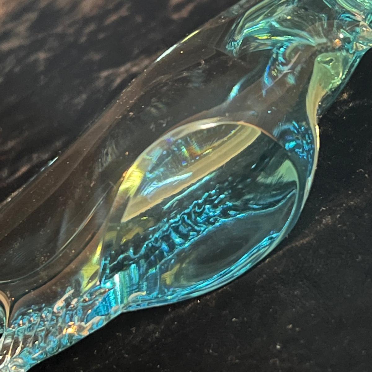 This beautiful glass vase has a triangle shape and blue tints in the glass; it measures 4.5” x 12”H. The glass fish figurine is predominantly blue with clear glass just in a few small areas. No markings found on either item.