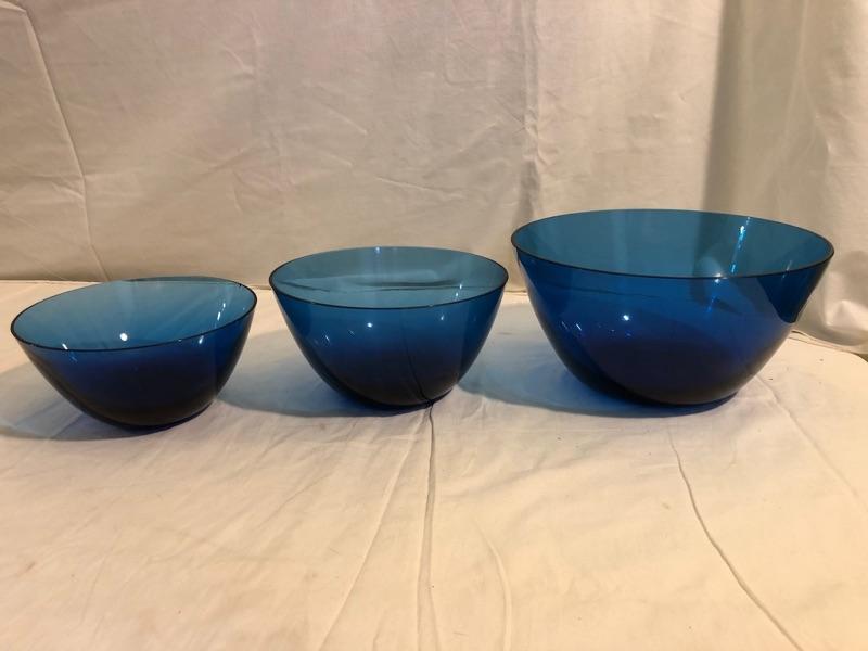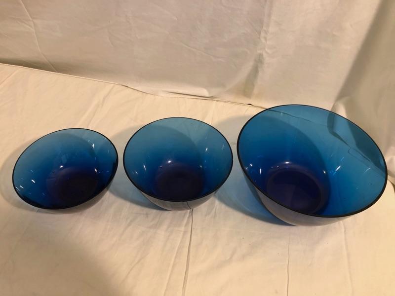Set of 3 blue glass nesting bowls vintage late 60’s early 70’s large is 10in diameter x 5in tall, medium is 7.5 diameter and 4in tall and small is 7in diameter and 3.5 in tall