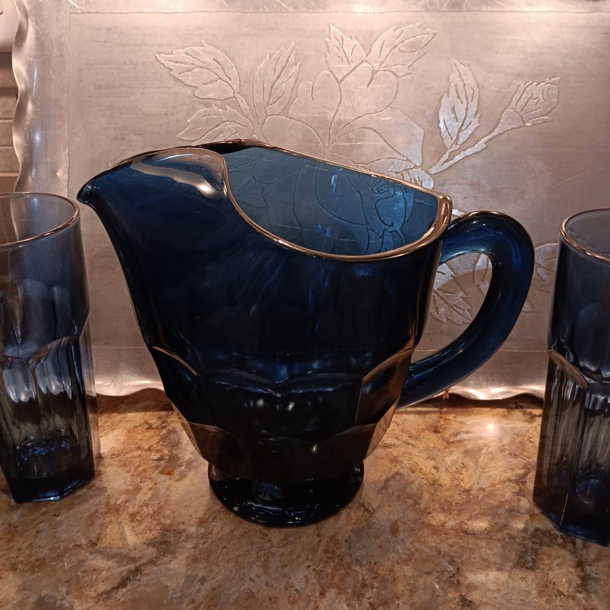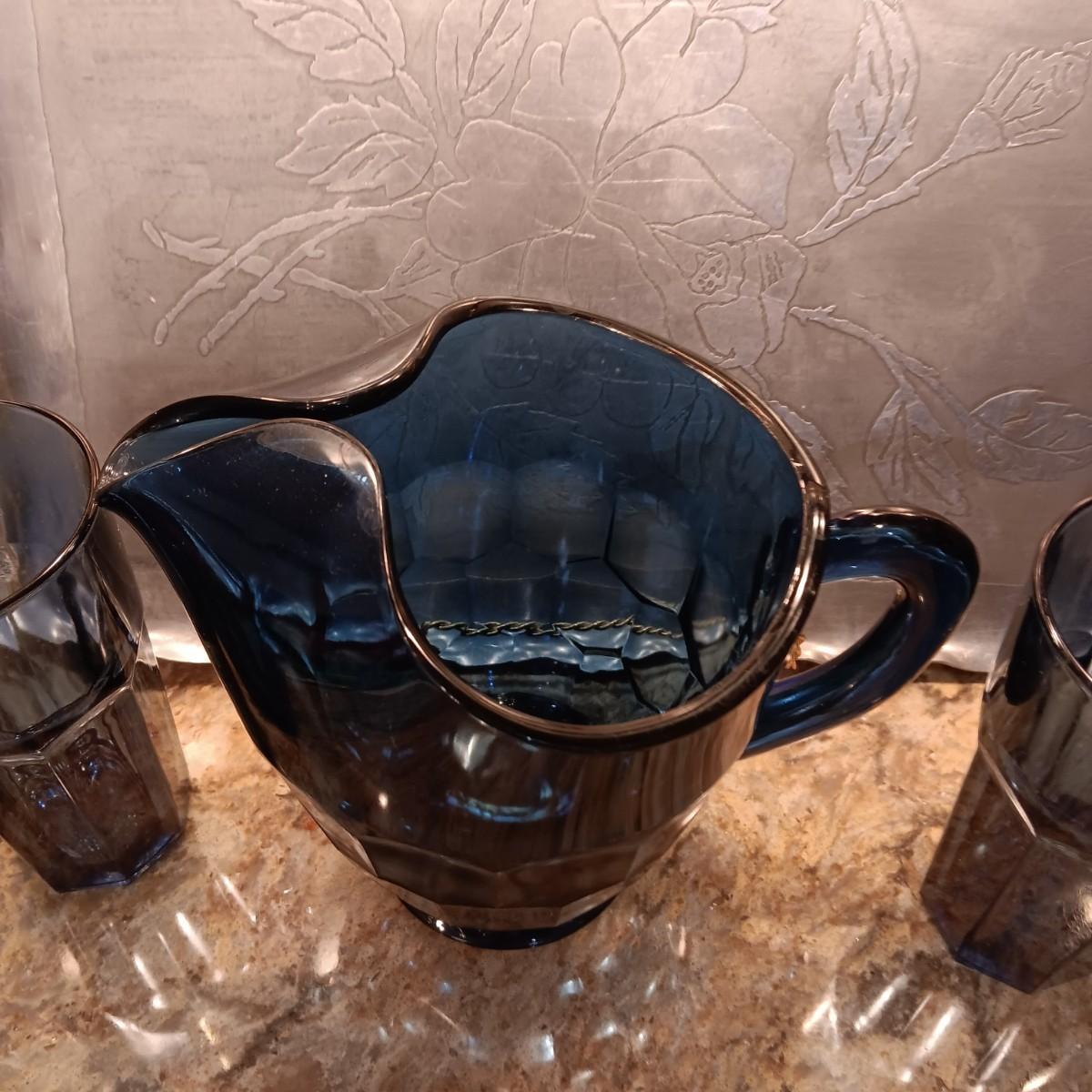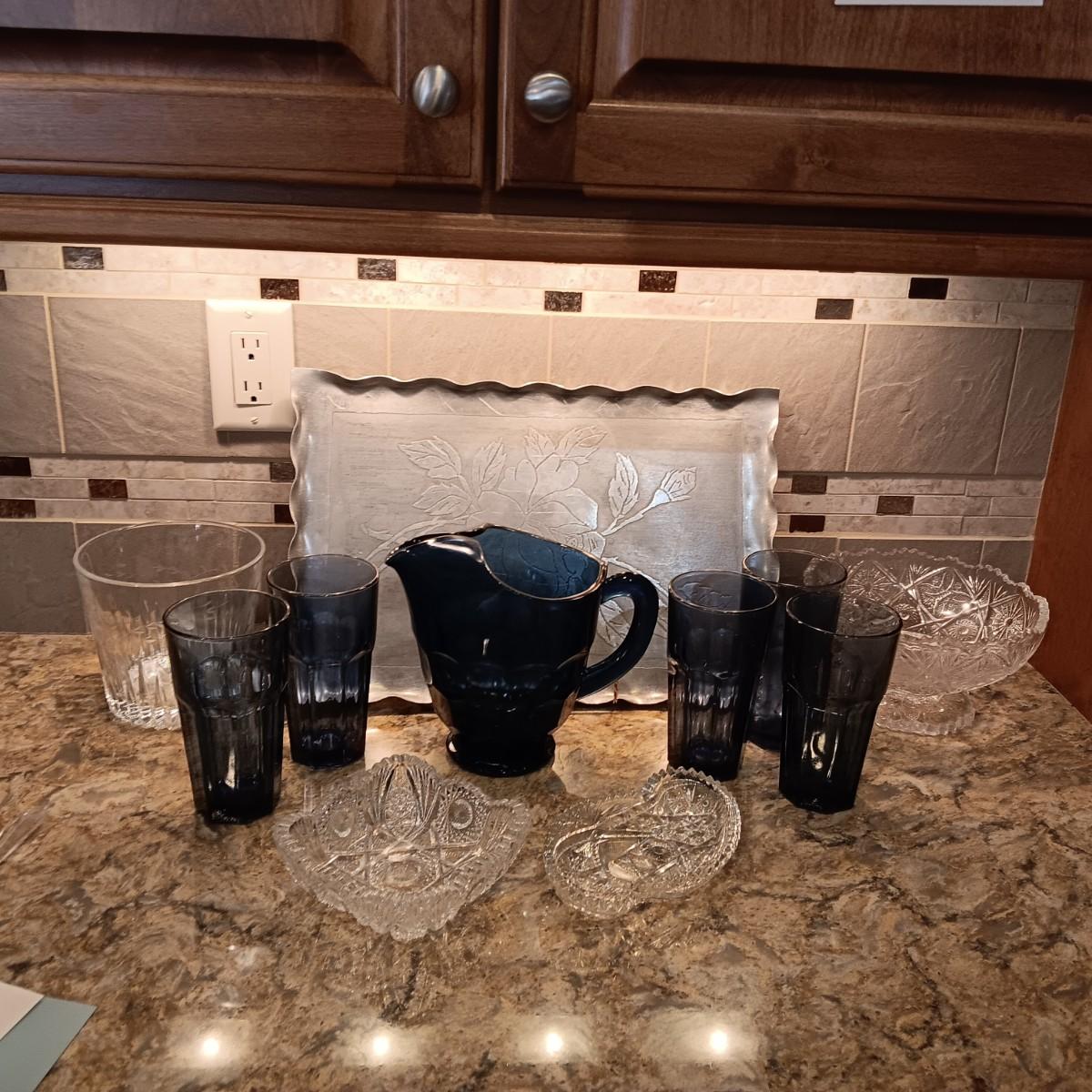 BLUE GLASS PITCHER AND 5 GLASSES, SERVING DISHES AND MORE