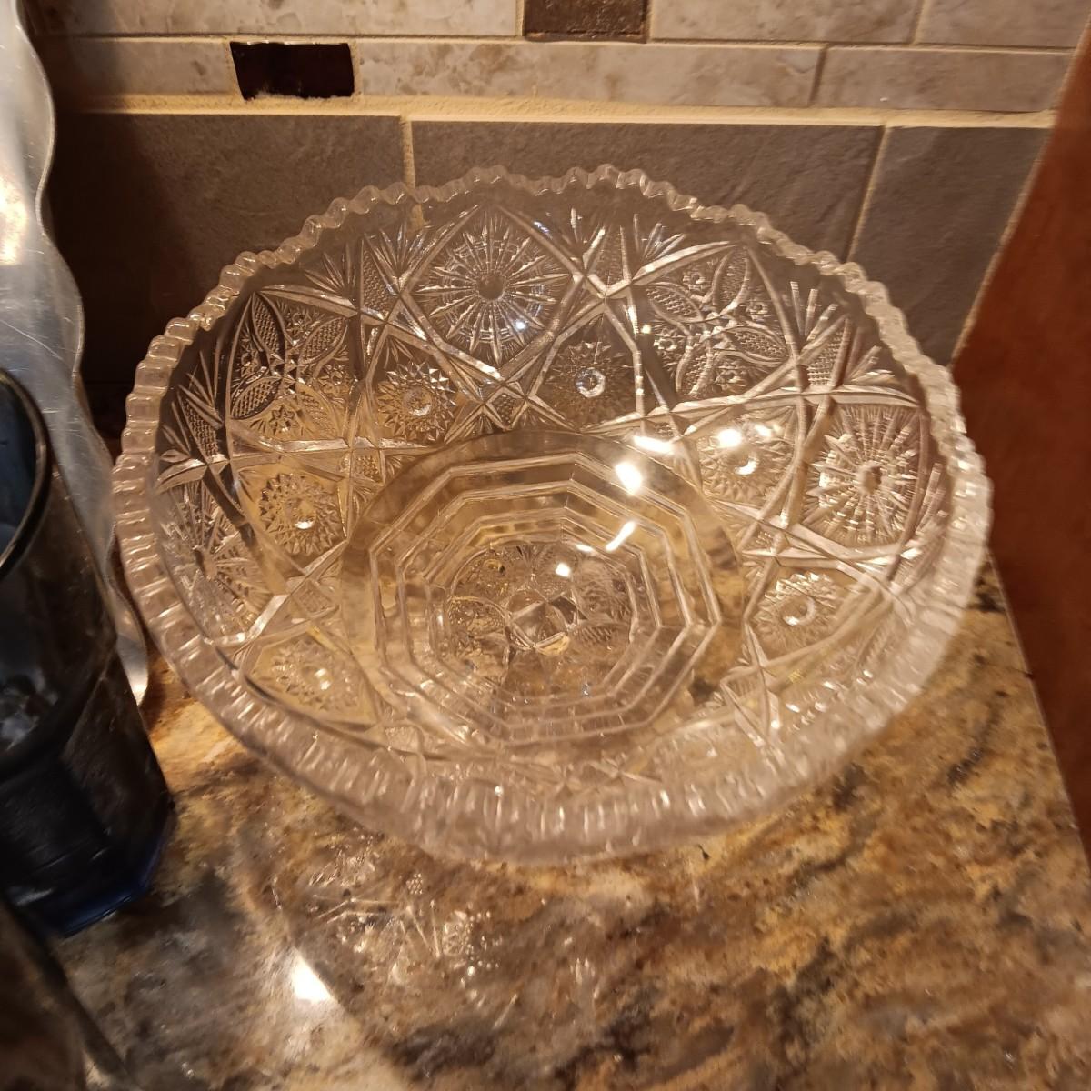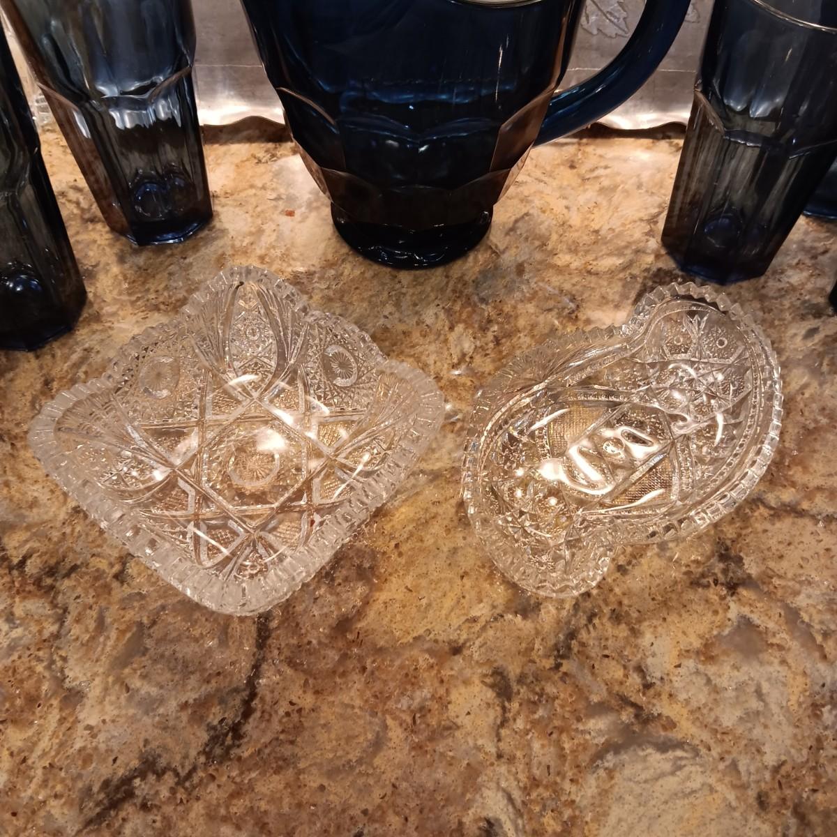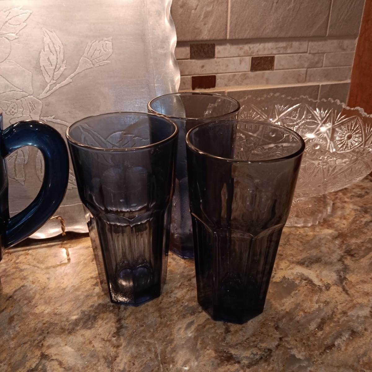 BLUE GLASS PITCHER AND 5 GLASSES, SERVING DISHES AND MORE