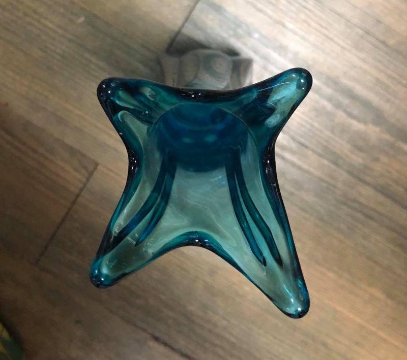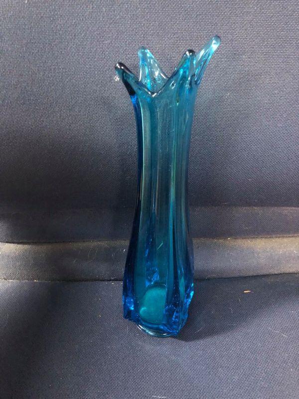 This is possibly Dugan Transparent Blue Glass Vase with a Jagged Flame Top. (Not completely sure it's a Dugan.) 12-in. tall, 3 1/4 in. across top.