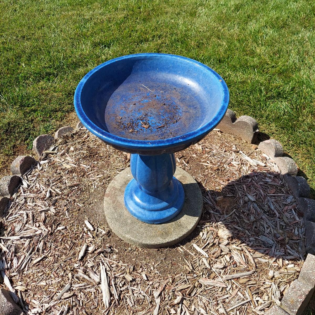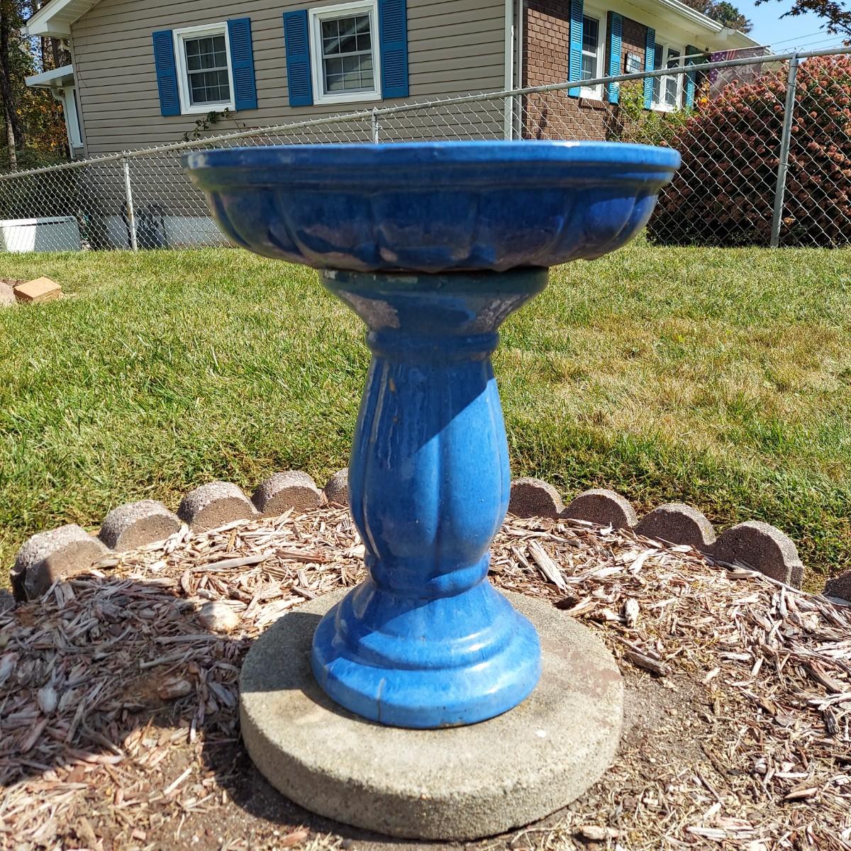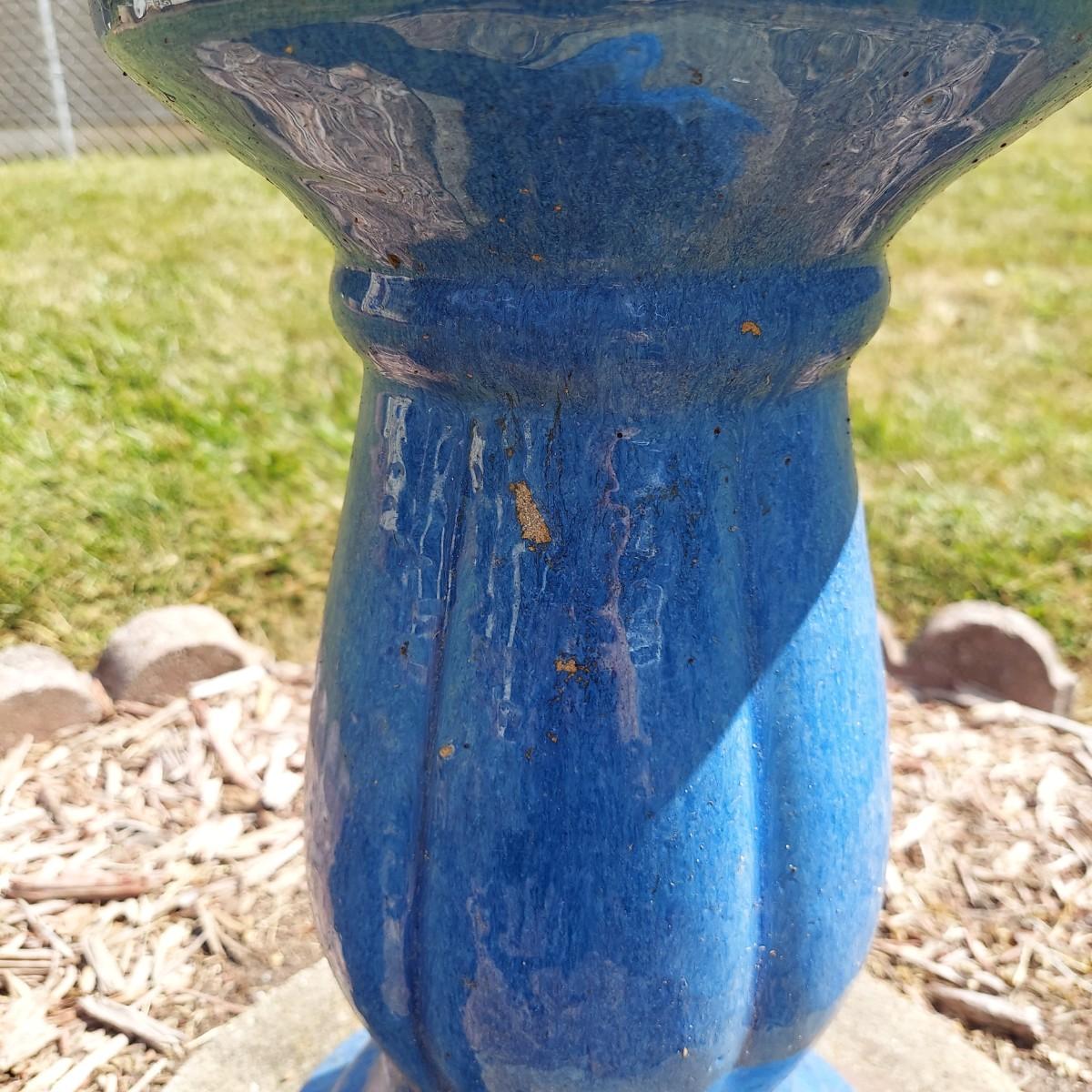 Ceramic bird bath with blue glaze. It measures 18" across the bowl and is 21"H. Comes apart into two pieces, the bowl and the base. Sitting on a cement paver. Local Pickup Only.
