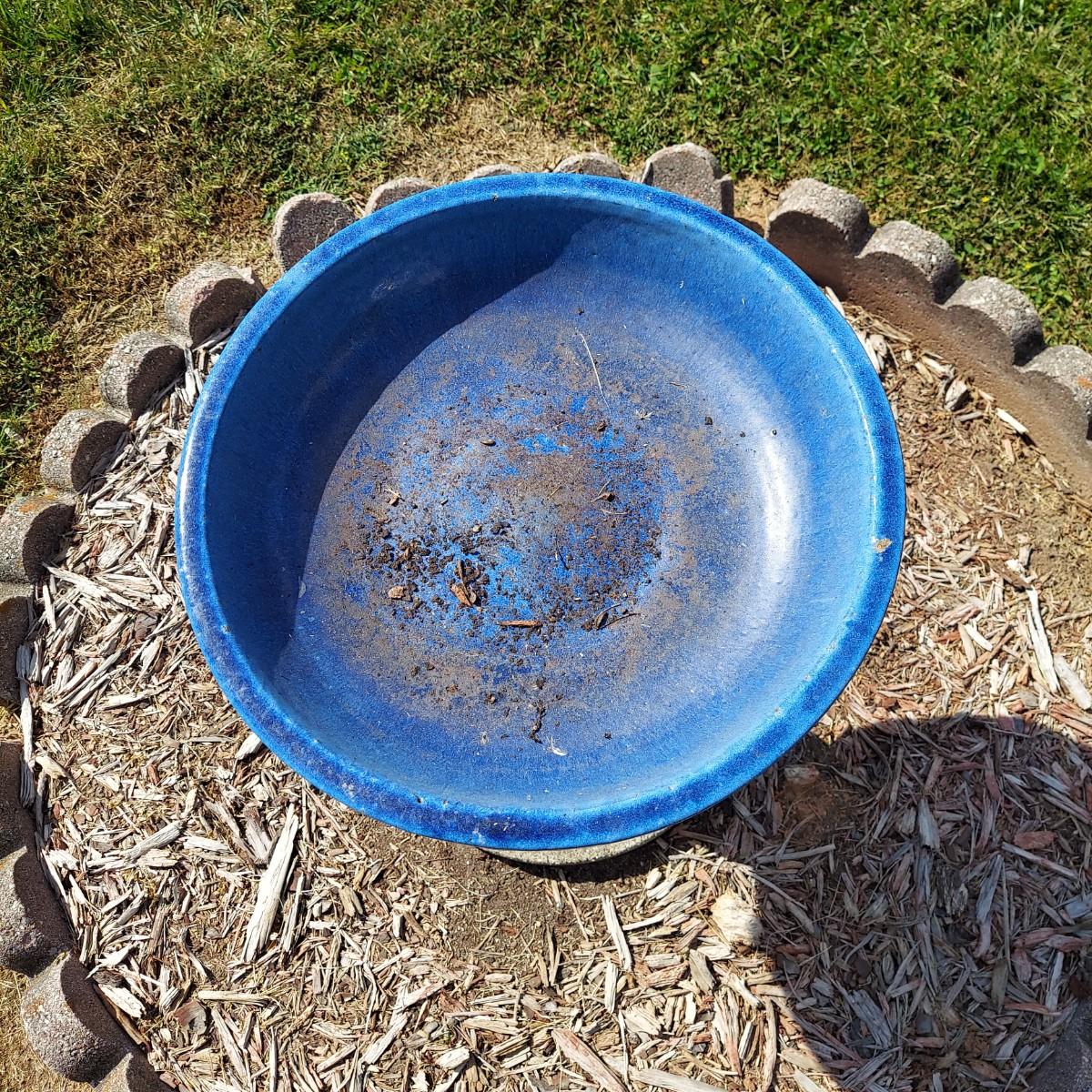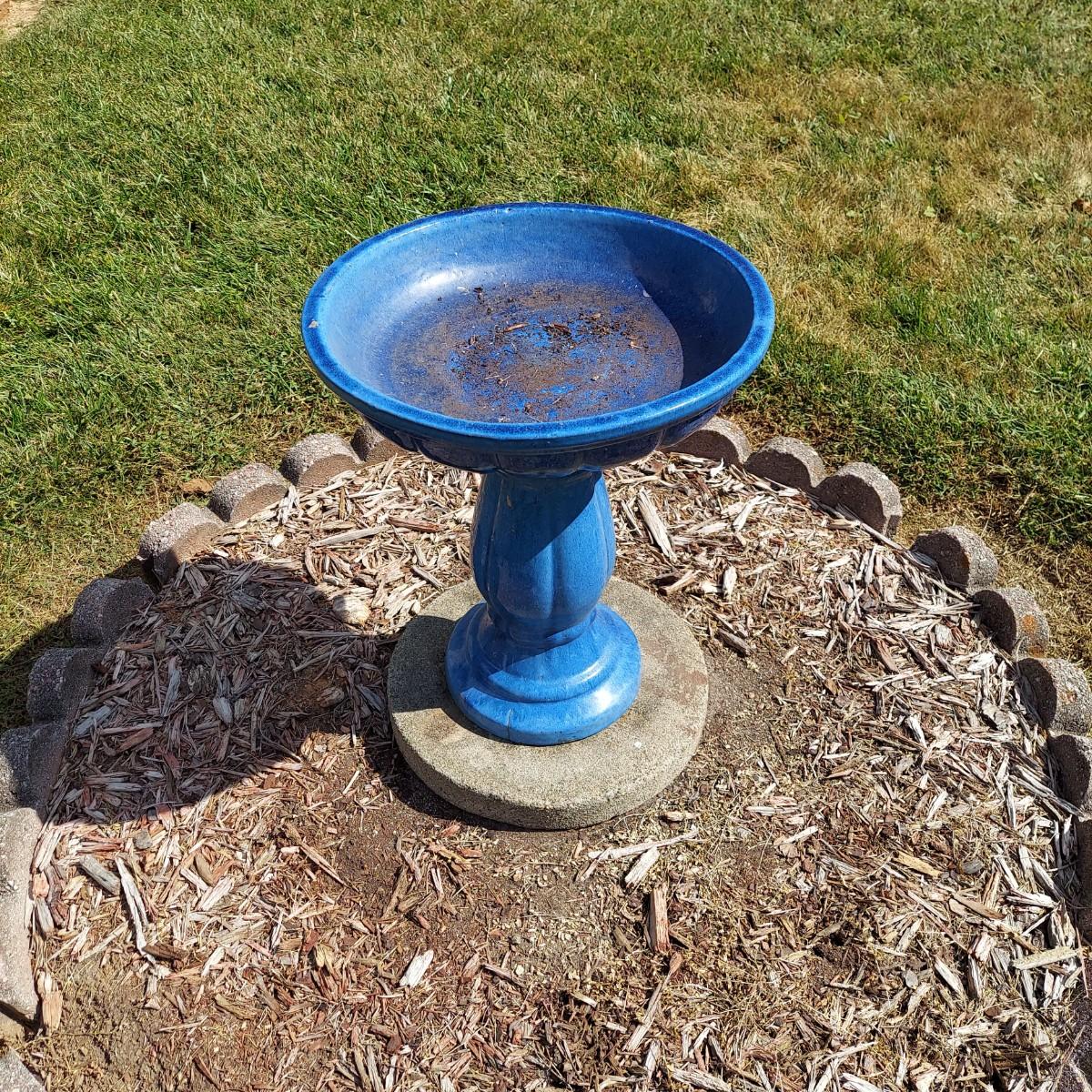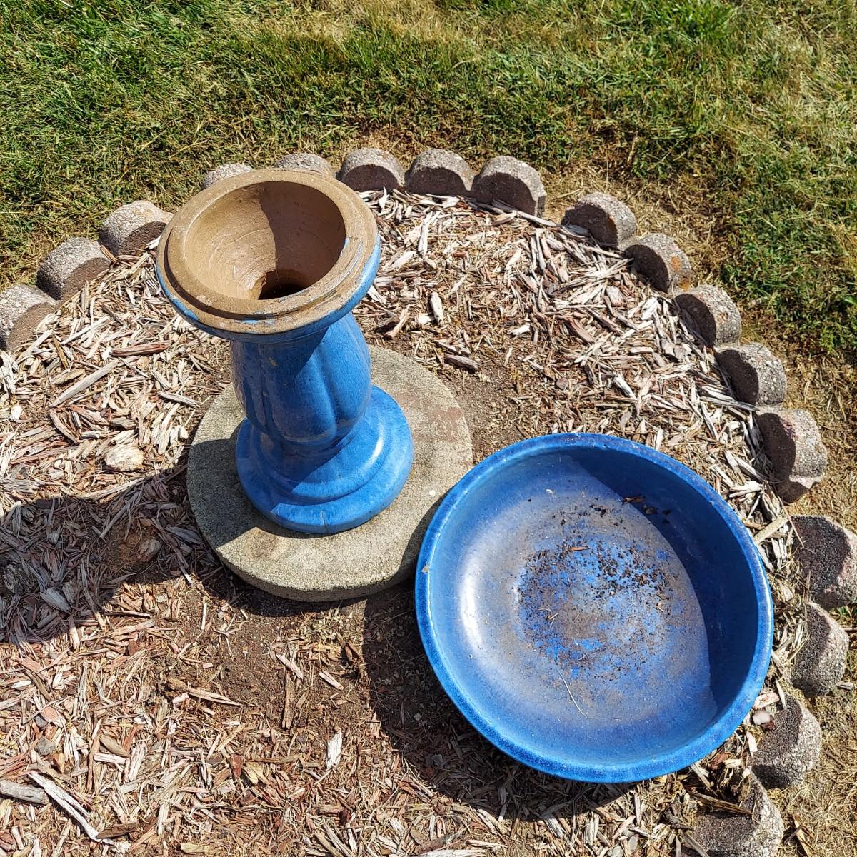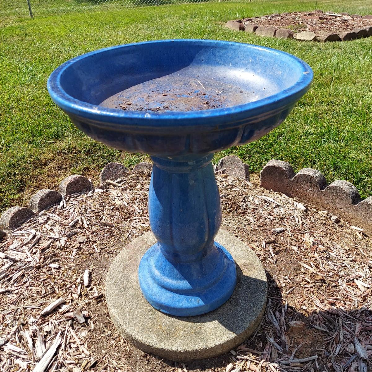 Ceramic bird bath with blue glaze. It measures 18" across the bowl and is 21"H. Comes apart into two pieces, the bowl and the base. Sitting on a cement paver. Local Pickup Only.