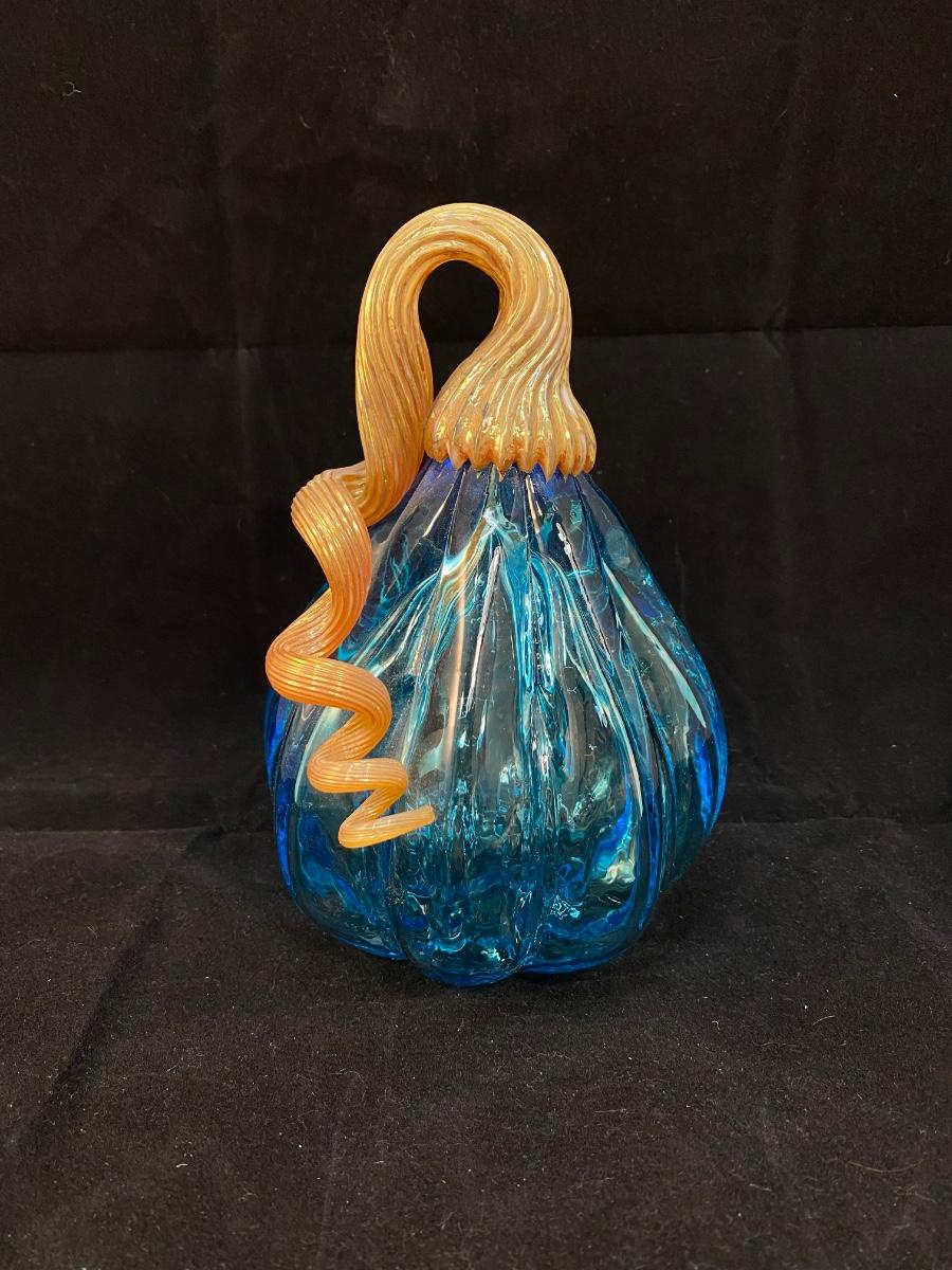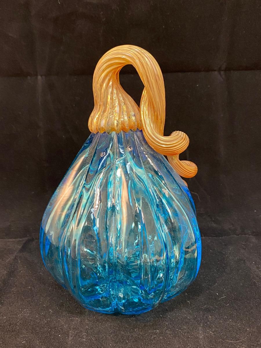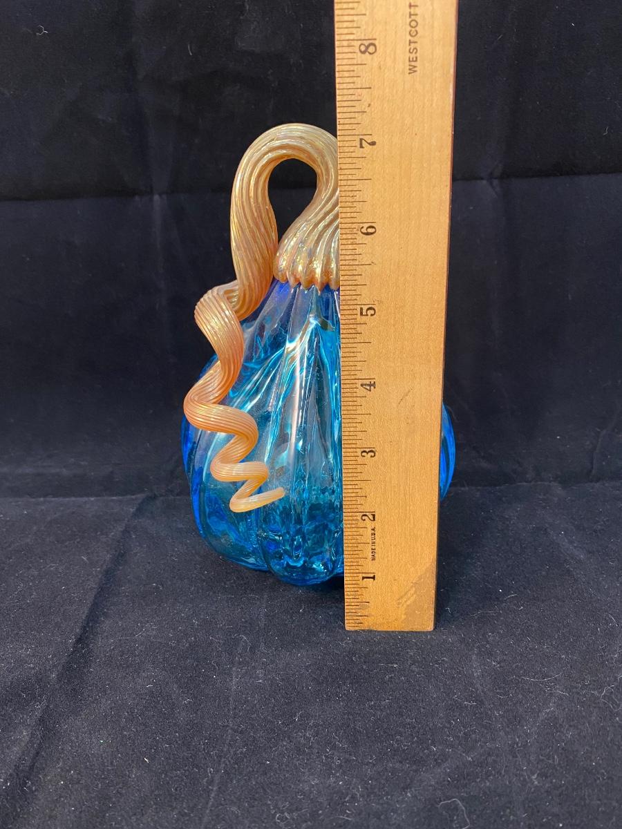 Blue & Gold Blown Art Glass Pumpkin Gourd Paperweight Figurine. In good condition, no chips. About 7" tall. Displays nicely. Unsigned.