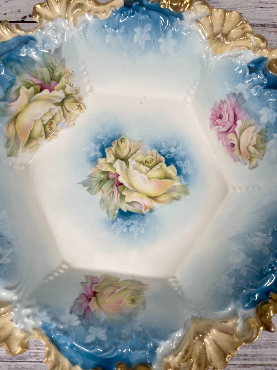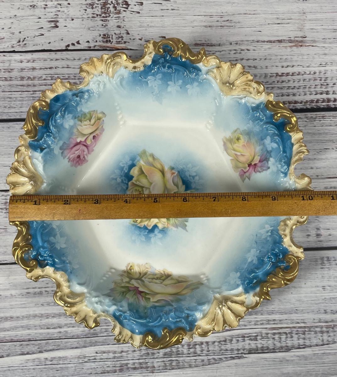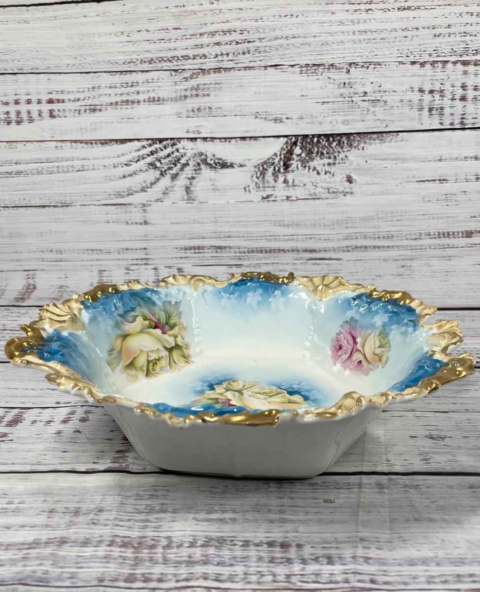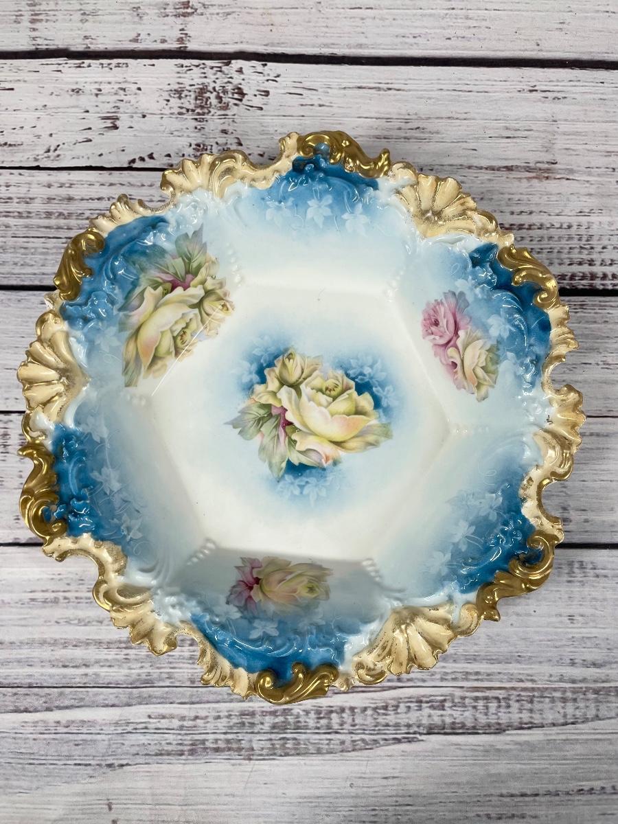 Antique Ruffled Edge Porcelain Blue & Gold Floral Bowl