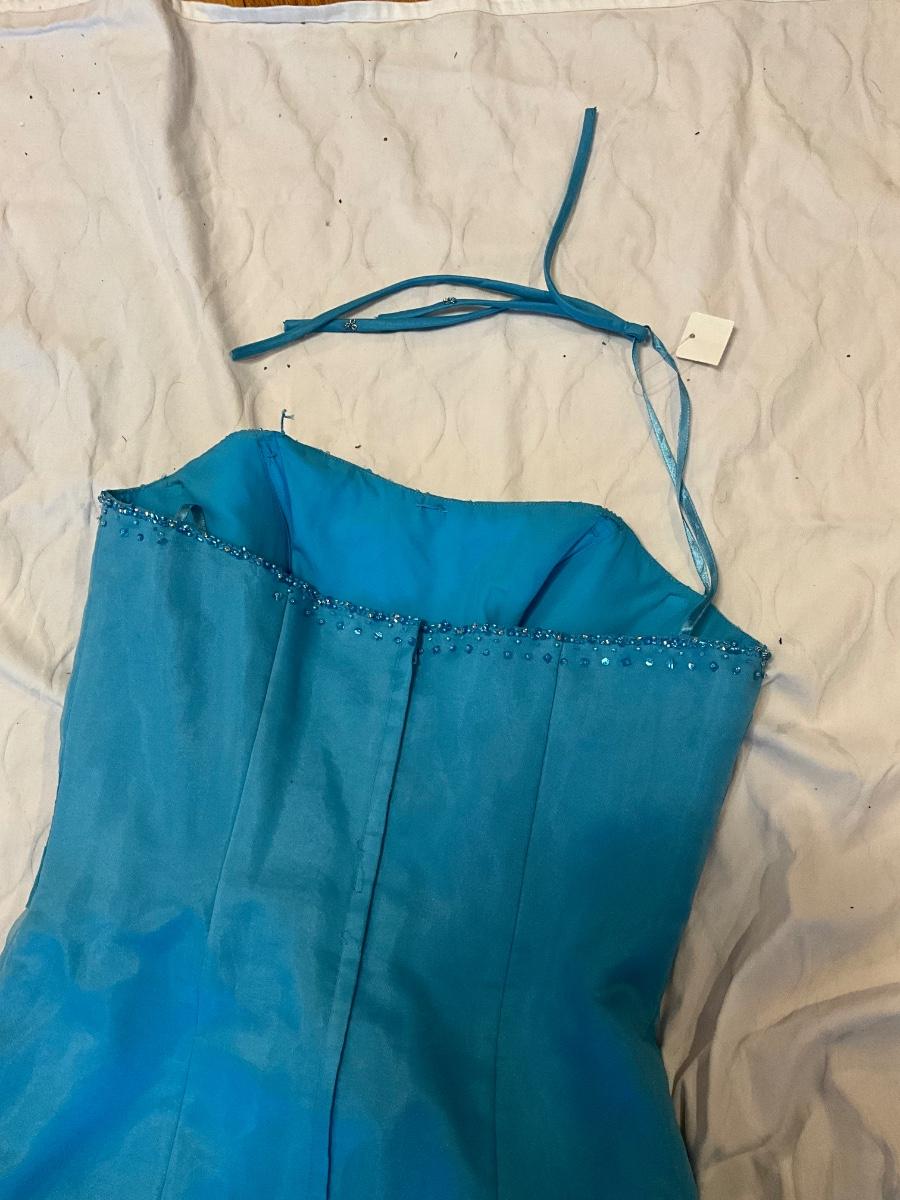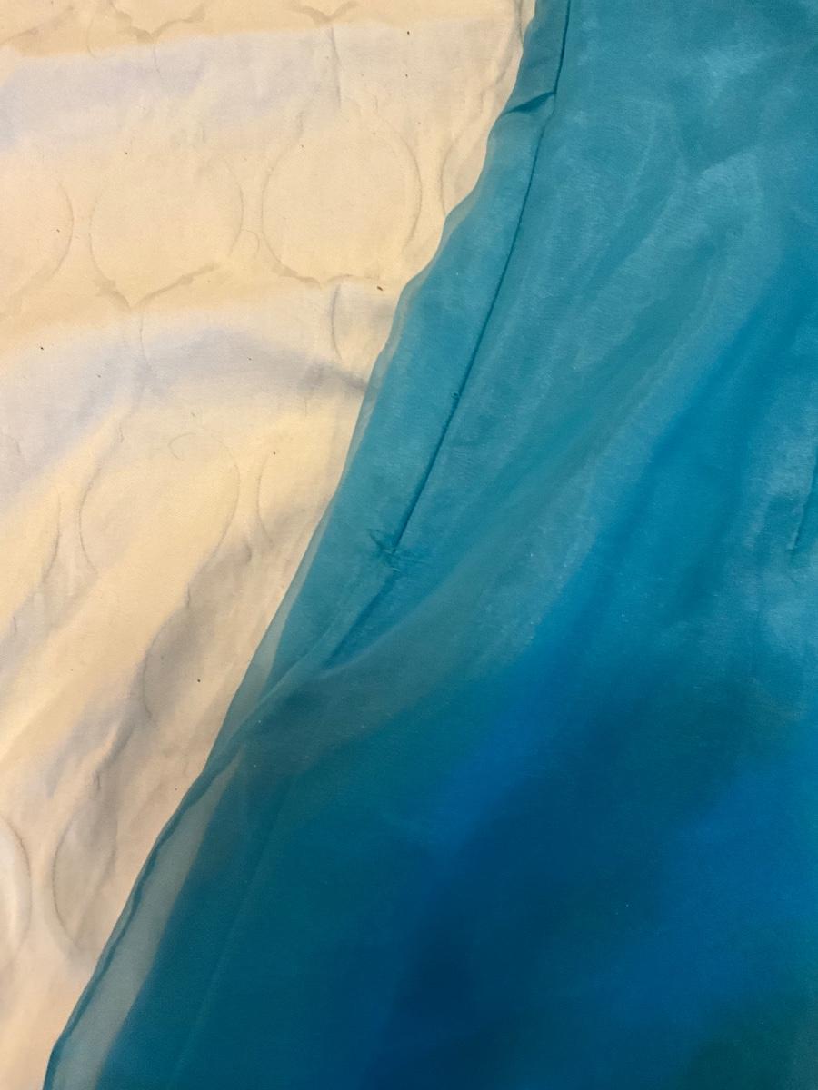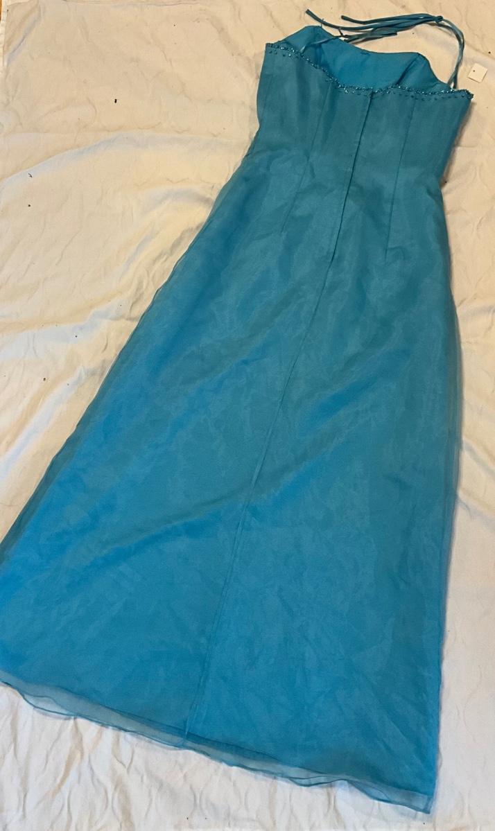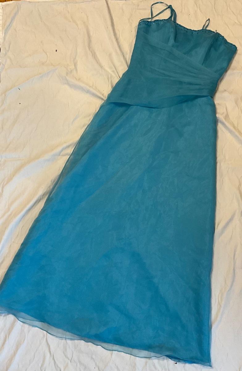 Size 14 formal gown. The straps need to be repaired, there is a hole on the side of the outer tulle.